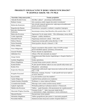 PROJEKTY EDUKACYJNE W ROKU SZKOLNYM 2016/2017 W ZESPOLE SZKÓŁ NR 1 W PILE Nazwisko i imię nauczyciela Tematy projektów Adaszak-Kontek Iwona Jak dbać o płuca? – prezentacja multimedialna. Bednarz Joanna Jak za pomocą sztuki origami dowodzić twierdzenia? Bielawska Katarzyna Jak sylwetki znanych sportowców wpływają na kształtowanie postaw prozdrowotnych? Bogusławska Danuta Koleżeństwo i przyjaźń z osobami z zespołem Aspergera. Brzyszko-Olechnowicz Katarzyna Inscenizacja wierszy Jana Brzechwy dla uczniów klas 1-3 SP. Bukowska Krystyna Zapraszam Cię do mojej szkoły – film reklamujący naszą szkołę. Czobit Agnieszka Origami - ozdoby choinkowe. Disterheft Paweł Organizacja mistrzostw szkoły – FIFA 2016. Dobosz Maciej Organizacja turnieju piłki nożnej dla klas 1-3 SP. Dryka Dominika Dzień języków obcych w klasach 1-3 SP. Górny Andrzej Gracz Małgorzata Zajęcia warsztatowe dla uczniów z klas I-VI SP na temat przeciwdziałania agresji i przemocy rówieśniczej. Grzesik Wioletta Pisarze skazani na zapomnienie. Jabłońska Ewa Album o Pile Jak zmieniało się miasto? Jaruga Joanna Zorganizowanie Dnia Języka Angielskiego w Zespole Szkół nr 1 w Pile. Jasińska Magdalena Sztuka epistolarna. Klauza Magdalena Trzymaj formę-zestaw porad o zdrowiu. Kontek Robert W jaki sposób reklama wpływa na nasz sposób odżywiania się? Koniec Ewa Mój patron – prezentacja. Krajewska Marzena Krogulec Krzysztof Organizacja cyklicznych zajęć muzyczno-ruchowych dla uczniów klas 1-3 SP. Mierzymy, ważymy, liczymy – w jaki sposób styl życia wpływa na nasze zdrowie? Kryza Emilia Czy jest możliwe życie bez mediów? Lipska Małgorzata Lądolód-formy polodowcowe (makieta). Lipska-Gendera Dominika Wielkanoc w sztuce ludowej Podlasia. Lewandowska Kamilla Dlaczego warto zostać uczniem naszej szkoły? Łajdych Agnieszka Wirtualna podróż po wybranym mieście w Niemczech. Mańkowska Krystyna Tablice – epoki literackie „Od starożytności do współczesności”. Marciniak-Wiglusz Karolina Fenomen liczby 7 – Jakie znaczenie miała liczba 7 w starożytności, religii, matematyce i życiu codziennym. Mazurek Karina Zaczarowany świat symetrii. Michalska Magdalena Tablice geograficzne jako pomoc w nauczaniu geografii. Pierzchała Sabina Zainteresowania muzyczne uczniów Zespołu Szkół nr 1. Popławska Anna Ratajczak Małgorzata Rysiewska Marianna Z jakimi zjawiskami fizycznymi spotykamy się w kuchni? Wpływ odżywiania na rozwój młodego organizmu, problemy otyłości wśród młodzieży i dzieci. Aktualizacja rekordów sportowych chłopców i dziewcząt w Gimnazjum w Zespole Szkół nr 1. Schmidt Angelika Organizacja i prowadzenie imprezy prozdrowotnej. Sieniawski Michał Przygotowanie pomocy dydaktycznych do klasy. Skórzyńska-Palacza Agata Patriotyzm wczoraj i dziś. Sokołowska Dorota Piła wczoraj i dziś – dla edukacji wczesnoszkolnej. Starkowska Iwona Starszak Zbigniew Wykonanie tablic poglądowych na temat zdrowego odżywiania – do świetlicy. Jak zorganizować Indywidualne Mistrzostwa Szkoły w tenisie stołowym? Stawicka-Pipowska Joanna Hodowla fiołka afrykańskiego. Stefanowska Małgorzata Wykonanie puzzli z Landami Austrii i Szwajcarii i przeprowadzenie 15 minut lekcji w klasie 6 szkoły podstawowej. Szala Martyna Przewodnik po Pile dla anglojęzycznego turysty. Szymańska Julia Jak wykorzystać kropelkę wody? Ślebioda Marzena Gazetka szkolna – Złoci medaliści olimpijscy. Torzewska Aleksandra Literackie Nagrody Nobla Polaków – prezentacja multimedialna poświęcona poetom i pisarzom lub album forma do wyboru. ks. Wierzchowski Tomasz Śladami krucjat. Wojtysiak Anna Piktogramy chemiczne. Wrzesińska Elżbieta Odmienne i nieodmienne części mowy – przygotowanie planszy dydaktycznej. Zart-Buszka Mirosława Nowoczesne formy komunikacji z wykorzystaniem środków technologii informacyjnej (Film, prezentacja, strona HTML lub pokaz). Zientkowska Violetta Wielcy polscy biolodzy. Zühlke Agnieszka Jesteśmy różni – jesteśmy równi. Fakty i mity związane z niepełnosprawnością. Opracował: Jarosław Kowalski