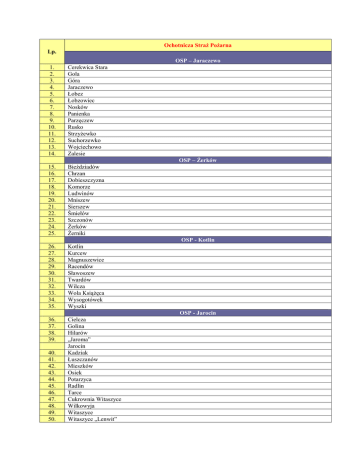Ochotnicza StraŜ PoŜarna Lp. OSP – Jaraczewo 1. 2. 3. 4. 5. 6. 7. 8. 9. 10. 11. 12. 13. 14. Cerekwica Stara Gola Góra Jaraczewo Łobez Łobzowiec Nosków Panienka Parzęczew Rusko StrzyŜewko Suchorzewko Wojciechowo Zalesie 15. 16. 17. 18. 19. 20. 21. 22. 23. 24. 25. Bieździadów Chrzan Dobieszczyzna Komorze Ludwinów Mniszew Sierszew Śmiełów Szczonów śerków śerniki 26. 27. 28. 29. 30. 31. 32. 33. 34. 35. Kotlin Kurcew Magnuszewice Racendów Sławoszew Twardów Wilcza Wola KsiąŜęca Wysogotówek Wyszki 36. 37. 38. 39. Cielcza Golina Hilarów „Jaroma” Jarocin Kadziak Łuszczanów Mieszków Osiek Potarzyca Radlin Tarce Cukrownia Witaszyce Wilkowyja Witaszyce Witaszyce „Lenwit” OSP – śerków OSP - Kotlin OSP - Jarocin 40. 41. 42. 43. 44. 45. 46. 47. 48. 49. 50. 51. Zakrzew