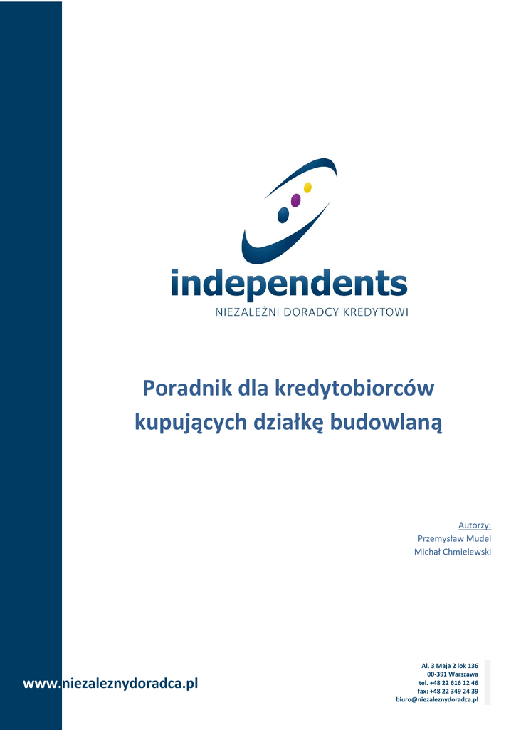 Poradnik dla kredytobiorców kupujących działkę budowlaną Autorzy: Przemysław Mudel Michał Chmielewski www.niezaleznydoradca.pl Al. 3 Maja 2 lok 136 00-391 Warszawa tel. +48 22 616 12 46 fax: +48 22 349 24 39 [email protected] W dzisiejszych realiach, gdy ceny działek ciągle rosną, wiele osób chcących w dalszej lub bliższej przyszłości rozpocząć budowę własnych czterech ścian zmuszona jest do skorzystania z pomocy finansowej banków już przy zakupie ziemi. Zachęcamy wszystkich planujących inwestycję w nieruchomości gruntowe do rozpoczęcia realizacji celu od wyselekcjonowania banków, które dopuszczą do kredytowania działki oraz zbadania w nich swojej zdolności kredytowej. Niestety większość krajowych banków w dość restrykcyjny sposób podchodzi do finansowania ziemi i dlatego pozyskanie dobrego kredytu w tym wypadku będzie o wiele trudniejsze niż wtedy, gdy chodzi o gotowe mieszkanie bądź dom. Mówiąc o zbadaniu możliwości finansowych, mamy na myśli poznanie brzegowych wartości, widełek, w których banki zaszufladkują każdego kredytobiorcę (zdolność kredytowa - jest to indywidualnie oceniana przez bank zdolność Wnioskodawcy do spłaty kredytu wraz z jego odsetkami według założonego harmonogramu). Zdolność statystycznego kredytobiorcy różni się w znaczący sposób w zależności od polityki kredytowej wybranego banku (na jej wielkość mają wpływ zarobki, zobowiązania finansowe, posiadany wkład własny, wiek, wykształcenie oraz inne istotne dla banku czynniki). Różnice w szacowaniu zdolności kredytowej przez funkcjonujące na krajowym rynku banki mogą dochodzić w wybranych przypadkach do setek tysięcy złotych. Dbając o bezpieczeństwo planowanej transakcji, w pierwszym kroku zalecamy sprawdzenie zarówno minimalnej jak i maksymalnej dostępnej dla kredytobiorcy kwoty kredytu. W przypadku kredytowania zakupu nieruchomości gruntowych wiele banków posiada swoje wewnętrzne wytyczne, które uniemożliwią nam zaciągnięcie kredytu. Znacząca większość banków traktuje niezabudowane działki jak nieruchomości ciężko zbywalne i dlatego możemy się spotkać z: Odmową kredytowania ich zakupu, Prośbą o wniesienie większego wkładu własnego, Prośbą o danie w zabezpieczenie innej nieruchomości mieszkalnej. Na największe utrudnienia muszą przygotować się osoby planujące zakup działek rolnych (czyli takich, których dokumentacja nie mówi na dzień zakupu nic o możliwości przekształcenia gruntów w grunty budowlane). Dopiero z tą wiedzą radzilibyśmy wykonać kolejny ruch, jakim jest rozpoczęcie poszukiwania działki. Równocześnie z poszukiwaniami dobrze jest przemyśleć kwestię kryteriów, według których porównywane będą między sobą oferty banków. Przy tej okazji nie wolno zapomnieć o kwestiach: Terminu rozpoczęcie budowy, Waluty kredytu, Wymaganego wkładu własnego, Maksymalnego okresu kredytowania, Opłat około kredytowych, Szybkości podejmowania przez bank decyzji. Wszystkie te elementy powinny mieć odzwierciedlenie w budowanym planie finansowania inwestycji. Błędne dobranie kryteriów może doprowadzić do wyboru jedynie pozornie najkorzystniejszej oferty lub do odrzucenia Państwa wniosku kredytowego przez bank. Naszym zdaniem oferty banków różnią się między sobą na tyle, że nie możemy mówić o „kredytowym panaceum”, które będzie spełniało marzenia wszystkich kredytobiorców równocześnie. www.niezaleznydoradca.pl Al. 3 Maja 2 lok 136 00-391 Warszawa tel. +48 22 616 12 46 fax: +48 22 349 24 39 [email protected] Wybór optymalnego rozwiązania kredytowego zależy przede wszystkim od planów życiowych kredytobiorcy. Banki, tworząc swoje produkty, prześcigają się w pomysłowym zarabianiu na kredytach. Zadłużając się, należy wybrać tę ofertę, która pozwoli na zrealizowanie naszej strategii równocześnie utrudniając realizację zysku naszemu kredytodawcy. Wróćmy teraz do poszukiwań wymarzonej nieruchomości. Najobszerniejszym źródłem ofert jest obecnie Internet. Znajdziemy tam wiele portali, które umożliwiają nam przeszukanie rynku według wybranych przez nas kryteriów (począwszy od lokalizacji, metrażu, kształtu lub dostępnych na działce mediów). Zachęcamy Państwa do odwiedzenia najpopularniejszych z nich: gratka.pl; szybko.pl; domiporta.pl; oferty.net; gumtree.pl; otodom.pl Największym minusem ofert opublikowanych w Internecie jest niska, jakość ogłoszeń, co wyraża się przez nieaktualność lub dublowanie się zamieszonych w sieci ofert. Największym plusem ofert zamieszczonych w Internecie jest darmowa forma dostępu do informacji. Mając już ogólną wiedzę o rynku, można skierować swoje kroki do agencji pośrednictwa nieruchomości. W tym przypadku ważniejszym od wyboru samej agencji jest wybór pośrednika, który będzie opiekował się naszą sprawą. Z jednej strony decydując się na osobistą współpracę z dobrym agentem, możemy liczyć na znaczącą pomoc w znalezieniu godnej zainteresowania ziemi oraz przeprowadzeniu transakcji. Z drugiej strony musimy pamiętać o dodatkowym koszcie – aktualnie prowizje agencji sięgają od 2% do 6% wartości nieruchomości. Na polskim rynku większość pośredników nieruchomości stara się współpracować równocześnie z dwiema stronami transakcji. Przestrzegamy więc przed współpracą z agentami, którzy równocześnie chcą reprezentować interesy strony sprzedającej jak i kupującej. Pamiętajmy o naszych prawach i w przypadku, gdy nie chcemy współpracować z „podwójnym agentem” mamy prawo do odmowy podpisania umowy współpracy z pośrednikiem, który prezentuje działkę na zlecenia strony sprzedającej. W tej sytuacji pośrednik jest w obowiązku reprezentować interesy swojego zleceniodawcy i nie może przymuszać nas do skorzystania ze swoich usług (wynagradzany bowiem jest za wykonywane działania przez stronę sprzedającą). W przypadku