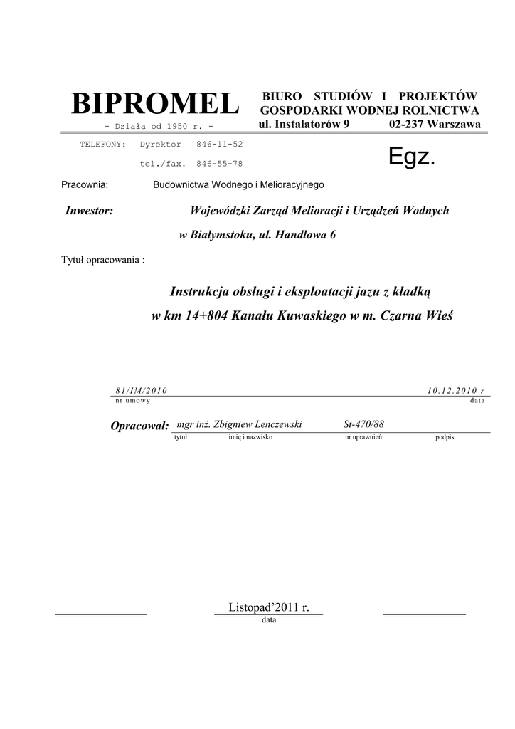 BIPROMEL - Działa od 1950 r. TELEFONY: Dyrektor 846-11-52 tel./fax. 846-55-78 Pracownia: BIURO STUDIÓW I PROJEKTÓW GOSPODARKI WODNEJ ROLNICTWA ul. Instalatorów 9 02-237 Warszawa Egz. Budownictwa Wodnego i Melioracyjnego Inwestor: Wojewódzki Zarząd Melioracji i Urządzeń Wodnych w Białymstoku, ul. Handlowa 6 Tytuł opracowania : Instrukcja obsługi i eksploatacji jazu z kładką w km 14+804 Kanału Kuwaskiego w m. Czarna Wieś 81/IM/2010 10.12.2010 r nr umowy data Opracował: mgr inŜ. Zbigniew Lenczewski tytuł imię i nazwisko Listopad’2011 r. data St-470/88 nr uprawnień podpis 2 Spis treści 1. Wstęp 1.1 Podstawa opracowania 1.2 Przedmiot opracowania 1.3 Zakres stosowania instrukcji 2. Część hydrotechniczna 2.1 Nazwa właściciela i uŜytkownika bezpośrednio odpowiedzialnego za utrzymanie jazu 2.2 Okres waŜności instrukcji, miejsce przechowywania oraz zasady jej aktualizacji 2.3 Wyszczególnienie zadań – celów, którym ma słuŜyć jaz z określeniem priorytetów 2.4 Spis dokumentacji technicznych i eksploatacyjnych oraz miejsca ich przechowywania 2.5 Podstawowe dane hydrologiczne Kanału Kuwaskiego w przekroju budowli 2.6 Charakterystyka techniczna jazu, parametry piętrzenia, warunki normalne, nadzwyczajne i awaryjne eksploatacji jazu 2.7 Zasady obsługi jazu i sposób postępowania w warunkach normalnych, nadzwyczajnych i awaryjnych 2.8 Zasady osłony hydrologicznej ustalone przez państwową słuŜbę hydrologiczno-meteorologiczną 2.9 Sposób postępowania przy stanie wód wysokich, powodziowych oraz niskich 2.10 Organy i jednostki kompetentne do wydawania dyspozycji w nadzwyczajnych warunkach uŜytkowania i warunkach awaryjnych 2.11 Obserwacje, badania, kontrole obiektu i przepisy BHP 2.12 Wzór dziennika obsługi jazu i obserwacji wodowskazów 2.13 Przeglądy konserwacje i remonty Rysunki 1. Projekt zagospodarowania terenu 2. Jaz rzut poziomy 3. Jaz – przekrój podłuŜny - 1:1000. - 1:100 - 1:100 3 1 1.1. Wstęp Podstawa opracowania Opracowanie zostało wykonane zgodnie z umową zawartą w dniu 10.12.2010 roku pomiędzy: Wojewódzkim Zarządem Melioracji i Urządzeń Wodnych w Białymstoku, ul Handlowa 6, a Biurem Studiów i Projektów Gospodarki Wodnej Rolnictwa „Bipromel” sp. z o. o., 02-237 Warszawa, ul Instalatorów 9. Do opracowania instrukcji wykorzystano: – Projekt Budowlany i Projekt Wykonawczy „Kanał Kuwaski - budowa jazu z kładką w km 14+804 w m. Czarna Wieś” – BIPROMEL 2011r. - Zarządzenie nr 882 Ministra Spraw Wewnętrznych i Administracji z dn. 19 października 1998r w sprawie ksiąŜki obiektu budowlanego – Dz.U. Nr 135 z dn. 6.11.1998r. - Prawo wodne ( tekst jednolity Dz.U. 2012 poz. 145. z póź. zm.) 1.2. Przedmiot opracowania Instrukcja dotyczy jazu w km 14+804 Kanału Kuwaskiego w miejscowości Czarna Wieś. 1.3. Zakres stosowania instrukcji Instrukcja ustala zasady i przepisy eksploatacji obiektu warunkujące trwałość i bezpieczne uŜytkowanie z zachowaniem warunków określonych w pozwoleniu wodnoprawnym. Przepisy instrukcji dotyczą części hydrotechniczno-budowlanej obiektu: - obsługi urządzeń, - utrzymania i konserwacji, - prowadzenia obserwacji i kontroli. 2. Część hydrotechniczna 2.1. Nazwa właściciela i uŜytkownika bezpośrednio odpowiedzialnego za utrzymanie jazu Właścicielem Jazu w Czarnej Wsi jest Wojewódzki Zarząd Melioracji i Urządzeń Wodnych w Białymstoku, ul Handlowa 6,. Bezpośrednim uŜytkownikiem budowli jest Wojewódzki Zarząd Melioracji i Urządzeń Wodnych w Białymstoku – Biuro Terenowe w ŁomŜy, ul. Akademicka 20. 2.2. Okres waŜności instrukcji, miejsce przechowywania oraz zasady jej aktualizacji Instrukcja eksploatacji powinna być aktualizowana (Zarządzenie Nr 49 Prezesa CUGW z dnia 18.11.1969r) nie rzadziej niŜ co 5 lat. W czasie aktualizacji naleŜy wprowadzić w instrukcji zmiany, wynikające z doświadczeń eksploatacyjnych oraz modernizacji lub zmian konstrukcyjnych obiektów i urządzeń. Instrukcja wymaga równieŜ aktualizacji po przeprowadzeniu remontu kapitalnego obiektu. Zapisy prowadzone w dokumentach obiektu nie są traktowane jako aktualizacja instrukcji, mogą jednak zawierać zapisy stanowiące powody jej przeprowadzenia. Decyzję o konieczności aktualizacji podejmuje jednostka nadrzędna uŜytkownika. Zaktualizowana instrukcja powinna być zatwierdzona w takim trybie, jak instrukcja pierwotna. 2.3. Wyszczególnienie zadań – celów, którym ma słuŜyć jaz z określeniem priorytetów Jaz pełni rolę ujęcia wody z Jeziora Rajgrodzkiego do Kanału dla potrzeb nawodnienia obiektu „Kuwasy”. W przypadkach koniecznych moŜe być równieŜ wykorzystany do przepuszczenia części wód powodziowych (z jez. Rajgrodzkiego) w celu ochrony przed 4 podtopieniem terenów przylegających do środkowego odcinka rz. Jegrzni. Budowla wykonana została na początku lat pięćdziesiątych ubiegłego wieku. Eksploatację jazu naleŜy prowadzić zgodnie z aktualnym pozwoleniem wodnoprawnym . 2.4. Spis dokumentacji technicznych i eksploatacyjnych oraz miejsca ich przechowywania Instrukcja powinna się znajdować: - W Wojewódzkim Zarządzie Melioracji i Urządzeń Wodnych w Białymstoku, ul. Handlowa 6, 15-399 Białystok; - W Wojewódzkim Zarządzie Melioracji i Urządzeń Wodnych w Białymstoku, Biuro Terenowe w ŁomŜy, ul. Akademicka 20 - U osoby odpowiedzialnej bezpośrednio (tab. nr 1.) za eksploatację i obsługę obiektu tab. nr 1. SłuŜbowy Nazwisko i imię Domowy Stanowisko osoby słuŜbowe adres telefon adres telefon odpowiedzialnej 1 2 3 4 5 6 Nazwa instytucji i jej komórki organizacyjnej oraz nazwisko i imię osoby odpowiedzialnej za jej przechowywanie, powinny być umieszczone na kaŜdym egzemplarzu instrukcji po jej przekazaniu przez Dyrektora WZMiUW. Kierownicy jednostek organizacyjnych, przechowujących Instrukcję, winni spowodować zapoznanie się z jej treścią przez osoby odpowiedzialne za prowadzenie zagadnień gospodarki wodnej, ochrony 