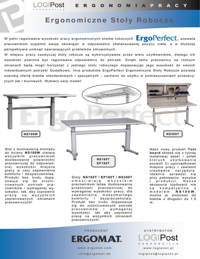 E R G O N O M I A P R A C Y Ergonomiczne Stoły Robocze W peł ni r e gu l o wa na w ys ok oś ć pr ac y er go n o m ic zn yc h s t o łó w ro b oc z yc h p o zwa l a prac o wn ik om w yp e ł n i ć s woj e o b o wi ą zk i w od p o wi ed n i o zb a l a n s o wa nej po z yc j i c ia ł a, a w d łu żs ze j pers p ek t ywi e un ik nąć na wr ac aj ąc yc h pr ob l e m ów zd r o wo tn yc h. W m iej s c u pr ac y za z w yc zaj s to ł y r o b oc ze s ą w yk or z ys t ywa n e pr ze z wi e l u u ż ytk o wn ik ó w, d l at e go ic h w ys ok oś ć p o wi n n a b yć r eg u lo wa n a od p o wi e dn i o d o po tr ze b . D zi ęk i t em u prac o wn ic y na r ó żn yc h zm ia n ac h bę d ą m ogl i k or z ys t ać z j e d n eg o s to łu r ob oc ze g o do pas o wuj ąc j e go w ys o k oś ć do s woic h i nd ywi d u al n yc h po tr ze b! Dod atk o wo , l i n i a pr od uk tó w Erg o P erf ec t Er go n om ic zn e St o ł y R ob oc ze p os i ad a s zer ok ą of ert ę b l a tó w s ta nd ar do w yc h i s pe c j al n yc h - zar ó wn o d o u ż ytk u w p om ies zc ze n iac h pr o duk c yj n yc h j ak i b iur o w yc h . W ybier z s wój m od e l! NS100W NS300T St ó ł z m o żl i wo ś c i ą m o nt a żu do ś c ia n y N S 10 0W u ł at wi a wszystk im pracownikom dos t os o wa n i e p o wi er zc hn i prac o wn ic ze j do o d p o wi e dniej wysokości m iejsca prac y w c e l u za p e w n ie n ia k om f or tu i b e zp i ec ze ń s t wa. Pr od uk t b e z tru d u do p asowuje się do zróżnicowan ych potrzeb prac o wn ik ó w i w ym ag a ne j w ys ok oś c i , tak , a b y us pr a wn ić pracę na wszystkich zaplanowan ych zm ianach prac o wn ic z yc h! Nas z n o w y p ro d uk t T ool boa rd s k ł ad a s i ę z t yl n iej m etal o wej d es k i i p ó łek których użytkowanie po z wo l i C i u po r zą dk o wać m iej s c e prac y i za wi es ić niezbędne narzędzia. Idealnie sprawdzi się pr z y p ak o wa n i u, w ys ył c e i produkcji. Nasze ak c es or i a t o o lb o ard n ie są kompatybilne z modelem NS100W, m ożn a j e s t os o wać d o b la tó w o dł u goś c i d o 1. 5 m. NS160T EP160T St o ł y N S1 6 0T / EP160T / NS300T umożliwiają wszystkim pr ac o wn ik om ła t we d o s tos o wa n ie przestrzeni pracowniczej do w ym a ga n ej w ys ok oś c i p rac y, d l a zapewnienia m ak s ym alnego komfortu i bezpieczeństwa. Pr od uk t b e z t ru d u do p as o wuj e s i ę d o zr ó żn i c o wa n yc h p otr ze b pracowników i wym aganej w ys ok oś c i, tak a b y us pr a wn ić pr ac ę n a ws z ys tk ic h zm ia n ac h pr ac o wn ic z yc h! PRODUCENT DYSTRYBUTOR www.ergomat.com www.logipost.pl [email protected] [email protected] ZBUDUJ SWÓJ WŁASNY ROBOCZY STÓŁ ERGONOMICZNY Dobierz odpowiednią ramę i zamontuj swój własny blat !!! Dostępne ramy ErgoPerf ect: Dostępne bl at y ErgoPerfect: Długość blatu od 120 cm do 168 cm Długość blatu od 168 cm do 200 cm Materiał: stal nierdzewna Długość blatu od 200 cm do 244 cm Materiał: mozaika drewniana klon Materiał: laminat (high-pressure) Materiał: laminat ESD (high-pressure) Materiał: Akryl Wymiary blatów ErgoPerf ect: 152cm x 76cm (długość x szerokość) 182cm x 76cm 244cm x 76cm UWAGA! dostarczamy również niestandardowe wymiary blatów! Stoł y robocze z elektronicznie regulowaną w ysokością prac y Stół NS100W Stół NS160T Stół EP160T Stół NS300T 20cm 71cm – 118cm 71cm – 118cm 71cm – 120cm Wymiary ramy 130x71x60cm 132x71x74cm 105x65x74cm 137x70x74cm Maksymalny udźwig 100kg 160kg 160kg 300kg Akcesoria Montowany do ściany Toolboard Nie posiada Toolboard Regulacja wysokości Wszystkie Stoły Robocze ErgoPerfect posiadają 5 - letnią gwarancję ! W s zys tk i e m ebl e Er g o m at Er o pe r f ec t s ą obj ę te 5 - l et n i a war u nk o wą g war anc j ą w zak r es ie us zk o d ze ń c zęś c i, z k tór yc h zo s t a ł y w yk o n an e. O k r es g war a nc yj n y ro zp o c z yn a s i ę z d n i em na b yc ia . G war a nc j a ni e o b ej m uj e zn i s zc ze ń zwi ą za n yc h z n i e pra wi d ł o w ym lu b n ie zg o d n ym z pr ze z nac ze n i em u ż ytk o wa n iem pr o duk t u . W pr z yp a dk u p yt a ń d ot yc zą c yc h u ż ytk o w an i a m e bl i i k om po ne n tó w Er go P erf ec t w ok reś lo n yc h war u nk ac h ś r o d o wis k o w yc h n a l e ż y s k o ns u l to wa ć s i ę z d ys tr ybu t orem l u b os o b ą r e pre ze n t uj ąc ą f ir m ę Er g om at.