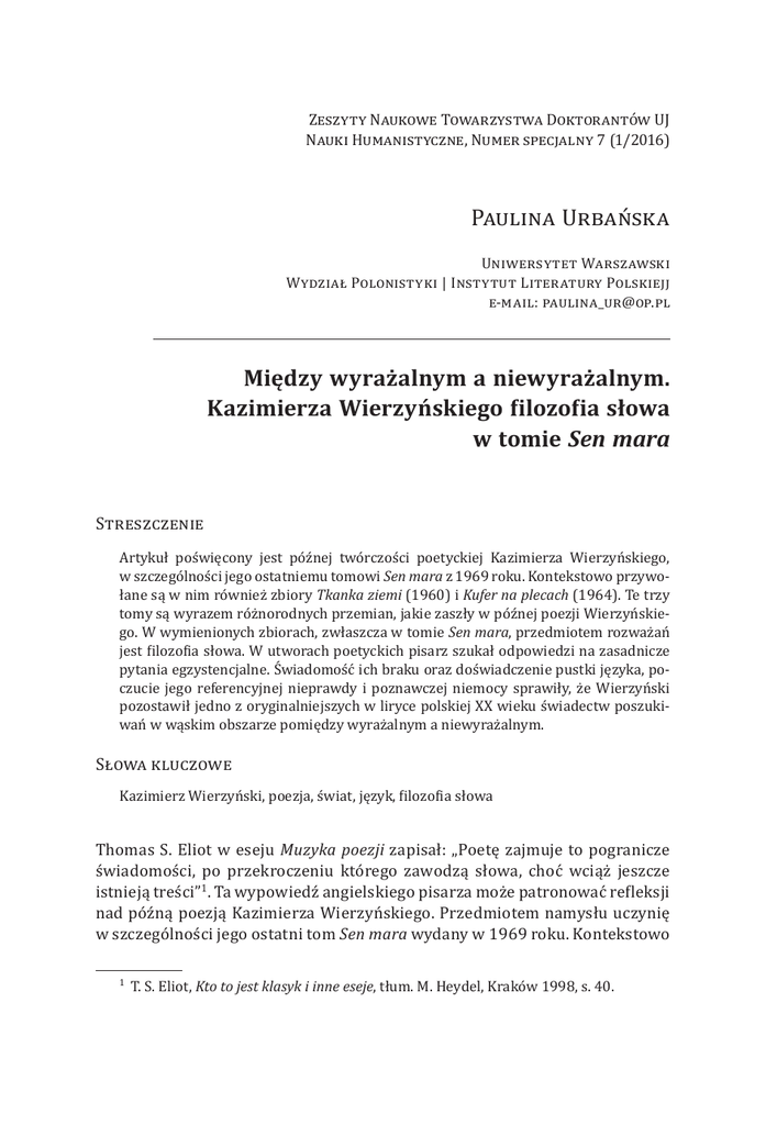 Zeszyty Naukowe Towarzystwa Doktorantów UJ Nauki Humanistyczne, Numer specjalny 7 (1/2016) Paulina Urbańska Uniwersytet Warszawski Wydział Polonistyki | Instytut Literatury Polskiejj e-mail: [email protected] Między wyrażalnym a niewyrażalnym. Kazimierza Wierzyńskiego filozofia słowa w tomie Sen mara Streszczenie Artykuł poświęcony jest późnej twórczości poetyckiej Kazimierza Wierzyńskiego, w szczególności jego ostatniemu tomowi Sen mara z 1969 roku. Kontekstowo przywołane są w nim również zbiory Tkanka ziemi (1960) i Kufer na plecach (1964). Te trzy tomy są wyrazem różnorodnych przemian, jakie zaszły w późnej poezji Wierzyńskiego. W wymienionych zbiorach, zwłaszcza w tomie Sen mara, przedmiotem rozważań jest filozofia słowa. W utworach poetyckich pisarz szukał odpowiedzi na zasadnicze pytania egzystencjalne. Świadomość ich braku oraz doświadczenie pustki języka, poczucie jego referencyjnej nieprawdy i poznawczej niemocy sprawiły, że Wierzyński pozostawił jedno z oryginalniejszych w liryce polskiej XX wieku świadectw poszukiwań w wąskim obszarze pomiędzy wyrażalnym a niewyrażalnym. Słowa kluczowe Kazimierz Wierzyński, poezja, świat, język, filozofia słowa Thomas S. Eliot w eseju Muzyka poezji zapisał: „Poetę zajmuje to pogranicze świadomości, po przekroczeniu którego zawodzą słowa, choć wciąż jeszcze istnieją treści”1. Ta wypowiedź angielskiego pisarza może patronować refleksji nad późną poezją Kazimierza Wierzyńskiego. Przedmiotem namysłu uczynię w szczególności jego ostatni tom Sen mara wydany w 1969 roku. Kontekstowo T. S. Eliot, Kto to jest klasyk i inne eseje, tłum. M. Heydel, Kraków 1998, s. 40. 1 156 Paulina Urbańska odwołam się również do dwóch – korespondujących z nim formalnie i myślowo – zbiorów: Tkanki ziemi (1960) i Kufra na plecach (1964). Te trzy tomy są świadectwem wielorakich i istotnych przemian, jakie zaszły w schyłkowej poezji Wierzyńskiego. Przedmiotem rozważań będzie ostatecznie wyłaniająca się z wymienionych tomów filozofia słowa (poetyckiego). W naznaczonej ironią i zwątpieniem poezji wielkiego skrótu pisarz szukał odpowiedzi na zasadnicze pytania egzystencjalne. Świadomość ich braku oraz poczucie utraty wiary w moc słów, które potrafią opisać i oswoić świat, sprawiły, że pozostawił on jedno z ciekawszych w liryce polskiej XX wieku świadectw poszukiwań i wędrówek po wąskim obszarze pomiędzy wyrażalnym i niewyrażalnym. Cezurą w biografii poety był rok 1941. W tym czasie zamieszkał on w Stanach Zjednoczonych, dokładnie w Nowym Jorku. Jolanta Dudek, autorka książki Liryka Kazimierza Wierzyńskiego z lat 1951–1969, zaznaczyła: Pierwsze lata po zakończeniu wojny okazały się okresem przełomowym. Wierzyński nie zdecydował się nigdy na powrót do Polski. Wybrał emigrację. Zamknął wówczas okres, w którym ukształtowała się jego poetyka wojenna, tak odmienna od dotychczasowej […] stanął wobec alternatywy: albo dalsza rola emigracyjnego barda […] a w efekcie epigoństwo samego siebie […] albo całkowite odnowienie psychiczne i artystyczne: nowe tematy, nowa poetyka, ponowne zaufanie słowu. Druga młodość artystyczna2. Zgadzam się z Jolantą Dudek, która uważa, że właśnie w tym czasie nastąpił przełom w pojmowaniu przez Wierzyńskiego roli pisarza i literatury, co wyraziło się w tomach pochodzących z lat pięćdziesiątych: w zbiorze Korzec maku (1951) oraz Siedem podków (1954), między innymi w wykorzystaniu poetyki wyliczeń, które – jak twierdzi badaczka – były „jakby poszukiwaniem właściwego słowa w dochodzeniu do istoty rzeczy”3. Już wtedy można było zaobserwować w liryce poety przejście od sylabotonizmu i tonizmu do wiersza emocyjnego, nieregularnego. Według Anny Nasiłowskiej Wierzyński „przede wszystkim jednak odnajduje ściśle indywidualną część własnego «ja», podczas gdy od lat trzydziestych głównym motorem jego twórczości było utożsamianie się ze zbiorowością”4. Była to również dekada, w której większość swoich wypowiedzi zaczął poświęcać poezji, a dokładniej właściwościom słowa poetyckiego i relacjom poezji do rzeczywistości, próbując zmierzyć się z problemem – jego echa rozbrzmiewają jeszcze w ostatnim tomie pisarza – podjętym po wielkiej katastrofie przykładowo przez Theodora W. Adorno, Paula Celana, Tadeusza Różewicza czy Czesława Miłosza, który w wierszu Przedmowa z tomu Ocalenie retorycznie pytał: J. Dudek, Liryka Kazimierza Wierzyńskiego z lat 1951–1969, Wrocław 1975, s. 6. Ibidem, s. 7–8. 4 A. Nasiłowska, Kazimierz Wierzyński, Warszawa 1991, s. 62. 2 3 Między wyrażalnym a niewyrażalnym... Czym jest poezja, która nie ocala Narodów ani ludzi? Wspólnictwem urzędowych kłamstw, Piosenką pijaków, którym za chwilę ktoś poderżnie gardła, Czytanką z panieńskiego pokoju5. 157 Na ukształtowanie filozofii słowa w późnej twórczości poety istotny wpływ wywarły doświadczenie międzywojennej awangardy oraz poezja Tadeusza Różewicza i Mirona Białoszewskiego – szczególnie jego poetyka codzienności. Zaś spośród pisarzy obcych przedstawiciele modernistycznej poezji anglosaskiej: wspomniany już Thomas S. Eliot i Ezra Pound. Widocznym efektem wskazanych inspiracji było między innymi włączenie przez Wierzyńskiego w obszar własnego idiomu pisarskiego rozwiniętego obrazu poetyckiego oraz swobodnego rytmu zdania. Jak zaznacza Anna Nasiłowska, poeta wypracował przekonanie, że „w słowie odbywa się inny proces: maksymalnego zbliżenia podmiotu do przedmiotu. Poezja staje się poznaniem bezpośrednim”6 i przez to posiada wartość ocalającą. Świadectwem takiego myślenia były tomy Tkanka ziemi i Kufer na plecach. Za pomocą zapisu snów, nastrojów, przeczuć oraz obserwacji rzeczywistości, w szczególności przyrody, Wierzyński starał się w nich zgłębić i zrozu