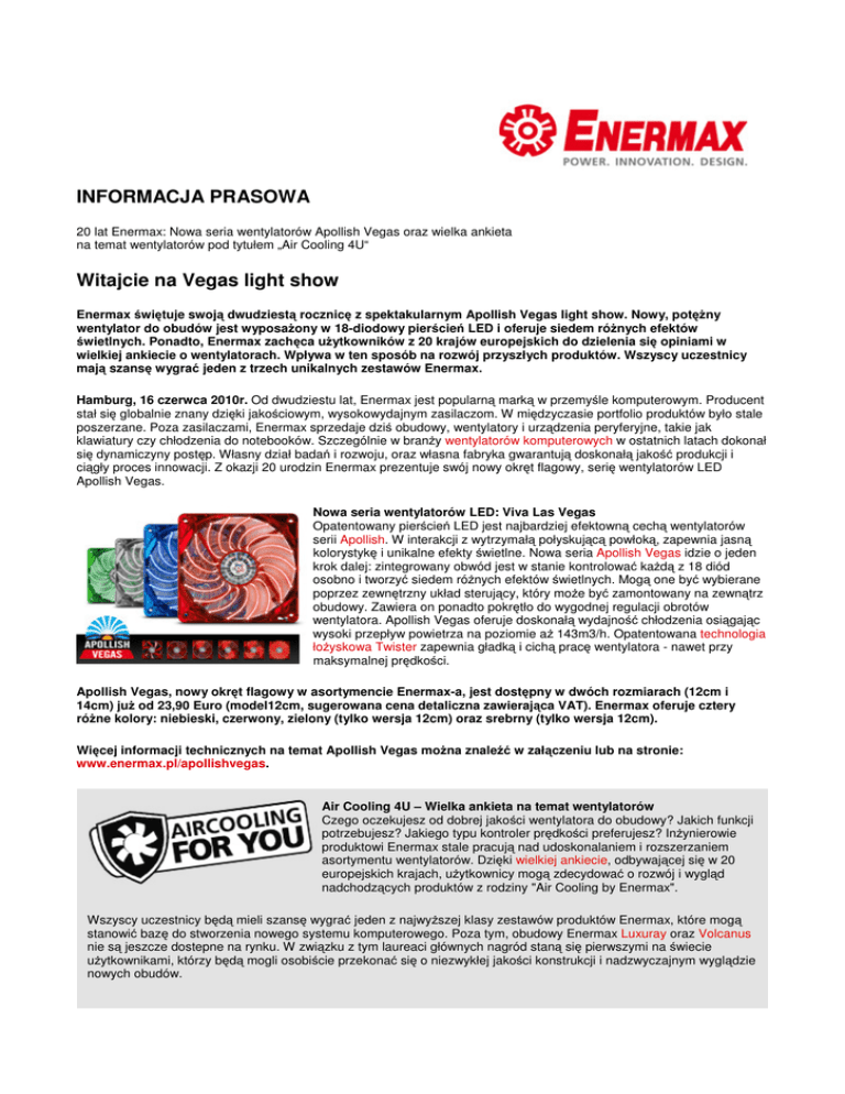 INFORMACJA PRASOWA 20 lat Enermax: Nowa seria wentylatorów Apollish Vegas oraz wielka ankieta na temat wentylatorów pod tytułem „Air Cooling 4U“ Witajcie na Vegas light show Enermax świętuje swoją dwudziestą rocznicę z spektakularnym Apollish Vegas light show. Nowy, potęŜny wentylator do obudów jest wyposaŜony w 18-diodowy pierścień LED i oferuje siedem róŜnych efektów świetlnych. Ponadto, Enermax zachęca uŜytkowników z 20 krajów europejskich do dzielenia się opiniami w wielkiej ankiecie o wentylatorach. Wpływa w ten sposób na rozwój przyszłych produktów. Wszyscy uczestnicy mają szansę wygrać jeden z trzech unikalnych zestawów Enermax. Hamburg, 16 czerwca 2010r. Od dwudziestu lat, Enermax jest popularną marką w przemyśle komputerowym. Producent stał się globalnie znany dzięki jakościowym, wysokowydajnym zasilaczom. W międzyczasie portfolio produktów było stale poszerzane. Poza zasilaczami, Enermax sprzedaje dziś obudowy, wentylatory i urządzenia peryferyjne, takie jak klawiatury czy chłodzenia do notebooków. Szczególnie w branŜy wentylatorów komputerowych w ostatnich latach dokonał się dynamiczyny postęp. Własny dział badań i rozwoju, oraz własna fabryka gwarantują doskonałą jakość produkcji i ciągły proces innowacji. Z okazji 20 urodzin Enermax prezentuje swój nowy okręt flagowy, serię wentylatorów LED Apollish Vegas. Nowa seria wentylatorów LED: Viva Las Vegas Opatentowany pierścień LED jest najbardziej efektowną cechą wentylatorów serii Apollish. W interakcji z wytrzymałą połyskującą powłoką, zapewnia jasną kolorystykę i unikalne efekty świetlne. Nowa seria Apollish Vegas idzie o jeden krok dalej: zintegrowany obwód jest w stanie kontrolować kaŜdą z 18 diód osobno i tworzyć siedem róŜnych efektów świetlnych. Mogą one być wybierane poprzez zewnętrzny układ sterujący, który moŜe być zamontowany na zewnątrz obudowy. Zawiera on ponadto pokrętło do wygodnej regulacji obrotów wentylatora. Apollish Vegas oferuje doskonałą wydajność chłodzenia osiągając wysoki przepływ powietrza na poziomie aŜ 143m3/h. Opatentowana technologia łoŜyskowa Twister zapewnia gładką i cichą pracę wentylatora - nawet przy maksymalnej prędkości. Apollish Vegas, nowy okręt flagowy w asortymencie Enermax-a, jest dostępny w dwóch rozmiarach (12cm i 14cm) juŜ od 23,90 Euro (model12cm, sugerowana cena detaliczna zawierająca VAT). Enermax oferuje cztery róŜne kolory: niebieski, czerwony, zielony (tylko wersja 12cm) oraz srebrny (tylko wersja 12cm). Więcej informacji technicznych na temat Apollish Vegas moŜna znaleźć w załączeniu lub na stronie: www.enermax.pl/apollishvegas. Air Cooling 4U – Wielka ankieta na temat wentylatorów Czego oczekujesz od dobrej jakości wentylatora do obudowy? Jakich funkcji potrzebujesz? Jakiego typu kontroler prędkości preferujesz? InŜynierowie produktowi Enermax stale pracują nad udoskonalaniem i rozszerzaniem asortymentu wentylatorów. Dzięki wielkiej ankiecie, odbywającej się w 20 europejskich krajach, uŜytkownicy mogą zdecydować o rozwój i wygląd nadchodzących produktów z rodziny "Air Cooling by Enermax". Wszyscy uczestnicy będą mieli szansę wygrać jeden z najwyŜszej klasy zestawów produktów Enermax, które mogą stanowić bazę do stworzenia nowego systemu komputerowego. Poza tym, obudowy Enermax Luxuray oraz Volcanus nie są jeszcze dostepne na rynku. W związku z tym laureaci głównych nagród staną się pierwszymi na świecie uŜytkownikami, którzy będą mogli osobiście przekonać się o niezwykłej jakości konstrukcji i nadzwyczajnym wyglądzie nowych obudów. 1 nagroda: Zestaw Enermax High-end o wartości 440 Euro, zawierający ATX Midi Tower Luxuray Zasilacz Modu87+ 700W 3x 12cm wentylatory Apollish Vegas Czarna klawiatura Acrylux Wireless (US) 2 nagroda: Zestaw Enermax Gaming 3 nagroda: Zestaw Enermax Office o wartości 360 Euro, zawierający o wartości 250 Euro, zawierający ATX Midi Tower Volcanus Zasilacz Modu82+ II 625W 3x 12cm wentylatory Apollish Vegas Czarna klawiatura Acrylux (US) ATX Midi Tower Staray Zasilacz LibertyECO II 400W 2x 12cm wentylatory Apollish Vegas Czarna klawiatura Acrylux (US) Nagrody 4 - 10: o łącznej wartości 170 Euro 1x 12cm wentylatory Apollish Vegas Więcej informacji: www.enermax.pl/aircooling4u. Ankieta trwa do 7 lipca 2010r., 23:59 godz. W celu otrzymania dodatkowych informacji lub produktów do przetestowania zapraszamy do kontaktu: Kontakt prasowy: Benjamin Schäfer Marketing | PR ENERMAX Deutschland Coolergiant Computers Handels GmbH Billbrookdeich 32 22113 Hamburg Telefon: +49-40-819957-23 Telefax: +49-40-819957-69 E-Mail: [email protected] URL: www.enermax.pl O Enermax: Enermax Technology Corporation została załoŜona na Tajwanie w 1990 roku. Jest producentem podzespołów PC, takich jak zasilacze, obudowy, systemy chłodzenia, klawiatury i akcesoria, o światowej renomie. Od prawie 20 lat odgrywa kluczową rolę jako innowator na rynku zasilaczy. Produkty Enermax-a są znane z nowoczesnej technologii, wysokiej jakości, doskonałej wydajności, unikalnego wzornictwa i niezrównanego bezpieczeństwa. Firma ma własne centrum badawczo-rozwojowe oraz dwie fabryki. Sześć filii i liczni partnerzy na całym świecie tworzą doskonałą sieć OEM/ODM i handlu detalicznego. Filia Enermax-a w Hamburgu koordynuje główne rynki europejskie. Coolergiant Computers Handels GmbH • Billbrookdeich 32 • 22113 Hamburg • Geschäftsführer: Yen-Wen Su • Handelsregister: HRB 87350 • Ust-ID Nr. DE813705542 • WEEE-Reg.-Nr. DE12381606
