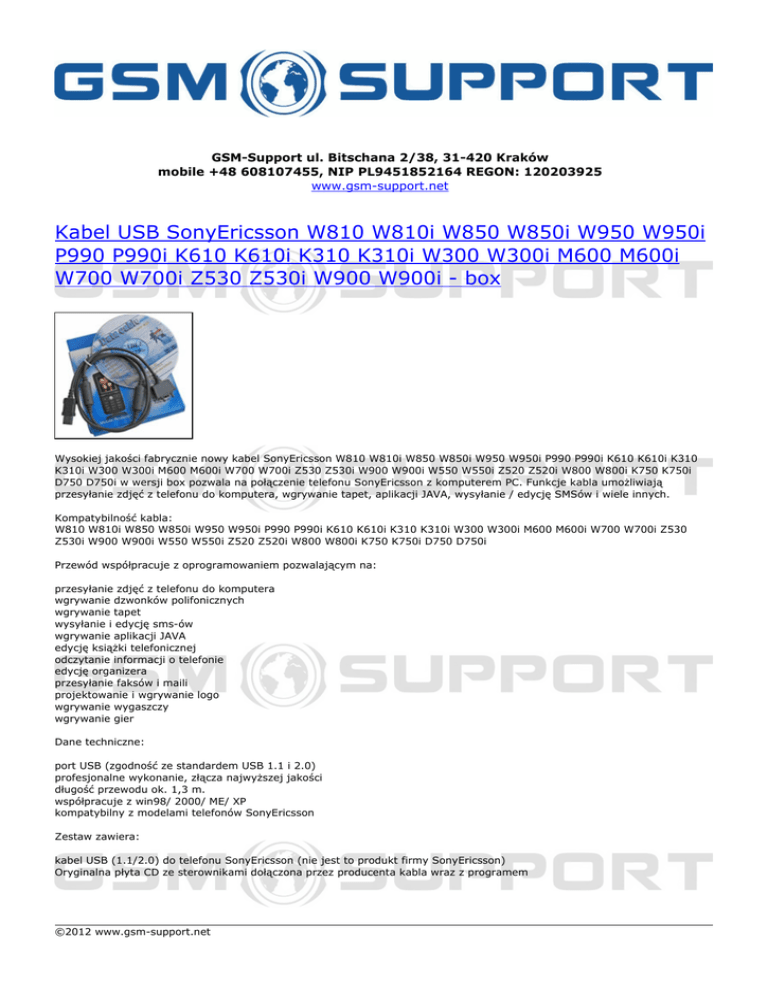 GSM-Support ul. Bitschana 2/38, 31-420 Kraków mobile +48 608107455, NIP PL9451852164 REGON: 120203925 www.gsm-support.net Kabel USB SonyEricsson W810 W810i W850 W850i W950 W950i P990 P990i K610 K610i K310 K310i W300 W300i M600 M600i W700 W700i Z530 Z530i W900 W900i - box Wysokiej jakości fabrycznie nowy kabel SonyEricsson W810 W810i W850 W850i W950 W950i P990 P990i K610 K610i K310 K310i W300 W300i M600 M600i W700 W700i Z530 Z530i W900 W900i W550 W550i Z520 Z520i W800 W800i K750 K750i D750 D750i w wersji box pozwala na połączenie telefonu SonyEricsson z komputerem PC. Funkcje kabla umożliwiają przesyłanie zdjęć z telefonu do komputera, wgrywanie tapet, aplikacji JAVA, wysyłanie / edycję SMSów i wiele innych. Kompatybilność kabla: W810 W810i W850 W850i W950 W950i P990 P990i K610 K610i K310 K310i W300 W300i M600 M600i W700 W700i Z530 Z530i W900 W900i W550 W550i Z520 Z520i W800 W800i K750 K750i D750 D750i Przewód współpracuje z oprogramowaniem pozwalającym na: przesyłanie zdjęć z telefonu do komputera wgrywanie dzwonków polifonicznych wgrywanie tapet wysyłanie i edycję sms-ów wgrywanie aplikacji JAVA edycję książki telefonicznej odczytanie informacji o telefonie edycję organizera przesyłanie faksów i maili projektowanie i wgrywanie logo wgrywanie wygaszczy wgrywanie gier Dane techniczne: port USB (zgodność ze standardem USB 1.1 i 2.0) profesjonalne wykonanie, złącza najwyższej jakości długość przewodu ok. 1,3 m. współpracuje z win98/ 2000/ ME/ XP kompatybilny z modelami telefonów SonyEricsson Zestaw zawiera: kabel USB (1.1/2.0) do telefonu SonyEricsson (nie jest to produkt firmy SonyEricsson) Oryginalna płyta CD ze sterownikami dołączona przez producenta kabla wraz z programem ©2012 www.gsm-support.net Opis ten nie stanowi oferty w rozumieniu Kodeksu Cywilnego. GSM-Support zastrzega sobie prawo do możliwych błędów w opisie produktu. Prosimy o weryfikację z Państwa strony, a w razie wątpliwości o kontakt. GSM-Support ul. Bitschana 2/38 31-420 Kraków POLSKA tel. 608107455 e-mail: [email protected] Powered by TCPDF (www.tcpdf.org)