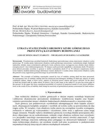 XXIV awarie budowlane XXIV Konferencja Naukowo-Techniczna Szczecin-Międzyzdroje, 26-29 maja 2009 Prof. dr hab. inŜ. MACIEJ GRYCZMAŃSKI, [email protected] Politechnika Śląska, Wydział Budownictwa, Katedra Geotechniki Dr inŜ. HENRYK KLETA, [email protected] Politechnika Śląska, Wydział Górnictwa i Geologii, Katedra Geomechaniki, Budownictwa Podziemnego i Zarządzania Ochroną Powierzchni UTRATA STATECZNOŚCI OBUDOWY SZYBU GÓRNICZEGO PRZYCZYNĄ KATASTROFY BUDOWLANEJ LOSS OF MINING SHAFT STABILITY – THE REASON OF BUILDING CATASTROPHE Streszczenie Przedstawiono przykład katastrofy budowlanej spowodowanej utratą stateczności obudowy szybu górniczego. W wyniku utraty stateczności obudowy szybu górniczego zniszczeniu i uszkodzeniu uległy: budynek nadszybia, obiekty stacji wentylatorów głównych, trzon szybowej wieŜy wyciągowej oraz obiekty stacji elektroenergetycznych i sieci elektroenergetyczne. W miejscu szybu powstało zapadlisko o promieniu około 30 metrów, poza którym powstały szczeliny w gruncie w strefie o promieniu około 67 m. W referacie rozpatrzono moŜliwości budowy modelu numerycznego deformacji warstw skalnych w wyniku utraty stateczności obudowy szybu dla potrzeb oceny zagroŜenia geotechnicznego na powierzchni terenu. Abstract The example of building catastrophe caused by loss of stability mining shaft has been presented. In consequence loss of stability mining haft has destroyed and damaged: building of shaft top, objects of main ventilation station, shank of hoist tower, objects of electrical power station and power network. In the place of shaft has formed sink by radius about 30 meters. Out of sink range in the radius 67 m arise has arisen gaps in the ground. In the paper has been considered possibility of creation of numerical model of rock layers deformations in the result of loss of stability shaft lining for necessity of geotechnical menace assessment for land surface. 1. Wprowadzenie Stan techniczny obudowy szybów górniczych w duŜym stopniu warunkuje bezpieczne i efektywne ekonomicznie prowadzenie działalności wydobywczej kopalni oraz bezpieczeństwo powierzchni terenu i obiektów budowlanych zlokalizowanych w otoczeniu szybu. Szyb górniczy jest podstawowym wyrobiskiem udostępniającym złoŜe kopalin uŜytecznych, obejmującym kompleks urządzeń i wyrobisk od wylotu szybu na powierzchnię do dna rząpia szybu. W związku z tym obudowie szybu stawia się szczególnie wysokie wymagania, zwłaszcza w zakresie jej wytrzymałości i szczelności, które wraz z upływem czasu mogą ulegać zmianom. Ponadto wpływy działalności górniczej wywołują lokalne przeciąŜenia obudowy objawiające się jej uszkodzeniami, wskutek czego obudowa szybowa traci szczelność, a w przypadku znacznego zaawansowania spękań moŜe utracić równieŜ stateczność. Z tego względu istotnego znaczenia nabierają prace polegające na okresowych badaniach i ocenie stanu technicznego obudowy, zaś uzyskane wyniki tych prac są pomocne w podejmowaniu racjonalnych decyzji dotyczących zakresu niezbędnych remontów. Geotechnika Szczególne znaczenie dla funkcji jaką pełni obudowa szybu, mają jej wytrzymałość i ewentualne uszkodzenia. W przypadku wystąpienia większych uszkodzeń obudowy, moŜe nastąpić utrata stateczności obudowy szybu, co moŜe zagrozić planowej działalności kopalni, a nawet jej istnieniu. Przyczyn uszkodzeń obudowy szybów jest wiele, najczęściej są nimi: – postępujące deformacje obudowy związane z odwadnianiem górotworu oraz wpływami eksploatacji górniczej, – oddziaływania dynamiczne pochodzące od wstrząsów masywu skalnego, – ukryte wady, starzenie się materiału obudowy i wpływ agresywnych wód kopalnianych, – niekorzystne zmiany napręŜeń w obudowie wywołane rozmraŜaniem górotworu, – okresowe przemarzanie obudowy, – korozyjne oddziaływanie gazów zawartych w wydechowym powietrzu kopalnianym. W szybach najczęściej występują uszkodzenia obudowy w postaci spękań, złuszczeń, lokalnych ubytków, a nawet wyłamywań fragmentów obudowy szybu. Utrata stateczności obudowy szybu powoduje wystąpienie w otoczeniu szybu zagroŜenia geotechnicznego, które objawia się w postaci powierzchniowych deformacji nieciągłych – zapadlisk, podobnych do powierzchniowych ruchów masowych, które są w swej naturze jednymi z najbardziej rozpowszechnionych zjawisk generujących katastrofy przyrodnicze. Powierzchniowe ruchy masowe obejmują procesy i zjawiska, których wspólną cechą jest zniszczenie struktury gruntu, w wyniku przemieszczeń i deformacji pod wpływem siły cięŜkości. W przypadku zagroŜeń geotechnicznych w sąsiedztwie szybów górniczych moŜna wyróŜnić przede wszystkim: a. zapadliska terenu, b. uszkodzenia obiektów budowlanych i infrastruktury technicznej, c. uszkodzenia gruntów, powodujące zmianę ich przeznaczenia, d. wstrząsy i odpręŜenia skał, e. zmiany stosunków hydrogeologicznych. W dniu 4 września 2008 r. w Kompanii Węglowej S.A. KWK „Szczygłowice” w Knurowie, doszło do katastrofy obiektów budowlanych przy szybie górniczym, spowodowanej osunięciem terenu w wyniku zawalenia się tego szybu. Zniszczeniu i uszkodzeniu uległy: budynek nadszybia, obiekty stacji wentylatorów głównych przy szybie, budynek po byłej maszynie wyciągowej, trzon szybowej wieŜy wyciągowej, obiekty stacji elektroenergetycznych, sieci elektroenergetyczne średniego napięcia. 2. Utrata stateczności obudowy w czynnym szybie górniczym 2.1. Charakterystyka techniczna szybu i stan obudowy Przedmiotowy szyb miał głębokość 632,05 m i średnicę 6,0 m w świetle obudowy. Szyb nie był zazbrojony, nie posiadał urządzenia wyciągowego, choć od roku 1973 ustawiona była nad nim ostateczna wieŜa wyciągowa typu zastrzałowego o konstrukcji stalowej. Wloty do szybu znajdowały się na głębokościach: f. 10 m – wlot betonowy do kanału wentylacyjnego, g. 240,6 m wlot w o