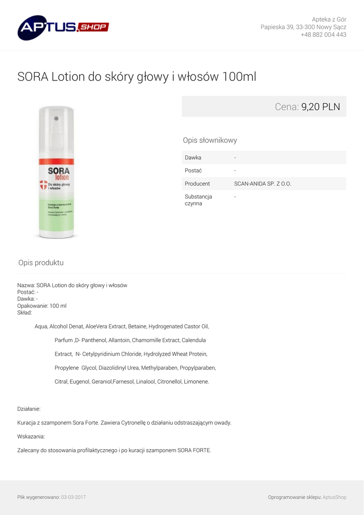 Apteka z Gór Papieska 39, 33-300 Nowy Sącz +48 882 004 443 SORA Lotion do skóry głowy i włosów 100ml Cena: 9,20 PLN Opis słownikowy Dawka - Postać - Producent SCAN-ANIDA SP. Z O.O. Substancja czynna - Opis produktu Nazwa: SORA Lotion do skóry głowy i włosów Postać: Dawka: Opakowanie: 100 ml Skład: Aqua, Alcohol Denat, AloeVera Extract, Betaine, Hydrogenated Castor Oil, Parfum ,D- Panthenol, Allantoin, Chamomille Extract, Calendula Extract, N- Cetylpyridinium Chloride, Hydrolyzed Wheat Protein, Propylene Glycol, Diazolidinyl Urea, Methylparaben, Propylparaben, Citral, Eugenol, Geraniol,Farnesol, Linalool, Citronellol, Limonene. Działanie: Kuracja z szamponem Sora Forte. Zawiera Cytronellę o działaniu odstraszającym owady. Wskazania: Zalecany do stosowania profilaktycznego i po kuracji szamponem SORA FORTE. Plik wygenerowano: 03-03-2017 Oprogramowanie sklepu: AptusShop Apteka z Gór Papieska 39, 33-300 Nowy Sącz +48 882 004 443 Lotion działa antyseptycznie, koi stany podrażnienia i swędzenia skóry głowy. Zawarty w lotionie naturalny olejek Cytronella odstrasza wszy i owady. Alantoina, prowitamina B5, wyciągi aloesu, rumianku i nagietka oraz roślinna keratyna działają łagodząco na skórę głowy i kondycjonują włosy. Dawkowanie: Sposób użycia: W zależności od potrzeby lotion : - wmasowywać w odsłoniętą skórę głowy w stanach podrażnienia i swędzenia, - spryskiwać włosy profilaktycznie z częstotliwością konieczną dla podtrzymania zapachu Cytronelli. Plik wygenerowano: 03-03-2017 Powered by TCPDF (www.tcpdf.org) Oprogramowanie sklepu: AptusShop