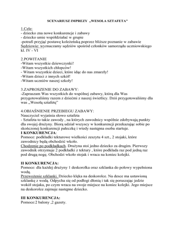 SCENARIUSZ IMPREZY ,,WESOŁA SZTAFETA” 1.Cele: - dziecko zna nowe konkurencje i zabawy - dziecko umie współdziałać w grupie -potrafi przyjąć postawę koleŜeńską poprzez bliŜsze poznanie w zabawie Sędziowie: wyznaczamy sędziów spośród członków samorządu uczniowskiego kl. IV - VI 2.POWITANIE -Witam wszystkie dziewczynki! -Witam wszystkich chłopców! - Witam wszystkie dzieci, które idąc do nas zmarzły! -Witam dzieci z innych szkół! -Witam uczniów naszej szkoły! 3.ZAPROSZENIE DO ZABAWY: -Zapraszam Was wszystkich do wspólnej zabawy, którą dla Was przygotowaliśmy razem z dziećmi z naszej świetlicy. Dziś przygotowaliśmy dla was ,,Wesołą sztafetę” 4.OBJAŚNIENIE PRZEBIEGU ZABAWY: Nauczyciel wyjaśnia słowo sztafeta - Sztafeta to takie zawody , na których zawodnicy wspólnie zdobywają punkty dla swojej druŜyny. Biorą udział wszyscy w konkurencji przekazując sobie po skończonej konkurencji pałeczkę i wtedy następna osoba startuje. I KONKURENCJA: Pomoce: podkładki tekturowe wielkości zeszytu 4 szt., 2 stojaki, które zawodnicy będą obchodzić wkoło. Chodzenie po podkładkach. DruŜyna stoi jedno dziecko za drugim. Pierwszy zawodnik otrzymuje 2 podkładki z tektury , które podkłada raz pod jedną raz pod drugą nogę. Obchodzi wkoło stojak i wraca na koniec kolejki. II KONKURENCJA: Pomoce: dla kaŜdej druŜyny 1 deskorolka oraz szklanka do połowy wypełniona wodą. PrzewoŜenie szklanki. Dziecko klęka na deskorolce. Na desce ma ustawioną szklankę z wodą. Odpycha się od podłogi dłonią i tak się poruszając jedzie wokół stojaka, po czym wraca na swoje miejsce na koniec kolejki. Jego miejsce na deskorolce zajmuje następne dziecko. III KONKURENCJA: Pomoce:2 balony ,2 gazety. Przenoszenie balona na gazecie. Dzieci dobierają się w pary. Para otrzymuje balon i 1 płat rozłoŜonej gazety. Kładą balon na gazecie i wolno, tak by nie spadł balon okrąŜają stojak, wracają na miejsce. Jeśli w zabawie bierze udział nieparzysta liczba dzieci pierwsze dziecko biegnie 2 razy. IV KONKURENCJA: Pomoce:2 pary rękawiczek wełnianych z palcami, Dzieci powinny mieć na nogach wiązane buty(trampki), które dla potrzeb konkurencji trzeba rozwiązać. Dzieci siadają po turecku jedno za drugim. Na sygnał ,,start” uczeń zakłada rękawiczki, zawiązuje buty , ściąga rękawiczki i przekazuje je następnemu zawodnikowi. Wygrywa ta druŜyna , która szybciej zawiąŜe buty. V KONKURENCJA: Pomoce: 2 kawałki 1,5 m sznurka. Na kaŜdym końcu sznurka zawiązujemy kredkę (o przekroju kanciastym, nie okrągłym).Razem potrzebujemy 4 kredki ołówkowe. połowę sznurka zaznaczamy poprzez zawiązanie czerwonej nitki tak, by łatwo było zobaczyć, gdzie jest połowa sznurka. 2 zawodnicy stają naprzeciwko siebie i na hasło start zaczynają nawijać kaŜdy ze swojej strony sznurek na kredkę. Sznurek powinien być lekko napięty. Który zawodnik pierwszy dojdzie do czerwonej nitki – wygrywa. PRACA SĘDZIÓW: W czasie prac sędziów dzieci udają się na słodki poczęstunek . OGŁOSZENIE WYNIKÓW ROZDANIE NAGRÓD. POśEGNANIE GOŚCI.