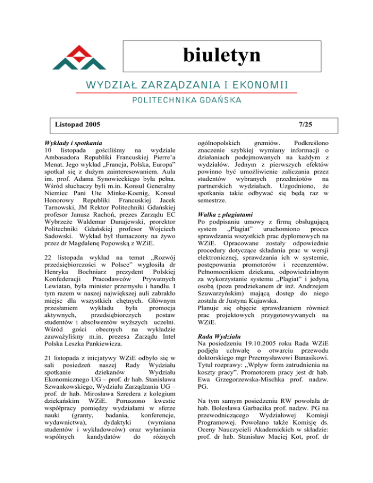 Biuletyn listopad 2005 nr 7/25 Redaktor dr hab. Piotr Dominiak prof