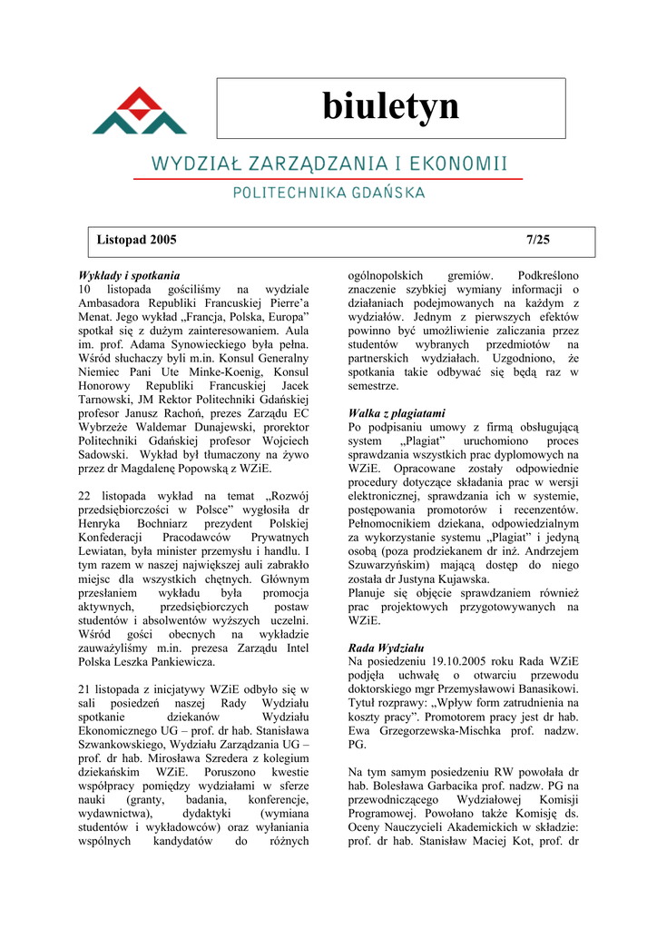 biuletyn Listopad 2005 Wykłady i spotkania 10 listopada gościliśmy na wydziale Ambasadora Republiki Francuskiej Pierre’a Menat. Jego wykład „Francja, Polska, Europa” spotkał się z dużym zainteresowaniem. Aula im. prof. Adama Synowieckiego była pełna. Wśród słuchaczy byli m.in. Konsul Generalny Niemiec Pani Ute Minke-Koenig, Konsul Honorowy Republiki Francuskiej Jacek Tarnowski, JM Rektor Politechniki Gdańskiej profesor Janusz Rachoń, prezes Zarządu EC Wybrzeże Waldemar Dunajewski, prorektor Politechniki Gdańskiej profesor Wojciech Sadowski. Wykład był tłumaczony na żywo przez dr Magdalenę Popowską z WZiE. 22 listopada wykład na temat „Rozwój przedsiębiorczości w Polsce” wygłosiła dr Henryka Bochniarz prezydent Polskiej Konfederacji Pracodawców Prywatnych Lewiatan, była minister przemysłu i handlu. I tym razem w naszej największej auli zabrakło miejsc dla wszystkich chętnych. Głównym przesłaniem wykładu była promocja aktywnych, przedsiębiorczych postaw studentów i absolwentów wyższych uczelni. Wśród gości obecnych na wykładzie zauważyliśmy m.in. prezesa Zarządu Intel Polska Leszka Pankiewicza. 21 listopada z inicjatywy WZiE odbyło się w sali posiedzeń naszej Rady Wydziału spotkanie dziekanów Wydziału Ekonomicznego UG – prof. dr hab. Stanisława Szwankowskiego, Wydziału Zarządzania UG – prof. dr hab. Mirosława Szredera z kolegium dziekańskim WZiE. Poruszono kwestie współpracy pomiędzy wydziałami w sferze nauki (granty, badania, konferencje, wydawnictwa), dydaktyki (wymiana studentów i wykładowców) oraz wyłaniania wspólnych kandydatów do różnych 7/25 ogólnopolskich gremiów. Podkreślono znaczenie szybkiej wymiany informacji o działaniach podejmowanych na każdym z wydziałów. Jednym z pierwszych efektów powinno być umożliwienie zaliczania przez studentów wybranych przedmiotów na partnerskich wydziałach. Uzgodniono, że spotkania takie odbywać się będą raz w semestrze. Walka z plagiatami Po podpisaniu umowy z firmą obsługującą system „Plagiat” uruchomiono proces sprawdzania wszystkich prac dyplomowych na WZiE. Opracowane zostały odpowiednie procedury dotyczące składania prac w wersji elektronicznej, sprawdzania ich w systemie, postępowania promotorów i recenzentów. Pełnomocnikiem dziekana, odpowiedzialnym za wykorzystanie systemu „Plagiat” i jedyną osobą (poza prodziekanem dr inż. Andrzejem Szuwarzyńskim) mającą dostęp do niego została dr Justyna Kujawska. Planuje się objęcie sprawdzaniem również prac projektowych przygotowywanych na WZiE. Rada Wydziału Na posiedzeniu 19.10.2005 roku Rada WZiE podjęła uchwałę o otwarciu przewodu doktorskiego mgr Przemysławowi Banasikowi. Tytuł rozprawy: „Wpływ form zatrudnienia na koszty pracy”. Promotorem pracy jest dr hab. Ewa Grzegorzewska-Mischka prof. nadzw. PG. Na tym samym posiedzeniu RW powołała dr hab. Bolesława Garbacika prof. nadzw. PG na przewodniczącego Wydziałowej Komisji Programowej. Powołano także Komisję ds. Oceny Nauczycieli Akademickich w składzie: prof. dr hab. Stanisław Maciej Kot, prof. dr hab. Marianna Daszkowska, dr hab. Anna Rzeczycka. Senat Uchwałą Senatu PG zostały przyjęte zasady przyjęć na PG w roku 2006. W przypadku naszego wydziału, podobnie jak w roku 2005, o przyjęciu decydować będzie konkurs świadectw, w którym uwzględniane będą oceny z matematyki i języka obcego. Sukcesy Nakładem znanego wydawnictwa CeDeWu ukazała się książka autorstwa dwóch naszych kolegów z Katedry Ekonomii i Zarządzania Przedsiębiorstwem dr Tomasza Korola i dr Błażeja Prusaka „Upadłość przedsiębiorstw a wykorzystanie sztucznej inteligencji”. Gratulujemy! Warto przypomnieć, że w przypadku dr Błażeja Prusaka, to już druga książka w tym roku. Rozstrzygnięto konkurs o nagrodę Grupy Lotos na najlepszą pracę magisterską w zakresie „Ochrony środowiska i nowych technologii zwiększających bezpieczeństwo energetyczne”. Nagrodę otrzymał dyplomant dr inż. Cezarego Orłowskiego z Katedry Podstaw Zarządzania i Informatyki – mgr inż. Krzysztof Bartosiewicz za pracę „Design of the Data Warehouse, Decision Support System and Their Cooperation for Ecological Engineering”. Wręczenie nagrody (7 000 zł) miało miejsce podczas uroczystej inauguracji roku akademickiego na PG. Laureatowi i jego opiekunowi składamy najserdeczniejsze gratulacje. Studenci Student naszego wydziału Przemysław Kitowski został wybrany prezesem Klubu Uczelnianego AZS. Serdeczne gratulacje. To pierwszy prezes AZS wywodzący się z WZiE. W zarządzie klubu jest także Dariusz Kurowski. Życzymy im wielu sukcesów organizacyjnych i sportowych. Wszystko wskazuje na to, iż od semestru letniego zostanie uruchomiona na magisterskich studiach uzupełniających anglojęzyczna specjalność Small Business Economics and Management. Będą się mogli na nią zapisywać zarówno Polacy, jak i przyjeżdżający na wydział w ramach programów wymiany studentów i indywidualnie obcokrajowcy. Współpraca międzynarodowa Wg informacji pełnomocnika dziekana ds. współpracy międzynarodowej dr Magdaleny Popowskiej w bieżącym semestrze studiuje zagranicą w ramach programu SocratesErasmus 23 studentów WZiE. To największa liczba w historii wydziału. 29 listopada gościliśmy na wydziale przedstawicielki Coventry University: Janet Lewis i Olga Askey. Rozmowy dotyczyły m.in. wymiany studentów. Z naszej strony prowadzili je dr Magdalena Popowska i dr Maciej Waszczyk. Odbyło się również spotkanie z dziekanem WZiE. Odznaczenia Podczas uroczystości w Dworze Artura prezydent Miasta Gdańska Paweł Adamowicz wręczył medale z okazji 25 rocznicy podpisania Porozumień Sierpniowych dwóm pracownikom WZiE. Dr inż. Kazimierz Frydel otrzymał medal za swą działalność w „Solidarności”, szczególnie w okresie stanu wojennego. Dr hab. Piotr Dominiak prof. nadzw. PG został wyróżniony za 