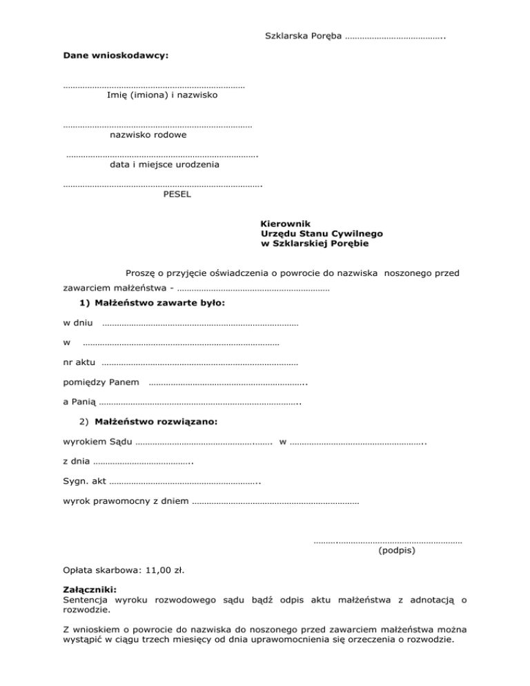 Szklarska Poręba ………………………………….. Dane wnioskodawcy: ………………………………………………………………… Imię (imiona) i nazwisko …………………………………………………………………… nazwisko rodowe ……………………………………………………………………. data i miejsce urodzenia ………………………………………………………………………. PESEL Kierownik Urzędu Stanu Cywilnego w Szklarskiej Porębie Proszę o przyjęcie oświadczenia o powrocie do nazwiska noszonego przed zawarciem małżeństwa - ……………………………………………………… 1) Małżeństwo zawarte było: w dniu w ……………………………………………………………………… ……………………………………………………………………… nr aktu ……………………………………………………………………… pomiędzy Panem ……………………………………………………….. a Panią ……………………………………………………………………….. 2) Małżeństwo rozwiązano: wyrokiem Sądu ………………………………………….……. w ……………………………………………….. z dnia ………………………………….. Sygn. akt …………………………………………………….. wyrok prawomocny z dniem …………………………………………………………… ……….…………………………………………… (podpis) Opłata skarbowa: 11,00 zł. Załączniki: Sentencja wyroku rozwodowego sądu bądź odpis aktu małżeństwa z adnotacją o rozwodzie. Z wnioskiem o powrocie do nazwiska do noszonego przed zawarciem małżeństwa można wystąpić w ciągu trzech miesięcy od dnia uprawomocnienia się orzeczenia o rozwodzie.