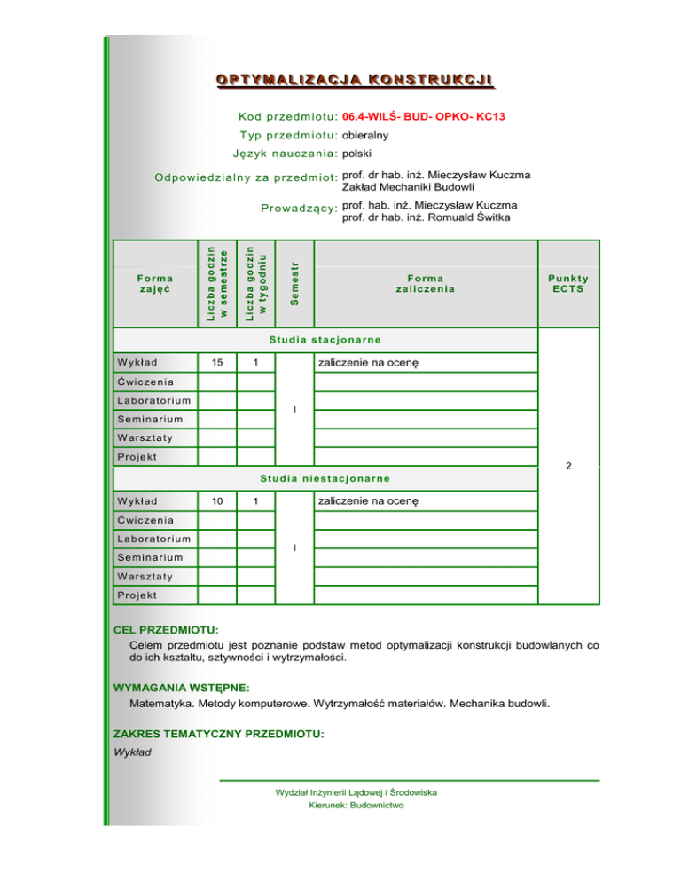 O OP PTTY YM MA ALLIIZZA AC CJJA A K KO ON NS STTR RU UK KC CJJII K od p r ze dm io tu : 06.4-WILŚ- BUD- OPKO- KC13 T yp pr ze dm i ot u : obieralny J ę z yk n auc za n i a : polski O d po wi e d zi a l n y za pr z edm i ot : prof. dr hab. inż. Mieczysław Kuczma Zakład Mechaniki Budowli Semestr Liczba godzin w tygodniu Forma zajęć Liczba godzin w semestrze Pr o wa d ząc y: prof. hab. inż. Mieczysław Kuczma prof. dr hab. inż. Romuald Świtka Forma zaliczenia Punkty ECTS Studia stacjonarne W yk ł a d 15 zaliczenie na ocenę 1 Ć wi c z e n i a Laboratorium I Seminarium W ar s z t a t y Projekt 2 Studia niestacjonarne W yk ł a d 10 zaliczenie na ocenę 1 Ć wi c z e n i a Laboratorium I Seminarium W ar s z t a t y Projekt CEL PRZEDMIOTU: Celem przedmiotu jest poznanie podstaw metod optymalizacji konstrukcji budowlanych co do ich kształtu, sztywności i wytrzymałości. WYMAGANIA WSTĘPNE: Matematyka. Metody komputerowe. Wytrzymałość materiałów. Mechanika budowli. ZAKRES TEMATYCZNY PRZEDMIOTU: Wykład Wydział Inżynierii Lądowej i Środowiska Kierunek: Budownictwo Podstawy metodologii projektowania technicznego. Miary niezawodności i bezpieczeństwa konstrukcji. Kryteria optymalności konstrukcji. Optymalne kształtowanie łuków i słupów równej wytrzymałości. Optymalizacja wielokryterialna. Optymalne projektowanie belek. Optymalne projektowanie belek i ram według teorii nośności granicznej. Zadanie programowania kwadratowego. Ekstremum funkcji na zbiorze wypukłym i warunki konieczne ekstremum. Warunki Karusha-Kuhna-Tuckera (KKT) dla zagadnień sprężystoplastycznych. Metoda mnożników Lagrange’a. METODY KSZTAŁCENIA: Wykład - wykład konwencjonalny. EFEKTY KSZTAŁCENIA: Wiedza Student nabywa podstawową wiedzę w zakresie rozumienia i stosowania metod i algorytmów optymalizacji matematycznej do zaawansowanych problemów kształtowania konstrukcji, co do ich kształtu i wykorzystania nośności. (K_W01) Umiejętności Student nabywa podstawowe umiejętności wyznaczania optymalnych rozwiązań dla łuków, słupów i belek w zakresie sprężystym, oraz kratownic, belek i ram według teorii nośności granicznej. (K_U09) Kompetencje społeczne Potrafi myśleć i działać w sposób twórczy i przedsiębiorczy. (K_K05) WERYFIKACJA EFEKTÓW KSZTAŁCENIA I WARUNKI ZALICZENIA: Wykład Zaliczenie na podstawie kolokwium z progami punktowymi: 50% - 60% pozytywnych odpowiedzi – dst, 61% - 70% dst plus, 71% - 80% db, 81% - 90% db+, 91% - 100% bdb. Zaliczenie przedmiotu: Ocena końcowa jest średnią za kolokwium i ćwiczenie projektowe. OBCIĄŻENIE PRACĄ STUDENTA: Kontakt z prowadzącym 15W+15K, razem Przygotowanie do zaliczenia wykładu i opracowania ćwiczenia Łącznie 30+30 ECTS na przedmiot 60/30=2 30 h 30 h 60 h 2 ECTS. LITERATURA PODSTAWOWA: 1. Brandt A.M.(red.), Kryteria i Metody Optymalizacji Konstrukcji. PWN, Warszawa 1977. 2. Brandt A.M. (red.), Podstawy Optymalizacji Elementów Budowlanych. PWN, Warszawa 1978. 3. Majid K.I., Optymalne projektowanie konstrukcji. PWN, Warszawa 1981. 4. Ostwald M., Podstawy optymalizacji konstrukcji. Wyd. PP, Poznań 2005. 5. Szymczak C., Elementy teorii projektowania. PWN, Warszawa 1998. Wydział Inżynierii Lądowej i Środowiska Kierunek: Budownictwo 6. Wasiutyński Z., Pisma, tom II: O zagadnieniach optymalizacji konstrukcyj i o rozwijaniu tych zagadnień. PWN, Warszawa 1978. LITERATURA UZUPEŁNIAJĄCA: 1. Borkowski A., Statyczna analiza układów prętowych w zakresach sprężystym i plastycznym. IPPT PAN, Warszawa – Poznań 1985. 2. Findeisen W., Szymanowski J., Wierzbicki A., Teoria i metody obliczeniowe optymalizacji. PWN, Warszawa 1980. 3. Stadnicki J.: Teoria i praktyka rozwiązywania zadań optymalizacji. WNT, Warszawa 2006. UWAGI: Wydział Inżynierii Lądowej i Środowiska Kierunek: Budownictwo