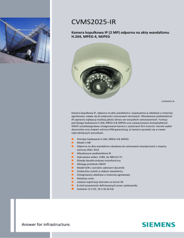 CVMS2025-IR Kamera kopułkowa IP (2 MP) odporna na akty wandalizmu H.264, MPEG-4, MJPEG CVMS2025-IR Kamera kopułkowa IP, odporna na akty wandalizmu i wyposażona w obiektyw o zmiennej ogniskowej, nadaje się do większości zastosowań sieciowych. Wbudowane podświetlenie IR zapewnia najlepszą możliwą jakość obrazu we wszystkich zastosowaniach. Funkcja potrójnego kodowania H.264, MPEG-4 & MJPEG oraz zaawansowana kompatybilność ONVIF umożliwiają łatwe zintegrowanie kamery z systemami firm trzecich. Szeroki wybór akcesoriów oraz stopień ochrony IP66 gwarantują, że kamera sprawdzi się w nawet najtrudniejszych warunkach. Answer for infrastructure. Potrójne kodowanie H.264, MPEG-4 & MJPEG Model 2 MP Odporna na akty wandalizmu obudowa do zastosowań zewnętrznych o stopniu ochrony IP66 i IK10 Wbudowane podświetlenie IR Hybrydowe wideo: CVBS: do 480 linii TV Dźwięk dwukierunkowy monofoniczny Obsługa protokołu ONVIF Model D/N z szerokim zakresem dynamiki Znakomita czułość w słabym oświetleniu Zintegrowany obiektyw o zmiennej ogniskowej Detekcja ruchu Lokalna rejestracja alarmów na karcie SD 8 stref prywatności definiowanych przez użytkownika Zasilanie 12 V DC, 24 V AC & PoE Legenda 1. 2. 3. 4. 5. 6. Osłona kopułkowa Moduł kamery Obudowa kamery Śruba blokująca Diody LED IR Obiektyw Dane do zamówień Typ Nr katalogowy Oznaczenie CVMS2025-IR S54561-C95-A7 Odporna na akty wandalizmu kamera kopułkowa 1/3" IP, 2 1,2 kg MP, D/N, podświetlenie IR Dane techniczne Model CVMS2025-IR Typ Odporna na akty wandalizmu kamera kopułkowa 2 MP, D/N, IR Przetwornik obrazu Przetwornik obrazu 1/3" 1080p HD CMOS OV2715 Efektywnych pikseli 1920 (H) x 1080 (V) Metoda kompresji obrazu H.264 / MPEG4 / MJPEG (potrójne strumieniowanie) Szybkość odświeżania obrazu H.264 1920x1080 @12 kl/s 720P, SXGA,VGA 25 kl/s Wyjście monitora serwisowego (do instalacji) CVBS: 1 Vss, 75 Ω, PAL Sekcja elektryczna Synchronizacja Wewnętrzna Stosunek sygnał / szum > 50 dB Typ obiektywu Zmiennoogniskowy 3,0 - 9,0 mm Kąt widzenia w poziomie 93° – 31,7° Filtr odcinający promieniowanie podczerwone Tak Diody LED IR 21 Odległości IR 15 m Korekcja gamma 0,45 Czułość: obraz kolorowy / monochromatyczny Kolor: 0,5 lux (F1.2) 50IRE B/W: 0,0 lux (F1.2) 50 IRE z włączonym podświetleniem IR Balans bieli wyłączony/włączony/na zewnątrz/wewnątrz Migawka elektroniczna 1/25 – 1/10000 s Kompensacja podświetlenia (BLC) 6 stref Masa Model CVMS2025-IR Automatyczna regulacja wzmocnienia Tak (AGC) Kodek dźwięku G.711 (U-law, A-law) Funkcja audio Dwukierunkowy dźwięk mono; pełny dupleks Alarm Tak; 3x Alarm In & 1x Alarm Out Detekcja ruchu Tak; 16 x 12 okienek MD & 3 poziomy czułości Strefy prywatne 8 Udoskonalenie obrazu 2 DNR Nośnik danych Karta SD, do 32 GB (karta SD 2 GB dołączona) Zasilanie Parametry zasilania DC 12 V / AC 24 V / PoE Pobór mocy 8,4 W Złącze zasilania Kostka zaciskowa Środowisko pracy Temperatura pracy -20 do +50ºC Zakres temperatury do uruchomienia 0 do +50 ºC Wilgotności względna 0 – 80% Temperatura przechowywania -20 do +60ºC Sieć Przeglądarka WWW IE 6.0 lub nowsza/ Firefox, Safari z dodatkiem VLC Bezpieczeństwo Zapora / zakazany protokół / 802.1x Ethernet Złącze Ethernet 1 x 10/100 base-T do LAN Protokół internetowy TCP/IP, UDP, HTTP, HTTPs, SMTP, SNMP, DNS, DHCP, NTP, ARP, ICMP, FTPc, FTPs, DDNS, RTSP (RTP, RTCP), IGMP v3, UpnP, CIFS, NFS, IEC802.1x, ONVIF Złącza RJ-45 do Ethernet 10BaseT/100BaseTX (PoE) Złącze zasilające (kostka zaciskowa) Kostka zaciskowa dla 3 wejść alarmowych, 1 wyjścia Złącze I/O Port sieciowy RJ45 z diodami LED We/Wy dźwięku Złącze sprężynowe Port wideo Złącze wizyjne 2-pinowe Dane fizyczne Stopień ochrony IP 66 (przy powierzchniowym wprowadzeniu przewodów) Odporność na uderzenie IK10 (instalacja ukryta lub powierzchniowa w stalowej rurze kablowej, DIN EN 50086) Wymiary (Ø x H) 140 x 115 mm Informacje zawarte w niniejszym dokumencie w ogólny sposób prezentują specyfikacje oraz opcje urządzeń, które nie zawsze muszą występować w poszczególnych przypadkach. Niezbędne funkcjonalności należy zatem określić w każdym indywidualnym przypadku w chwili zawierania umowy. © Siemens AB • Dokument Nr. A6V10334057 • Edycja: 5 marca 2013 • Infrastructure & Cities Security Products International Headquarters Englundavägen 7 SE-171 24 Solna Tel. +46 8 629 0300 www.siemens.com/securityproducts