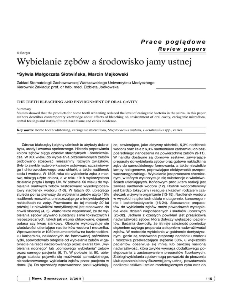 Prace poglądowe Review papers © Borgis Wybielanie zębów a środowisko jamy ustnej *Sylwia Małgorzata Słotwińska, Marcin Majkowski Zakład Stomatologii Zachowawczej Warszawskiego Uniwersytetu Medycznego Kierownik Zakładu: prof. dr hab. med. Elżbieta Jodkowska The teeth bleaching and environment of oral cavity Summary Studies showed that the products for home tooth whitening reduced the level of cariogenic bacteria in the saliva. In this paper authors describes contemporary knowledge about effects of bleaching on environment of oral cavity, cariogenic microflora, dental feelings and status of tooth hard tissue and caries incidence. Key words: home tooth whitening, cariogenic microflora, Streptococcus mutans, Lactobacillus spp., caries Zdrowe białe zęby i piękny uśmiech to atrybuty dobrobytu, urody i awansu społecznego. Historia poprawiania koloru zębów sięga czasów starożytnych i średniowiecza. W XIX wieku do wybielania przebarwionych zębów próbowano stosować mieszaniny różnych związków. Były to zwykle roztwory kwasów octowego, szczawiowego i chlorowodorowego oraz chlorki, a także nadtlenek sodu i wodoru. W 1895 roku do wybielenia zęba z martwą miazgą użyto chloru, a w roku 1918 wykorzystano działanie prądu i lampy UV. W połowie XX wieku do wybielania martwych zębów zastosowano wysokoprocentowy nadtlenek wodoru (1-3). W latach 60. ubiegłego stulecia po raz pierwszy do wybielania zębów użyto 10% nadtlenek mocznika, umieszczając go w indywidualnych nakładkach na zęby. Powrócono do tej metody 20 lat później i z niewielkimi modyfikacjami jest stosowana do chwili obecnej (4, 5). Warto także wspomnieć, że do wybielania zębów używano substancji silnie toksycznych i niebezpiecznych, takich jak wapno chlorowane, cyjanek potasu czy kwas siarkowy. Obecnie wykorzystuje się właściwości utleniające nadtlenków wodoru i mocznika. Wprowadzenie w 1989 roku materiałów na bazie nadtlenku karbamidu, nakładanych do formowanej próżniowo łyżki, spowodowało odejście od wybielania zębów w gabinecie na rzecz nadzorowanego przez lekarza tzw. „wybielania nocnego” lub „domowego wybielania” zębów przez samego pacjenta (6, 7). W połowie lat 90. ubiegłego stulecia pojawiła się możliwość samodzielnego, nienadzorowanego wybielania zębów przez pacjenta w domu (8). Do sprzedaży wprowadzono paski wybielają- N OWA S TOMATOLOGIA 3/2011 ce, zawierające, jako aktywny składnik, 5,3% nadtlenek wodoru oraz żele z 6,3% nadtlenkiem karbamidu do bezpośredniego nanoszenia na powierzchnię zębów (9-11). W handlu dostępne są domowe zestawy, zawierające preparaty do wybielania zębów oraz gotowe nakładki na zęby do samodzielnego formowania, a także niewielkie lampy halogenowe, poprawiające efektywność przeprowadzanego zabiegu. Wybielanie jest procesem chemicznym, w którym wykorzystuje się substancje o właściwościach utleniających. Końcowym produktem reakcji jest zawsze nadtlenek wodoru (12). Rodnik wodorotlenowy jest bardzo toksyczny i reaguje z każdym rodzajem cząsteczek w żywym organizmie (13-15). Nadtlenek wodoru w wysokich stężeniach działa mutagennie, kancerogennie i bakteriostatycznie (16-24). Stosowanie preparatów do wybielania zębów może powodować wystąpienie wielu działań niepożądanych i skutków ubocznych (25‑32). Jednym z częstych powikłań jest przejściowa nadwrażliwość zębów, która dotyczy większości pacjentów. Badania dowiodły, że istnieje zależność pomiędzy stężeniem użytego preparatu a stopniem nadwrażliwości zębów. W metodzie wybielania w gabinecie dentystycznym, gdzie są stosowane preparaty nadtlenku wodoru i mocznika przekraczające stężenie 30%, u większości pacjentów obserwuje się mniej lub bardziej nasiloną nadwrażliwość, która zwykle wymaga dodatkowego postępowania z zastosowaniem preparatów fluorkowych. Zabiegi wybielania zębów mogą prowadzić do pieczenia i/lub oparzenia błony śluzowej jamy ustnej, powstawania nadżerek szkliwa i zmian morfologicznych zęba oraz do 115 Sylwia Małgorzata Słotwińska, Marcin Majkowski uszkodzenia tkanek miękkich w wyniku złego używania lub nieprawidłowego dopasowania nakładki lub łyżki wybielającej; mogą także zaburzać równowagę środowiska mikroflory jamy ustnej (33-36). W piśmiennictwie opisano przypadek młodej osoby, u której stwierdzono liczne nadżerki szkliwne po wybielaniu zębów (37). Podczas zabiegu wybielania zębów dochodzi do rozpuszczania związków wapnia w szkliwie, zwiększenia porowatości i penetracji szkodliwych kwasów wgłąb szkliwa. Analiza z wykorzystaniem skaningowego mikroskopu elektronowego wykazała, że nadtlenek karbamidu o stężeniu 35% powoduje typowe chemiczne uszkodzenia szkliwa (38). Badania innych autorów potwierdziły szkodliwe działanie różnych preparatów wybielających na pryzmaty szkliwa (39-41). Po zastosowaniu preparatów wybielających zawierających nadtlenek karbamidu w stężeniach 10, 20 i 35% zaobserwowano zmniejszenie mikrotwardości szkliwa o 7,7%, w porównaniu do twardości początkowej (42). Uważa się, że zabieg wybielania zębów może powodować uszkodzenia zarówno w szkliwie, jak i w zębinie (43-47). W piśmiennictwie jest także wiele prac przedstawiających wyniki badań klinicznych, które wykazują, że stosowanie preparatów zawierających nadtlenek wodoru o umiarkowanym stężeniu jest zabiegiem bezpiecznym (48-52). Bardzo interesujące są badania oceniające przyleganie drobnoustrojów do powierzchni zęba po zabiegu wybielania. Stwierdzono różnice istotne statystycznie w adhezji do szkliwa bakterii z gatunku Streptococcus mutans przed zastosowaniem i po użyciu preparatu do wybielania zębów (53, 54). Stosowanie 30% nadtlenku wodoru powodowało istotny wzrost penetracji kanalików zębinowych przez bakterie Streptococcus faecalis (55). Oceniano również wpływ zabiegu wybielania zębów na materiały stosowane 
