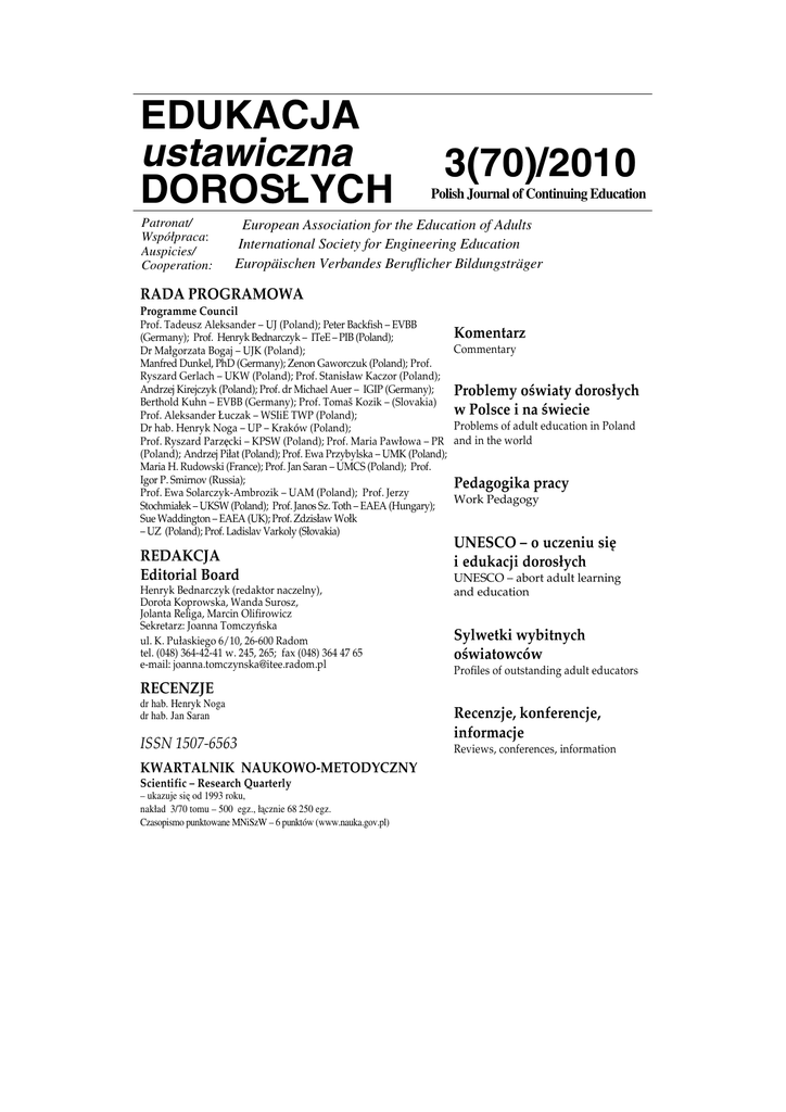 EDUKACJA ustawiczna DOROSŁYCH Patronat/ Współpraca: Auspicies/ Cooperation: 3(70)/2010 Polish Journal of Continuing Education European Association for the Education of Adults International Society for Engineering Education Europäischen Verbandes Beruflicher Bildungsträger RADA PROGRAMOWA Programme Council Prof. Tadeusz Aleksander – UJ (Poland); Peter Backfish – EVBB (Germany); Prof. Henryk Bednarczyk – ITeE – PIB (Poland); Dr Małgorzata Bogaj – UJK (Poland); Manfred Dunkel, PhD (Germany); Zenon Gaworczuk (Poland); Prof. Ryszard Gerlach – UKW (Poland); Prof. Stanisław Kaczor (Poland); Andrzej Kirejczyk (Poland); Prof. dr Michael Auer – IGIP (Germany); Berthold Kuhn – EVBB (Germany); Prof. Tomaš Kozik – (Slovakia) Prof. Aleksander Łuczak – WSIiE TWP (Poland); Dr hab. Henryk Noga – UP – Kraków (Poland); Prof. Ryszard Parzęcki – KPSW (Poland); Prof. Maria Pawłowa – PR (Poland); Andrzej Piłat (Poland); Prof. Ewa Przybylska – UMK (Poland); Maria H. Rudowski (France); Prof. Jan Saran – UMCS (Poland); Prof. Igor P. Smirnov (Russia); Prof. Ewa Solarczyk-Ambrozik – UAM (Poland); Prof. Jerzy Stochmiałek – UKSW (Poland); Prof. Janos Sz. Toth – EAEA (Hungary); Sue Waddington – EAEA (UK); Prof. Zdzisław Wołk – UZ (Poland); Prof. Ladislav Varkoly (Słovakia) REDAKCJA Editorial Board Henryk Bednarczyk (redaktor naczelny), Dorota Koprowska, Wanda Surosz, Jolanta Religa, Marcin Olifirowicz Sekretarz: Joanna Tomczyńska ul. K. Pułaskiego 6/10, 26-600 Radom tel. (048) 364-42-41 w. 245, 265; fax (048) 364 47 65 e-mail: [email protected] Komentarz Commentary Problemy oświaty dorosłych w Polsce i na świecie Problems of adult education in Poland and in the world Pedagogika pracy Work Pedagogy UNESCO – o uczeniu się i edukacji dorosłych UNESCO – abort adult learning and education Sylwetki wybitnych oświatowców Profiles of outstanding adult educators RECENZJE dr hab. Henryk Noga dr hab. Jan Saran ISSN 1507-6563 KWARTALNIK NAUKOWO-METODYCZNY Scientific – Research Quarterly – ukazuje się od 1993 roku, nakład 3/70 tomu – 500 egz., łącznie 68 250 egz. Czasopismo punktowane MNiSzW – 6 punktów (www.nauka.gov.pl) Recenzje, konferencje, informacje Reviews, conferences, information W czasopiśmie przedstawiono oryginalne własne poglądy Autorów, które nie zawsze podziela redakcja, wydawcy i EAEA, IGiP, EVBB BIBLIOTEKA PEDAGOGIKI PRACY – monograficzna seria wydawnicza pod redakcją naukową prof. dr. hab. Henryka Bednarczyka ukazuje się od 1987 roku – 236 t.; 165 100 egz. Kontynuuje tradycje serii: Biblioteka Kształcenia Zawodowego (32 t. lata 1977–1989) i cyklu materiałów: Szkoła – Zawód – Praca (11 t. lata 1976–1987) Recenzenci numeru: dr hab. Henryk Noga dr hab. Jan Saran Tłumaczenia: Język angielski – Małgorzata Kacprzak, Katarzyna Skoczylas © Copyright by Instytut Technologii Eksploatacji – PIB, Radom 2010 Na okładce wykorzystano zdjęcie z Głosu Nauczycielskiego Redaktor prowadzący: Joanna Tomczyńska Opracowanie wydawnicze: Joanna Fundowicz, Bożena Mazur Wydawnictwo Naukowe Instytutu Technologii Eksploatacji – Państwowego Instytutu Badawczego ul. K. Pułaskiego 6/10, 26-600 Radom, tel. (048) 364-42-41, fax (048) 364-47-65 e-mail: [email protected] http://www.itee.radom.pl 2141 2 POLISH JOURNAL of CONTINUING EDUCATION 3/2010 70 3(70)/2010 Komentarz Otwarte zasoby edukacji wobec globalnych problemów edukacji – Henryk Bednarczyk .............................................................................................. 5 Problemy oświaty dorosłych w Polsce i na świecie Andrzej Bogaj: Współczesne wyzwania edukacyjne ......................................... Waldemar Furmanek: Edukacyjne wyzwania nowej stratyfikacji społecznej ....... Agnieszka Kozerska: Proces samokształcenia w ujęciu W. Okińskiego .......... Małgorzata Kacprzak: Regionalne strategie kształcenia ustawicznego zorientowane na gospodarkę ...................................................................................... e-learning – edukacja, technologia, nowoczesność 7 15 26 32 38 Pedagogika pracy Zygmunt Wiatrowski: Podstawowe teorie w obszarze pedagogiki pracy (cz. II).... Wiesław Sikorski: Skuteczna komunikacja interpersonalna w pracy ................ Marta Czechowska-Bieluga: Płeć a poczucie jakości życia przedsiębiorców Jerzy Ambroży: Kształtowanie oferty edukacyjnej dla osób dorosłych – możliwości i bariery ....................................................................................................... Grażyna Cęcelek: Profesja doradcy zawodowego ważnym ogniwem w procesie kształtowania osobowości współczesnego pracownika .............................. 39 46 56 65 74 UNESCO – o uczeniu się i edukacji dorosłych Henryk Bednarczyk: Inspiracje globalnych analiz edukacji dorosłych UNESCO ................................................................................................................. Ramowy plan działania z Bélem ............................................................................ Paul Bélanger: Od słów do czynów ..................................................................... 84 95 103 Sylwetki wybitnych oświatowców Patricia Cranton ...................................................................................................... Marek Golka ............................................................................................................ EDUKACJA ustawiczna DOROSŁYCH 3/2010 109 111 3 Recenzje, konferencje, informacje XII Letnia Szkoła Młodych Andragogów, Zielona Góra, 24–27 maja 2010 – Michał Mielczarek ............................................................................................... Międzynarodowa konferencja naukowa, XIII Didmattech 2010 – Tomasz Sułkowski ...................................................................................................................... Krzysztof Linowski: Warunk