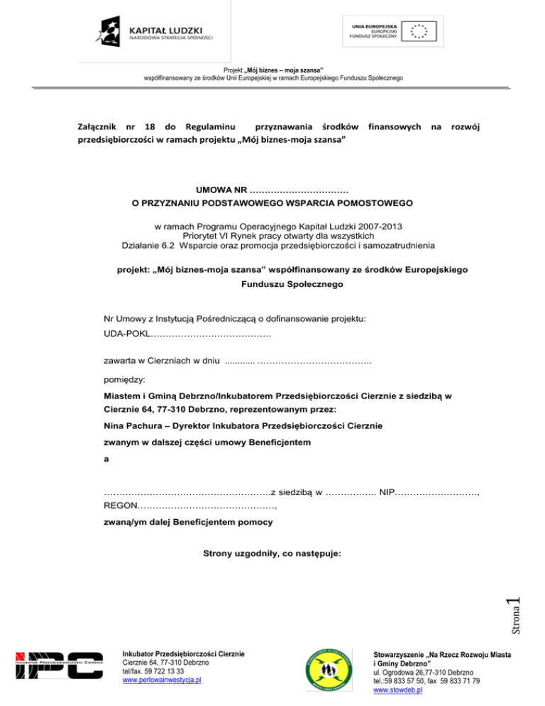 Projekt „Mój biznes – moja szansa” współfinansowany ze środków Unii Europejskiej w ramach Europejskiego Funduszu Społecznego Załącznik nr 18 do Regulaminu przyznawania środków finansowych na rozwój przedsiębiorczości w ramach projektu „Mój biznes-moja szansa” UMOWA NR …………………………… O PRZYZNANIU PODSTAWOWEGO WSPARCIA POMOSTOWEGO w ramach Programu Operacyjnego Kapitał Ludzki 2007-2013 Priorytet VI Rynek pracy otwarty dla wszystkich Działanie 6.2 Wsparcie oraz promocja przedsiębiorczości i samozatrudnienia projekt: „Mój biznes-moja szansa” współfinansowany ze środków Europejskiego Funduszu Społecznego Nr Umowy z Instytucją Pośredniczącą o dofinansowanie projektu: UDA-POKL…………………………………. zawarta w Cierzniach w dniu ............ ……………………………….. pomiędzy: Miastem i Gminą Debrzno/Inkubatorem Przedsiębiorczości Cierznie z siedzibą w Cierznie 64, 77-310 Debrzno, reprezentowanym przez: Nina Pachura – Dyrektor Inkubatora Przedsiębiorczości Cierznie zwanym w dalszej części umowy Beneficjentem a ……………………………………………….z siedzibą w …………….. NIP………………………, REGON………………………………………, zwaną/ym dalej Beneficjentem pomocy Strona 1 Strony uzgodniły, co następuje: Inkubator Przedsiębiorczości Cierznie Cierznie 64, 77-310 Debrzno tel/fax. 59 722 13 33 www.perlowainwestycja.pl Stowarzyszenie „Na Rzecz Rozwoju Miasta i Gminy Debrzno” ul. Ogrodowa 26,77-310 Debrzno tel.:59 833 57 50, fax 59 833 71 79 www.stowdeb.pl Projekt „Mój biznes – moja szansa” współfinansowany ze środków Unii Europejskiej w ramach Europejskiego Funduszu Społecznego § 1 – Przedmiot umowy 1. Przedmiotem niniejszej Umowy jest udzielenie przez Beneficjenta podstawowego wsparcia pomostowego, przeznaczonego na wspomaganie Beneficjenta pomocy w pierwszych sześciu miesiącach od dnia podpisania niniejszej umowy, zgodnie z wnioskiem Beneficjenta pomocy stanowiącym załącznik do niniejszej umowy. 2. W ramach podstawowego wsparcia pomostowego Beneficjenta pomocy otrzyma wsparcie finansowe, o którym mowa w § 3 pkt. 1 3. Pomoc będąca przedmiotem niniejszej Umowy jest udzielana w oparciu o zasadę de minimis, zgodnie z art. 33 ust. 1 pkt. 3 Rozporządzenia Ministra Rozwoju Regionalnego z dnia 15 grudnia 2010 r. w sprawie udzielania pomocy publicznej w ramach Programu Operacyjnego Kapitał Ludzki, zwanym dalej „rozporządzeniem”. 4. Beneficjent pomocy otrzymuje podstawowe wsparcie pomostowe na zasadach i warunkach określonych w niniejszej Umowie oraz w Regulaminie przyznawania środków finansowych na rozwój przedsiębiorczości w ramach projektu „Mój biznes-moja szansa”, który stanowi integralną cześć umowy . 5. Beneficjent pomocy przyjmuje podstawowe wsparcie pomostowe i zobowiązuje się do jego wykorzystania na własną odpowiedzialność. § 2 - Okres udzielania podstawowego wsparcia pomostowego 1. Podstawowe wsparcie pomostowe udzielane jest przez okres pierwszych sześciu 2 3 miesięcy od dnia podpisania niniejszej umowy tj. od dnia ……………………..… do dnia ……………………..……… . § 3 - Finansowanie wsparcia pomostowego 1. Całkowita kwota pomocy na podstawowe wsparcie pomostowe wynosi 9 000,00 PLN (słownie: sześć tysięcy złotych). 2. Beneficjent wypłaci Beneficjentowi pomocy środki, o których mowa w ust. 1 w miesięcznych transzach w wysokości 1 500,00 PLN (słownie: jeden tysiąc pięćset złotych). 3. Płatności będą dokonywane w terminie 14 dni licząc od dnia podpisania niniejszej umowy (dotyczy pierwszej transzy wsparcia) oraz w terminie 14 dni licząc od dnia dostarczenia do siedziby Beneficjenta dokumentów potwierdzających opłacenia składek na ubezpieczenia społeczne i zdrowotne przez Beneficjenta pomocy. 2 Dzień podpisania umowy o przyznaniu podstawowego wsparcia pomostowego. Należy określić dzień poprzedzający dzień, w którym upływa 6 miesiąc od dnia podpisania umowy o przyznaniu podstawowego wsparcia pomostowego. 3 Inkubator Przedsiębiorczości Cierznie Cierznie 64, 77-310 Debrzno tel/fax. 59 722 13 33 www.perlowainwestycja.pl 2 W przypadku, gdy w przekazywaniu płatności wystąpią opóźnienia z przyczyn niezależnych od Beneficjenta, Beneficjentowi pomocy nie przysługuje prawo domagania się odsetek za opóźnioną płatność. Strona 4. Stowarzyszenie „Na Rzecz Rozwoju Miasta i Gminy Debrzno” ul. Ogrodowa 26,77-310 Debrzno tel.:59 833 57 50, fax 59 833 71 79 www.stowdeb.pl Projekt „Mój biznes – moja szansa” współfinansowany ze środków Unii Europejskiej w ramach Europejskiego Funduszu Społecznego 5. W przypadku wystąpienia opóźnień w przekazywaniu płatności, o których mowa w ust 4, przekraczających 14 dni, Beneficjent obowiązany jest niezwłocznie poinformować Beneficjenta pomocy, w formie pisemnej, o przyczynach opóźnień i prognozie przekazania płatności. 8. Beneficjent w dniu podpisania niniejszej Umowy zobowiązany jest wydać Beneficjentowi pomocy zaświadczenie o udzielonej pomocy de minimis, zgodnie ze wzorem określonym w załączniku do Rozporządzenia Rady Ministrów z dnia 20 marca 2007 r. w sprawie zaświadczeń o pomocy de minimis i pomocy de minimis w rolnictwie lub rybołówstwie (Dz. U. z 2007r., Nr 53, poz. 354 z późn. zm.). 9. Wszystkie płatności będą dokonywane przez Beneficjenta w polskich złotych na rachunek Beneficjenta pomocy prowadzony w złotych polskich. 10. Płatności będą dokonywane na rachunek bankowy Beneficjenta pomocy nr…………………………………………………………………………………………………..……… …… ……………………………………………………………………………………………………… prowadzony banku………………………………………………………….…………