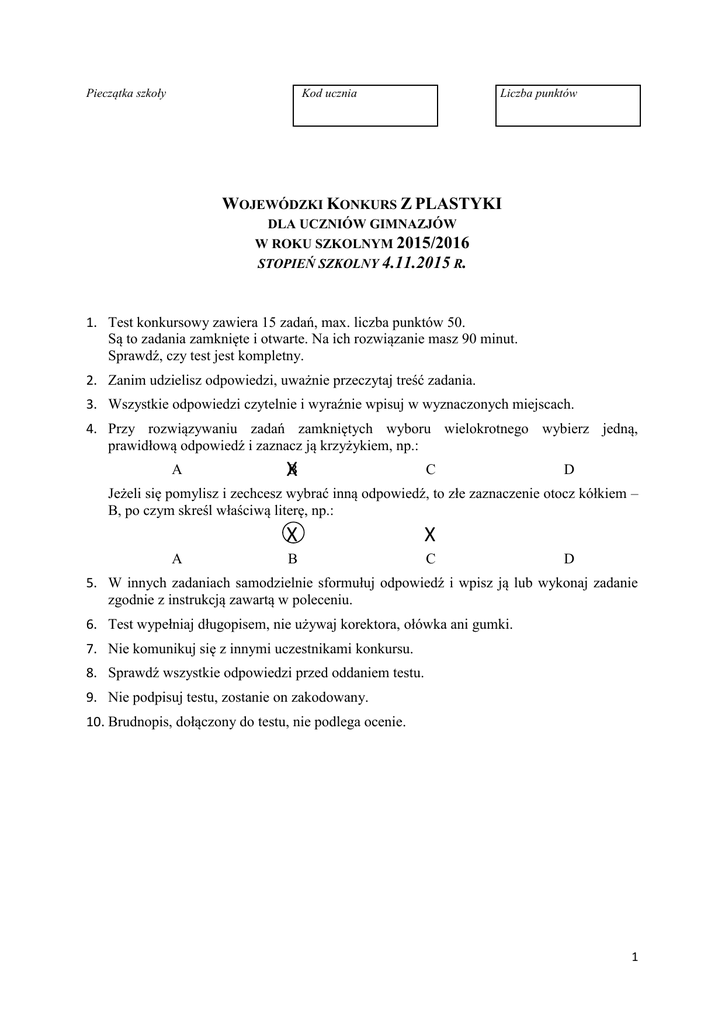 Pieczątka szkoły Liczba punktów Kod ucznia WOJEWÓDZKI KONKURS Z PLASTYKI DLA UCZNIÓW GIMNAZJÓW W ROKU SZKOLNYM 2015/2016 STOPIEŃ SZKOLNY 4.11.2015 R. 1. Test konkursowy zawiera 15 zadań, max. liczba punktów 50. Są to zadania zamknięte i otwarte. Na ich rozwiązanie masz 90 minut. Sprawdź, czy test jest kompletny. 2. Zanim udzielisz odpowiedzi, uważnie przeczytaj treść zadania. 3. Wszystkie odpowiedzi czytelnie i wyraźnie wpisuj w wyznaczonych miejscach. 4. Przy rozwiązywaniu zadań zamkniętych wyboru wielokrotnego wybierz jedną, prawidłową odpowiedź i zaznacz ją krzyżykiem, np.: A XB C D Jeżeli się pomylisz i zechcesz wybrać inną odpowiedź, to złe zaznaczenie otocz kółkiem – B, po czym skreśl właściwą literę, np.: A X X B C D 5. W innych zadaniach samodzielnie sformułuj odpowiedź i wpisz ją lub wykonaj zadanie zgodnie z instrukcją zawartą w poleceniu. 6. Test wypełniaj długopisem, nie używaj korektora, ołówka ani gumki. 7. Nie komunikuj się z innymi uczestnikami konkursu. 8. Sprawdź wszystkie odpowiedzi przed oddaniem testu. 9. Nie podpisuj testu, zostanie on zakodowany. 10. Brudnopis, dołączony do testu, nie podlega ocenie. 1 Zadanie 1. (3 p.) Podaj nazwę sceny – motywu ikonograficznego w słynnych dziełach o tematyce religijnej. 1. Michał Anioł Buonarotti, ściana Kaplicy Sykstyńskiej w Rzymie ………………………………………………………………. 2. Leonardo da Vinci, ściana refektarza klasztoru Santa Maria Della Grazie w Mediolanie. ………………………………………………………………. 3. Tommaso Masaccio, fresk we wnętrzu Kościoła Santa Maria Novella we Florencji. …………………………………………………………………….. Zadanie 2. (4 p.) Dopasuj do prac technikę, w jakiej zostały wykonane. Autor Dzieło Technika Rembrandt Pejzaż z miłosiernym Samarytaninem Stanisław Wyspiański Śpiący Staś Rafael Santi Szkoła Ateńska Stanisław Wyspiański Bóg Ojciec - Stań się! Pomoc – wybierz: akwaforta, drzeworyt, witraż, tempera, pastel, fresk, farba olejna na desce Zadanie 3. (3 p.) Napisz dla jakiego stylu lub kręgu kulturowego charakterystyczne są wymienione elementy architektoniczne: 1. Maswerk…………………………………………………….… 2. Kolumna dorycka…….……………………………………….. 3. Sklepienie krzyżowo - żebrowe……………………………….. Zadanie 4. (4 p.) Uporządkuj dzieła architektoniczne w porządku chronologicznym przypisując cyfrę 1 pracy najstarszej, zaś 4 przy pracy, która powstała najbliżej naszych czasów. Przykład architektoniczny Chronologia Bazylika San Lorenzo we Florencji San Vitale w Rawennie Piramida Cheopsa w Gizie Bazylika w Vierzehnheiligen w Niemczech 2 Zadanie 5. (4 p.) Do podanych dat dopasuj odpowiednią rzeźbę. Wiek V w. p. n. e. Rzeźba 1574-82 r. ok. XXVI w. p.n.e. ok. 1400 – 1410 r. Madonna z Krużlowej, Triada Króla Mykerinosa, Doryforos - Polikleta, Porwanie Sabinek – Giambologna Zadanie 6. (5 p.) Dopasuj do budynków ich cenne wyposażenie. Kościół san Vitale w Rawennie Katedra w Gnieźnie Kościół Św. Trójcy w Strzelnie Kościół w Naumburgu Kolegiata w Wiślicy 1. kolumny cnót i przywar; 2. płyta orantów – posadzka z rytymi przedstawieniami osób w geście modlitwy; 3. mozaika Cesarzowej Teodory z dworem; 4. rzeźby fundatorów – książąt niemieckich; 5. drzwi brązowe przedstawiające historię św. Wojciecha. Zadanie 7. (5 p.) Podaj nazwiska polskich autorów wymienionych dzieł. 1. Dziewczynka z chryzantemami…………………………………… 2. Kobieta czesząca włosy…………………………………………… 3. Na tle witrażu. Paw ………………………………………………. 4. Introdukcja………………………………………………………… 5. Szał………………………………………………………………… 3 Zadanie 8. (7 p.) Uzupełnij tabelkę. Nazwisko autora tytuł Burza Rembrandt styl/kierunek renesans Lekcja anatomii dr Tulpa Wolność wiodąca lud na barykady romantyzm Katedra w Rouen impresjonizm David Przysięga Horacjuszy Fragonard Huśtawka Plafon w kościele św. Ignacego w Rzymie barok Zadanie 9. (5 p.) Wybierz właściwe nazwiska artystów. Dopasuj je do kierunków z jakimi związali swoją drogę twórczą. Nazwa kierunku nazwisko Formizm Ekspresjonizm Futuryzm Surrealizm Pop art S. Dali; R. Lichtenstein; Witkacy; E. Nolde; G. Balla Zadanie 10. (1p.) Na podstawie niżej podanych cech architektury określ styl, o którym mowa w opisie. Najbardziej niezwykłe pod względem kształtów i ozdób budowle wznosił w Hiszpanii, przede wszystkim w Barcelonie. Faliste linie fasad, ozdoby w kształcie przedziwnych narośli roślinnych na nieregularnie łamanych dachach, pokrytych barwną ceramiką, to wszystko stawia Antonia Gaudiego w rzędzie wybitnych twórców architektury przełomu XIX i XX wieku. .................................................................................................. nazwa stylu w architekturze, o którym mowa w opisie 4 Zadanie 11. (2 p.) Podaj tytuł prezentowanego dzieła oraz styl jaki reprezentuje. tytuł: ………………………………………………………… styl: ………………………………………………………… Zadanie 12. (1 p.) Podaj nazwisko autora poniżej przedstawionego dzieła. ……………………………………… Zadanie 13. (1 p.) Podaj nazwisko artysty, który uważał, że ze zwykłego przedmiotu można uczynić dzieło sztuki. ………………………………………………….. 5 Zadanie 14. (3 p.) Do opisów znanych obrazów dobierz nazwiska twórców oraz tytuły spośród wymienionych niżej nazwisk i tytułów. Zwróć uwagę, że tytułów i nazwisk jest więcej niż opisanych obrazów. Tytus Czyżewski - Zbójnik; Stanisław Ignacy Witkiewicz - Kompo