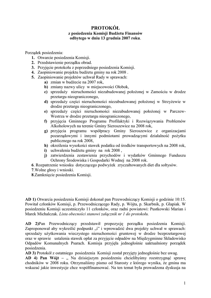 PROTOKÓŁ z posiedzenia Komisji Budżetu Finansów odbytego w dniu 13 grudnia 2007 roku. Porządek posiedzenia: 1. Otwarcie posiedzenia Komisji. 2. Przedstawienie porządku obrad. 3. Przyjęcie protokołu z poprzedniego posiedzenia Komisji. 4. Zaopiniowanie projektu budżetu gminy na rok 2008 . 5. Zaopiniowanie projektów uchwał Rady w sprawach: a) zmian w budżecie na 2007 rok, b) zmiany nazwy ulicy w miejscowości Ołobok, c) sprzedaży nieruchomości niezabudowanej położonej w Zamościu w drodze przetargu nieograniczonego, d) sprzedaży części nieruchomości niezabudowanej położonej w Strzyżewie w drodze przetargu nieograniczonego, e) sprzedaży części nieruchomości niezabudowanej położonej w ParczewWestrza w drodze przetargu nieograniczonego, f) przyjęcia Gminnego Programu Profilaktyki i Rozwiązywania Problemów Alkoholowych na terenie Gminy Sieroszewice na 2008 rok, g) przyjęcia programu współpracy Gminy Sieroszewice z organizacjami pozarządowymi i innymi podmiotami prowadzącymi działalność pożytku publicznego na rok 2008, h) określenia wysokości stawek podatku od środków transportowych na 2008 rok, i) uchwalenia budżetu gminy na rok 2008 , j) zatwierdzenia zestawienia przychodów i wydatków Gminnego Funduszu Ochrony Środowiska i Gospodarki Wodnej na 2008 rok. 6. Rozpatrzenie wniosku dotyczącego podwyżek zryczałtowanych diet dla sołtysów. 7.Wolne głosy i wnioski. 8.Zamknięcie posiedzenia Komisji. AD 1) Otwarcia posiedzenia Komisji dokonał pan Przewodniczący Komisji o godzinie 10:15. Powitał członków Komisji, p. Przewodniczącego Rady, p. Wójta, p. Skarbnik, p. Glapiak. W posiedzeniu Komisji uczestniczyło 11 członków, oraz radni powiatowi: Pustkowski Marian i Marek Michalczak. Lista obecności stanowi załącznik nr 1 do protokołu. AD 2)Pan Przewodniczący przedstawił propozycję porządku posiedzenia Komisji. Zaproponował aby wykreślić podpunkt „i” i wprowadzić dwa projekty uchwał w sprawach: sprzedaży użytkowania wieczystego nieruchomości gruntowej w drodze bezprzetargowej oraz w sprawie ustalenia stawek opłat za przyjęcie odpadów na Międzygminne Składowisko Odpadów Komunalnych Psarach. Komisja przyjęła jednogłośnie uaktualniony porządek posiedzenia. AD 3) Protokół z ostatniego posiedzenia Komisji został przyjęty jednogłośnie bez uwag. AD 4) Pan Wójt – „ Na dzisiejszym posiedzeniu chcielibyśmy rozstrzygnąć sprawę chodników w 2008 roku. Otrzymaliśmy pismo od Starosty z którego wynika, że gmina ma wskazać jakie inwestycje chce współfinansować. Na ten temat była prowadzona dyskusja na 1 Komisji Rolnictwa Rozwoju Gospodarczego i Infrastruktury, która wytypowała do realizacji trzy zadania: dokończenie budowy chodnika w Masanowie, budowę chodnika od skrzyżowania w Rososzycy do cmentarza, budowę chodnika w Sieroszewicach w kierunku Rososzycy. Zwrócił się z pytaniem do radnych powiatowych, czy jest szansa na wprowadzenie więcej niż jednego zadania z wyżej wymienionych ? P.Marek Michalczak- Wyjaśnił ,że w przyszłym roku planowana jest budowa drogi powiatowej Rososzyca- Skalmierzyce oraz budowa chodnika z Rososzycy do cmentarza . Natomiast sprawa budowy parkingu przy szkole w Rososzycy oraz odprowadzenia wody zależeć będzie od uchwalonych środków finansowych .w budżecie powiatu. P.Wójt- Zapytał , czy droga do Skalmierzyc będzie budowana z udziałem środków unijnych i odkąd będzie robiona? P.Marek Michalczak – Odpowiedział, że budowa zostanie rozpoczęta od Rososzycy i będzie robiona z udziałem środków unijnych. P.Marian Pustkowski- Poinformował, że nie jest w planie budowa drogi w Ołoboku oraz do Sławina. „Zostało spowodowane tym ,że nie wpłynęły środki unijne i została zablokowana budowa drogi Raszków –Koryta. Skoro gmina decyduje się , aby dać 100 tys. zł. na budowę chodników , to należałoby najpierw zakończyć inwestycję w Masanowie. W ubiegłym roku było zaplanowanych 450 tys. zł. na budowę chodników, a w tym roku jest 750 tys. zł .Jest taka zasada ,że należy się wspólnie wspierać . Dobrze się stało ,że została wykonana inwestycja dot. budowy chodnika w Parczewie w kierunku Sieroszewic. Dużo środków z budżetu Powiatu jest przeznaczane na domy pomocy społecznej oraz szpitale. Jest to wyścig z czasem , bo jeżeli dana jednostka nie będzie mieć wymaganego standardu , to będą odchodzić z pracy lekarze i pielęgniarki oraz nie będą przychodzić pacjenci. Wracając do budowy chodników , to najpierw musi być dokończona inwestycja w Masanowie , a jeżeli zostanie trochę środków , to być może zostanie rozpoczęta budowa chodnika od Rososzycy do cmentarza. Swoją opinię uzasadnił w ten sposób ,że w Rososzycy jest kościół i chodzą kondukty pogrzebowe na cmentarz. W związku z tym chodnik przy drodze powiatowej w Rososzycy jest potrzebny , aby poprawić bezpieczeństwo.” P.Przewodniczący Komisji- Poinformował , że jest po spotkaniu z p. Starostą i wiadomo, że ruch na tej drodze jest największy biorąc pod uwagę wszystkie drogi powiatowe. To ,że chodnik trzeba budować , to nie ulega wątpliwości, ale jest pytanie z której strony rozpoczynać budowę. Na drodze tej były dwa wypadki , w ostatnim czasie został potracony pieszy. Zostało wystosowane pismo do p. Starosty od Rady Sołeckiej wsi Sieroszewice oraz od radnych Gminy z Sieroszewic oraz Rososzycy. P.Kazimierz Kowalski- Poinformował, że na odcinku od Sieroszewic w kierunku Rososzycy mieszkają 22 rodziny i uzasadniona byłaby budowa chodnika na tym właśnie odcinku z uwagi na to ,że dzieci chodzą i jeżdżą rowerami do szkoły .Brak chodnika zagraża bezpieczeństwu dzieci. P.Przewodniczący Komisji - Stwierdził ,że Rada daje sygnał, bo w budżecie gminy na 2008 rok zaplanowane jest 100 tys. zł.na budowę chodników.Zwrócił się z pytaniem do radnych powiatowych , czy wszystkie gminy dokładają do budowy chodników przy 