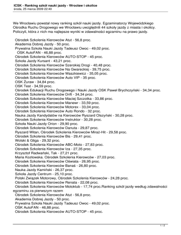 ICSK - Ranking szkół nauki jazdy - Wrocław i okolice środa, 25 marca 2009 22:40 We Wrocławiu powstał nowy ranking szkół nauki jazdy. Egzaminatorzy Wojewódzkiego Ośrodka Ruchu Drogowego we Wrocławiu uwzględnili 44 szkoły jazdy z miasta i okolicy. Policzyli, która z nich ma najlepsze wyniki w zdawalności egzaminu na prawo jazdy. Ośrodek Szkolenia Kierowców Atut - 56,8 proc. Akademia Dobrej Jazdy - 50 proc. Prywatna Szkoła Nauki Jazdy Tadeusz Owoc - 49,02 proc. OSK AutoFAN - 46,88 proc. Ośrodek Szkolenia Kierowców AUTO-STOP - 45 proc. Szkoła Jazdy Kursant - 43,21 proc. Ośrodek Szkolenia Kierowców Szerokiej Drogi - 40,48 proc. Ośrodek Szkolenia Kierowców Na Gwareckiej - 39,75 proc. Ośrodek Szkolenia Kierowców Waszkiewicz - 35,05 proc. Ośrodek Szkolenia Kierowców Auto VIP - 35 proc. OSK Żuraw - 34,84 proc. OSK Test - 34,59 proc. Ośrodek Edukacji Ruchu Drogowego i Nauki Jazdy OSK Paweł Brychczyński - 34,34 proc. Ośrodek Szkolenia Kierowców Drift - 34,34 proc. Ośrodek Szkolenia Kierowców Maciej Szczotka - 33,86 proc. Ośrodek Szkolenia Kierowców Manewr - 33,59 proc. Ośrodek Szkolenia Kierowców Motorex - 33,04 proc. Ośrodek Szkolenia Kierowców Auto Rondo - 32 proc. Nauka Jazdy Kandydatów na Kierowców Ryszard Olszyński - 30,28 proc. Ośrodek Szkolenia Kierowców Instruktor - 30,28 proc. Szkoła Nauki Jazdy Orion - 29,90 proc. Ośrodek Szkolenia Kierowców Danuta - 29,87 proc. Ryszard Witan, Ośrodek Szkolenia Kierowców Miraż-Hit - 29,58 proc. Ośrodek Szkolenia Kierowców Bis - 29,41 proc. Wolski & Gliga - 29,32 proc. Ośrodek Szkolenia Kierowców ABC-Moto - 27,83 proc. Ośrodek Szkolenia Kierowców Iza - 27,35 proc. Krzysztof Radwański, Tak - 27,21 proc. Maria Kozłowska. Ośrodek Szkolenia Kierowców - 27,03 proc. Ośrodek Szkolenia Kierowców Oświata - 26,95 proc. Ośrodek Szkolenia Kierowców Banaś - 26,80 proc. Nauka Jazdy Kamiński - 26,37 proc. Szkoła Jazdy Centrum - 25,10 proc. Polski Związek Motorowy, Ośrodek Szkolenia Kierowców - 24,28 proc. Ośrodek Szkolenia Kierowców Renata - 22,08 proc. Ośrodek Szkolenia Kierowców Motoklub - 17,74 proc.Ranking szkół jazdy według zdawalności egzaminu za pierwszym razem Ośrodek Szkolenia Kierowców Atut - 56,8 proc. Akademia Dobrej Jazdy - 50 proc. Prywatna Szkoła Nauki Jazdy Tadeusz Owoc - 49,02 proc. OSK AutoFAN - 46,88 proc. Ośrodek Szkolenia Kierowców AUTO-STOP - 45 proc. 1/2 ICSK - Ranking szkół nauki jazdy - Wrocław i okolice środa, 25 marca 2009 22:40 Szkoła Jazdy Kursant - 43,21 proc. Ośrodek Szkolenia Kierowców Szerokiej Drogi - 40,48 proc. Ośrodek Szkolenia Kierowców Na Gwareckiej - 39,75 proc. Ośrodek Szkolenia Kierowców Waszkiewicz - 35,05 proc. Ośrodek Szkolenia Kierowców Auto VIP - 35 proc. OSK Żuraw - 34,84 proc. OSK Test - 34,59 proc. Ośrodek Edukacji Ruchu Drogowego i Nauki Jazdy OSK Paweł Brychczyński - 34,34 proc. Ośrodek Szkolenia Kierowców Drift - 34,34 proc. Ośrodek Szkolenia Kierowców Maciej Szczotka - 33,86 proc. Ośrodek Szkolenia Kierowców Manewr - 33,59 proc. Ośrodek Szkolenia Kierowców Motorex - 33,04 proc. Ośrodek Szkolenia Kierowców Auto Rondo - 32 proc. Nauka Jazdy Kandydatów na Kierowców Ryszard Olszyński - 30,28 proc. Ośrodek Szkolenia Kierowców Instruktor - 30,28 proc. Szkoła Nauki Jazdy Orion - 29,90 proc. Ośrodek Szkolenia Kierowców Danuta - 29,87 proc. Ryszard Witan, Ośrodek Szkolenia Kierowców Miraż-Hit - 29,58 proc. Ośrodek Szkolenia Kierowców Bis - 29,41 proc. Wolski & Gliga - 29,32 proc. Ośrodek Szkolenia Kierowców ABC-Moto - 27,83 proc. Ośrodek Szkolenia Kierowców Iza - 27,35 proc. Krzysztof Radwański, Tak - 27,21 proc. Maria Kozłowska. Ośrodek Szkolenia Kierowców - 27,03 proc. Ośrodek Szkolenia Kierowców Oświata - 26,95 proc. Ośrodek Szkolenia Kierowców Banaś - 26,80 proc. Nauka Jazdy Kamiński - 26,37 proc. Szkoła Jazdy Centrum - 25,10 proc. Polski Związek Motorowy, Ośrodek Szkolenia Kierowców - 24,28 proc. Ośrodek Szkolenia Kierowców Renata - 22,08 proc. Ośrodek Szkolenia Kierowców Motoklub - 17,74 proc. 2/2