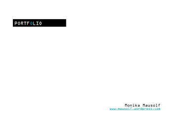 PORTFO PORTFOLIO Monika Mausolf www.mausolf.wordpress.com BIO Monika Mausolf (1986) – absolwentka Wydziału Sztuk Pięknych UMK w Toruniu, w 2010 roku obroniła z wyróżnieniem dyplom na kierunku malarstwo w pracowni prof. Lecha Wolskiego. W roku 2013 uzyskała dyplom licencjacki w Katedrze Historii Sztuki i Kultury UMK. Na swoim koncie posiada szereg wystaw indywidualnych i grupowych zarówno w Polsce m.in. Warszawa, Poznań, Toruń, Koszalin jak i za granicą (Berlin, Kassel, Bilbao, Niš). Wystawy: • Ogólnopolska Wystawa Malarstwa, Rysunku i Grafiki, Galeria ZPAP Olsztyn, listopad 2008 • Relikty cywilizacji, Hala Pomp, Stacja Pomp „Stare Bielany” - indywidualna wystawa malarstwa, Toruń, lipiec 2010 • Cyber Human Forms, Unknown Artist Virtual Museum, międzynarodowa wystawa , kurator: José Vieira, październik 2010 • I am abnormal 2, Abnormals Gallery , Berlin, grudzień 2010 • Relikty cywilizacji, wystawa w ramach prezentacji Dyplomów 2010, Centrum Sztuki Współczesnej, Toruń, styczeń 2011 • I am abnormal 2, Abnormals Gallery , Poznań, styczeń 2011 • Fumetti, Dwór Mieszczański, indywidualna wystawa , Toruń, sierpień 2011 • From F.stories, Galeria Sztuki Wozownia, indywidualna wystawa, kuratorka: Katarzyna Lewandowska, Toruń, listopad 2011 • Cuentos de F., Epelde – Mardaras Galeria , indywidualna wystawa, Bilbao, czerwiec 2012 • Werkstatt Kassel, indywidualna wystawa malarstwa, Kassel sierpień/ wrzesień 2012 • Rury, Galeria 011, indywidualna wystawa, Toruń, maj 2013 • Mdłości, Galeria Sztuki Wozownia, kuratorka: Marta Smolińska, Toruń, styczeń 2014 • Mdłości, ASP Gdańsk, kuratorka: Marta Smolińska, marzec 2014 FUMETTI projekt Tuli olej na płótnie (2009) 110x100 FUMETTI projekt Prater Mitzi olej na desce (2009) 67x81 FUMETTI projekt Spó niony Spóźniony zapłon zap on olej na płótnie (2009) 25x30 FUMETTI projekt Feed the world olej na płótnie (2009) 30x40 FUMETTI projekt Gwó dź programu Gwóźd olej na płycie (2009) 62x80 FUMETTI projekt La vie est un voyage olej na płycie (2009) 40x56 FUMETTI projekt Greyhoundy olej na płycie (2009) 20x30 szczegóły projektu oraz pozostałe prace: http://mausolf.wordpress.com/projects/fumetti/ Po tobie olej na płycie (2012) 70x55 SWINGS projekt Light my fire olej na płótnie (2009) 73x92 SWINGS projekt Bezgłowy Bezg owy olej na płótnie (2010) 65x70 SWINGS projekt Das Narrenschiff olej na płótnie (2012) 60x90 SWINGS projekt Obieg technika mieszana na płycie(2013) 90x170 szczegóły projektu oraz pozostałe prace : http://mausolf.wordpress.com/projects/swings/ Mdłości, zdjęcia obiektów z wystawy, obraz: Portret Barbary U. Galeria Sztuki Wozownia, Toruń 2014, kuratorka: Marta Smolińska SWINGS - obiekty From F. stories projekt szczegóły projektu : http://mausolf.wordpress.com/projects/from-f-stories/ 10 rysunków na tekturze 2012 format A$ From F. stories projekt From F. stories, zdjęcia obiektów z wystawy, Galeria Sztuki Wozownia, Torun 2011, kuratorka:K. Lewandowska http://wozownia.pl/exposureid167-27,26-Monika_Mausolf_-_From_F_Stories PRECREATIONS projekt szczegóły projektu: http://mausolf.wordpress.com/projects/precreations-project/ 14 fotofrafii, druk cyfrowy Bric a Brac RELIKTY projekt (praca dyplomowa) 12 płyt format 95x250cm, technika mieszana szczegóły projektu: http://mausolf.wordpress.com/projects/relikty-the-artefacts/