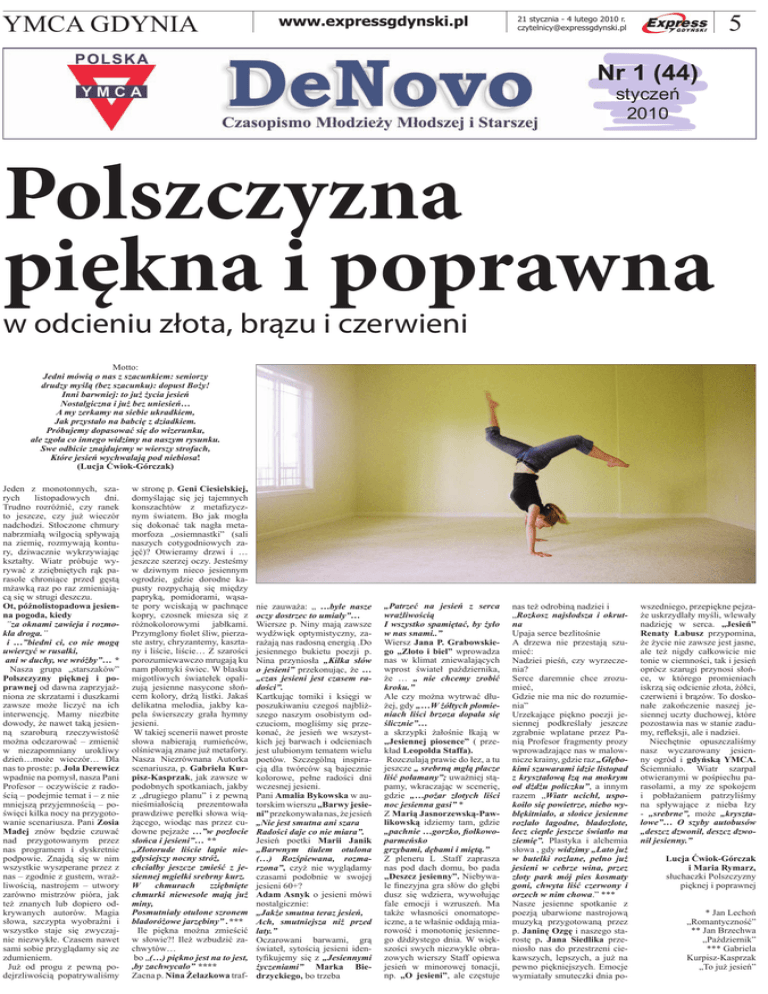 YMCA GDYNIA www.expressgdynski.pl 21 stycznia - 4 lutego 2010 r. [email protected] 5 Nr 1 (44) styczeń 2010 Polszczyzna piękna i poprawna w odcieniu złota, brązu i czerwieni Motto: Jedni mówią o nas z szacunkiem: seniorzy drudzy myślą (bez szacunku): dopust Boży! Inni barwniej: to już życia jesień Nostalgiczna i już bez uniesień… A my zerkamy na siebie ukradkiem, Jak przystało na babcię z dziadkiem. Próbujemy dopasować się do wizerunku, ale zgoła co innego widzimy na naszym rysunku. Swe odbicie znajdujemy w wierszy strofach, Które jesień wychwalają pod niebiosa! (Lucja Ćwiok-Górczak) Jeden z monotonnych, szarych listopadowych dni. Trudno rozróżnić, czy ranek to jeszcze, czy już wieczór nadchodzi. Stłoczone chmury nabrzmiałą wilgocią spływają na ziemię, rozmywają kontury, dziwacznie wykrzywiając kształty. Wiatr próbuje wyrywać z zziębniętych rąk parasole chroniące przed gęstą mżawką raz po raz zmieniającą się w strugi deszczu. Ot, późnolistopadowa jesienna pogoda, kiedy ”za oknami zawieja i rozmokła droga.” i …”biedni ci, co nie mogą uwierzyć w rusałki, ani w duchy, we wróżby”… * Nasza grupa „starszaków” Polszczyzny pięknej i poprawnej od dawna zaprzyjaźniona ze skrzatami i duszkami zawsze może liczyć na ich interwencję. Mamy niezbite dowody, że nawet taką jesienną szaroburą rzeczywistość można odczarować – zmienić w niezapomniany urokliwy dzień…może wieczór… Dla nas to proste: p. Jola Derewicz wpadnie na pomysł, nasza Pani Profesor – oczywiście z radością – podejmie temat i – z nie mniejszą przyjemnością – poświęci kilka nocy na przygotowanie scenariusza. Pani Zosia Madej znów będzie czuwać nad przygotowanym przez nas programem i dyskretnie podpowie. Znajdą się w nim wszystkie wyszperane przez z nas – zgodnie z gustem, wrażliwością, nastrojem – utwory zarówno mistrzów pióra, jak też znanych lub dopiero odkrywanych autorów. Magia słowa, szczypta wyobraźni i wszystko staje się zwyczajnie niezwykłe. Czasem nawet sami sobie przyglądamy się ze zdumieniem. Już od progu z pewną podejrzliwością popatrywaliśmy w stronę p. Geni Ciesielskiej, domyślając się jej tajemnych konszachtów z metafizycznym światem. Bo jak mogła się dokonać tak nagła metamorfoza „osiemnastki” (sali naszych cotygodniowych zajęć)? Otwieramy drzwi i … jeszcze szerzej oczy. Jesteśmy w dziwnym nieco jesiennym ogrodzie, gdzie dorodne kapusty rozpychają się między papryką, pomidorami, wąsate pory wciskają w pachnące kopry, czosnek miesza się z różnokolorowymi jabłkami. Przymglony fiolet śliw, pierzaste astry, chryzantemy, kasztany i liście, liście… Z szarości porozumiewawczo mrugają ku nam płomyki świec. W blasku migotliwych światełek opalizują jesienne nasycone słońcem kolory, drżą listki. Jakaś delikatna melodia, jakby kapela świerszczy grała hymny jesieni. W takiej scenerii nawet proste słowa nabierają rumieńców, olśniewają znane już metafory. Nasza Niezrównana Autorka scenariusza, p. Gabriela Kurpisz-Kasprzak, jak zawsze w podobnych spotkaniach, jakby z „drugiego planu” i z pewną nieśmiałością prezentowała prawdziwe perełki słowa wiążącego, wiodąc nas przez cudowne pejzaże …”w pozłocie słońca i jesieni”… ** „Złotorude liście łapie niegdysiejszy nocny stróż, chciałby jeszcze zmieść z jesiennej mgiełki srebrny kurz. W chmurach zziębnięte chmurki niewesołe mają już miny, Posmutniały otulone szronem bladoróżowe jarzębiny” .*** Ile piękna można zmieścić w słowie?! Ileż wzbudzić zachwytów… bo „(…) piękno jest na to jest, ,by zachwycało” **** Zacna p. Nina Żelazkowa traf- nie zauważa: „ …byle nasze oczy dostrzec to umiały”… Wiersze p. Niny mają zawsze wydźwięk optymistyczny, zarażają nas radosną energią .Do jesiennego bukietu poezji p. Nina przyniosła „Kilka słów o jesieni” przekonując, że … „czas jesieni jest czasem radości”. Kartkując tomiki i księgi w poszukiwaniu czegoś najbliższego naszym osobistym odczuciom, mogliśmy się przekonać, że jesień we wszystkich jej barwach i odcieniach jest ulubionym tematem wielu poetów. Szczególną inspiracją dla twórców są bajecznie kolorowe, pełne radości dni wczesnej jesieni. Pani Amalia Bykowska w autorskim wierszu „Barwy jesieni” przekonywała nas, że jesień „Nie jest smutna ani szara Radości daje co nie miara”. Jesień poetki Marii Janik „Barwnym tiulem otulona (…) Rozśpiewana, rozmarzona”, czyż nie wyglądamy czasami podobnie w swojej jesieni 60+? Adam Asnyk o jesieni mówi nostalgicznie: „Jakże smutna teraz jesień, Ach, smutniejsza niż przed laty.” Oczarowani barwami, grą świateł, sytością jesieni identyfikujemy się z „Jesiennymi życzeniami” Marka Biedrzyckiego, bo trzeba „Patrzeć na jesień z serca wrażliwością I wszystko spamiętać, by żyło w nas snami..” Wiersz Jana P. Grabowskiego „Złoto i biel” wprowadza nas w klimat zniewalających wprost świateł października, że … „ nie chcemy zrobić kroku.” Ale czy można wytrwać dłużej, gdy „…W żółtych płomieniach liści brzoza dopala się ślicznie”… a skrzypki żałośnie łkają w „Jesiennej piosence” ( przekład Leopolda Staffa). Rozczulają prawie do łez, a tu jeszcze „ srebrną mgłą płacze liść połamany”; uważniej stąpamy, wkraczając w scenerię, gdzie „…pożar złotych liści noc jesienna gasi” * Z Marią Jasnorzewską-Pawlikowską idziemy tam, gdzie „pachnie …gorzko, fiołkowoparmeńsko grzybami, dębami i miętą.” Z pleneru L .Staff zaprasza nas pod dach domu, bo pada „Deszcz jesienny”. Niebywale finezyjna gra słów do głębi dusz się wdziera, wywołując fale emocji i wzruszeń. Ma także własności onomatopeiczne, a te właśnie oddają miarowość i monotonię jesiennego dżdżystego dnia. W większośc
