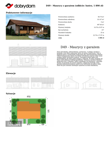 D49 - Maurycy z garażem (odbicie: lustro, 1 890 zł) Podstawowe informacje Powierzchnia użytkowa 66.70 m² Powierzchnia zabudowy 121.47 m² Powierzchnia dachu Kubatura Wymiary budynku 0 m² 497.46 m³ 14.76 x 9.97 m Kąt nachylenia 25° Wysokość budynku Wymiary działki cena 25 m 22.76 x 17.97 m 1 890 zł D49 - Maurycy z garażem Dom mieszkalny, jednorodzinny, parterowy, 3 pokoje, kuchnia i łazienka, oraz duży zadaszony taras od strony wejściowej. Tani w budowie dom w technologii tradycyjnej dla czteroosobowej rodziny. Układ funkcjonalny domu: Do domu wchodzimy poprzez duży taras mogący pełnić przeróżne funkcje. Następnie przez małą sień przechodzimy do hallu połączonego z salonem. W hallu znajduje się duża szafa pełniąca funkcje garderoby. Obszerna kuchnia również połączona jest z salonem. Dalej wchodzimy do korytarza, z którego dostać się możemy do trzech sypialni i obszernej łazienki. Dom posiada jednostanowiskowy garaż oraz kotłownię na paliwo stałe. Dom ten jest również świetnym wyborem na dom letniskowy. Elewacje Sytuacje D49 - Maurycy z garażem (odbicie: lustro, 1 890 zł) Rzuty Parter 13.17 m² taras frontowy 25.58 m² taras ogrodowy 18.03 m² sie 4.11 m² strych 65.70 m² garaż 17.24 m² korytarz 3.69 m² kuchniaspiżarnia 6.90 m² pokój dzienny 18.60 m² sypialnia 8.70 m² sypialnia 10.80 m² pokój 9.30 m² łazienka 4.60 m² kotłownia 12.17 m²