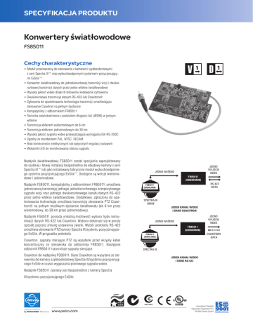 SPECYFIKACJA PRODUKTU Konwertery światłowodowe FS85011 Cechy charakterystyczne •Moduł przeznaczony do stosowania z kamerami szybkoobrotowymi z serii Spectra III™ oraz wybuchoodpornymi systemami pozycjonującymi ExSite™ •Konwerter światłowodowy do jednokierunkowej transmisji wizji i dwukierunkowej transmisji danych przez jedno włókno światłowodowe •Wysoka jakość wideo dzięki 8-bitowemu kodowanie cyfrowemu •Dwukierunkowa transmisja danych RS-422 lub Coaxitron® •Zgłoszona do opatentowania technologia transmisji umożliwiająca sterowanie Coaxitron na pełnym dystansie •Kompatybilny z odbiornikiem FR85011 •Technika zwielokrotnienia z podziałem długości fali (WDM) w jednym włóknie •Transmisja włóknem wielomodowym do 6 km •Transmisja włóknem jednomodowym do 30 km •Wysoka jakość sygnału wideo przewyższająca wymagania EIA RS-250C •Zgodny ze standardami PAL, NTSC, SECAM •Brak konieczności elektrycznych lub optycznych regulacji ustawień •Wskaźnik LED do monitorowania statusu sygnału Nadajnik światłowodowy FS85011 został specjalnie zaprojektowany do szybkiej i łatwej instalacji bezpośrednio do obudowy kamery z serii Spectra III™ lub jako instalowany fabrycznie moduł wybuchoodpornego systemu pozycjonującego ExSite™. Dostępne są wersje wielomodowe i jednomodowe. Nadajnik FS85011, kompatybilny z odbiornikiem FR85011, umożliwia jednoczesną transmisję jednego jednokierunkowego kompozytowego sygnału wizji oraz jednego dwukierunkowego kanału danych RS-422 przez jedno włókno światłowodowe. Dodatkowo, zgłoszona do opatentowania technologia umożliwia transmisję sterowania PTZ Coaxitron® na pełnym możliwym dystansie światłowodu (do 6 km przez wielomodowy, do 30 km przez jednomodowy). Nadajnik FS85011 posiada unikalną możliwość wyboru trybu komunikacji danych RS-422 lub Coaxitron. Wyboru dokonuje się w prosty sposób poprzez zmianę ustawienia zworki. Wybór protokołu RS-422 umożliwia sterowanie PTZ kamery Spectra III/systemu pozycjonującego ExSite. W przypadku protokołu Coaxitron, sygnały sterujące PTZ są wysyłane przez wizyjny kabel koncentryczny ze sterownika do odbiornika FR85011. Następnie odbiornik FR85011 transmituje sygnały sterujące Coaxitron do nadajnika FS85011. Dane Coaxitron są wysyłane ze sterownika do kamery szybkoobrotowej Spectra III/systemu pozycjonującego ExSite w czasie wygaszania pionowego sygnału wideo. JEDNO WYJŚCIE VIDEO JEDNO WŁÓKNO FR85011 (ODBIORNIK) RS-422 DATA FS85011 (NADAJNIK) SPECTRA III DOME JEDEN KANAŁ WIDEO I DANE COAXITRON JEDNO WYJŚCIE VIDEO JEDNO WŁÓKNO FR85011 (ODBIORNIK) COAXITRON DATA FS85011 (NADAJNIK) SPECTRA III JEDEN KANAŁ WIDEO I DANE RS-422 Nadajnik FS85011 zasilany jest bezpośrednio z kamery Spectra III/systemu pozycjonującego ExSite. www.pelco.com International Standards Organization Registered Firm; ISO 9001 Quality System SPECYFIKACJA TECHNICZNA MODELE NADAJNIK KOMPATYBILNY ODBIORNIK TYP ZŁĄCZA OPTYCZNEGO DŁUGOŚĆ FALI (WIDEO/DANE) BUDŻET MOCY OPTYCZNEJ MAKSYMALNA ODLEGŁOŚĆ TRANSMISJI Wielomodowy (62,5/125μm) FS85011MST FR85011MSTR1) ST 1310/850 nm 20 dB2) 6 km3) Jednomodowy (9/125μm) FS85011SST FR85011SSTR1) ST 1310/1550 nm 20 dB 30 km4) FS85011SFC FR85011SSFC1) FC 1310/1550 nm 20 dB 30 km4) 1) Jednokanałowy odbiornik wideo/nadajnik-odbiornik danych. Szczegółowy opis znajduje się w karcie katalogowej nadajnika i odbiornika światłowodowego z serii FT85011/FR85011. 2) Dla światłowodu 50/125 należy wartość budżetu mocy optycznej pomniejszyć o 3 dB. 3) Odległość transmisji ograniczona jest szerokością pasma przenoszenia światłowodu. 4) Maksymalna odległość transmisji przy założeniu, że tłumienność kabla wynosi 0,5dB/km plus 5dB bufor na tłumienność złączy i połączeń. UWAGA: Prosimy o kontakt z producentem w celu uzyskania informacji o modelach z większym budżetem mocy optycznej. DOSTARCZANE AKCESORIA Światłowodowe adaptery optyczne (ST na ST, FC na ST, FC na FC) WIDEO Ilość kanałów: Typ modulacji: Wejście: Szerokość pasma przenoszenia: Wzmocnienie: Różnica wzmocnienia: Różnica fazy: Błąd geometryczny: Stosunek sygnał/szum: 1 impulsowa (PCM), 8-bitowa 1 Vp-p (75 Ω); PAL, NTSC, SECAM 6,5 MHz jeden < 2% < 1º < 1% > 60 dB (ważony CCIR) DANE Ilość kanałów: Interfejs: Maksymalna przepływność PARAMETRY MECHANICZNE Złącza: Wideo/dane/zasilanie: Wybór danych: Optyczne: 1 blok 16-stykowy blok 2-stykowy ST dla włókna wielomodowego ST lub FC dla włókna jednomodowego CERTYFIKATY • CE, klasa A • Lista UL • Lista UL kanadyjskich standardów bezpieczeństwa • FCC, klasa A • C-Tick • Spełnia wymogi FDA dla klasy 1 urządzeń laserowych 1 RS-422, Coaxitron 500 KB/s PARAMETRY OGÓLNE Temperatura pracy: Wejście zasilania: Wskaźnik LED: Wymiary: Waga urządzenia: Waga brutto: szczegóły w karcie katalogowej Spectry III lub ExSite 12 VDC, 166 mA brak transmisji 9,1 x 6,1 cm 0,05 kg 0,45 kg Pelco, logo Pelco i Coaxitron są zarejestrowanymi znakami handlowymi Pelco. ExSite i Spectra III są znakami handlowymi Pelco. Producent zastrzega sobie prawo do zmian bez powiadamiania. Schneider Electric Buildings Polska Sp. z o.o. ul. Rzymowskiego 53 02-697 Warszawa tel. 022 313 24 10 fax 022 313 24 11 www.schneider-electric.com/buildings