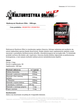 Utworzono: 2017-03-03 20:04:26 Hydroxycut Hardcore Elite - 180caps. Cena produktu: 149,00 PLN 129,00 PLN Hydroxycut Hardcore Elite to rewelacyjny spalacz tłuszczu, którego zadaniem jest pozbycie się nawet najbardziej opornej tkanki tłuszczowej. Dzięki właśnie temu suplementowi spełnisz swoje marzenia o posiadaniu beztłuszczowej sylwetki, charakteryzującej się szczupłą talią. To doskonały produkt zarówno dla kobiet, jak i mężczyzn. Znaczna dawka kofeiny odpowiada za podwyższoną termogenezę, a tym samym zachodzi szybszy proces metabolizowania lipidów. Skład: Porcja: 2 kap. Porcji w opakowaniu: 90 Opakowanie: 180 kap. Wartość odżywcza w 1 porcji Kofeina bezwodna 250mg Ekstrakt z pokrzywy indyjskiej 250mg Ekstrakt z liści zielonej herbaty 200mg L-Theanina 100mg Ekstrakt z nasion kokosa 100mg L-karnityna, L-tartrate 100 mg Ekstrakt z czarnego pieprzu 5 mg Pieprz cayenne 5 mg Dawkowanie: Zaleca się stosowanie od jednej do 4 kapsułek dziennie. Oświadczamy, że opis produktu oraz zdjęcia zostały stworzone przez firmę Muscle Power. Kopiowanie, przetwarzanie i rozpowszechnianie tych materiałów w całości lub w części bez naszej zgody jest zabronione i stanowi naruszenie praw autorskich. Podstawa prawna: Dz. U. 94 nr 24 poz. 83, sprost.: Dz. U. 94 nr 43 poz. 170. Adres: http://www.ko.sklep.pl/ Telefon: kom. 782 010 880 Email: [email protected]