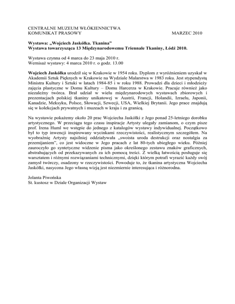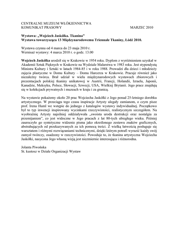 CENTRALNE MUZEUM WŁÓKIENNICTWA KOMUNIKAT PRASOWY MARZEC 2010 Wystawa: „Wojciech Jaskółka. Tkanina” Wystawa towarzysząca 13 Międzynarodowemu Triennale Tkaniny, Łódź 2010. Wystawa czynna od 4 marca do 23 maja 2010 r. Wernisaż wystawy: 4 marca 2010 r. o godz. 13.00 Wojciech Jaskółka urodził się w Krakowie w 1954 roku. Dyplom z wyróżnieniem uzyskał w Akademii Sztuk Pięknych w Krakowie na Wydziale Malarstwa w 1983 roku. Jest stypendystą Ministra Kultury i Sztuki w latach 1984-85 i w roku 1988. Prowadzi dla dzieci i młodzieży zajęcia plastyczne w Domu Kultury – Domu Harcerza w Krakowie. Pracuje również jako niezależny twórca. Brał udział w wielu międzynarodowych wystawach zbiorowych i prezentacjach polskiej tkaniny unikatowej w Austrii, Francji, Holandii, Izraelu, Japonii, Kanadzie, Meksyku, Polsce, Słowacji, Szwecji, USA, Wielkiej Brytanii. Jego prace znajdują się w kolekcjach prywatnych i muzeach w kraju i za granicą. Na wystawie pokażemy około 20 prac Wojciecha Jaskółki z Jego ponad 25-letniego dorobku artystycznego. W przeciągu tego czasu inspiracje Artysty ulegały zamianom, o czym pisze prof. Irena Huml we wstępie do jednego z katalogów wystawy indywidualnej. Początkowo był to typ inwencji inspirowany wycinkami rzeczywistości, realistycznym szczegółem. Na wyobraźnię Artysty najsilniej oddziaływała „swoista uroda destrukcji oraz nostalgia za przemijaniem”, co jest widoczne w Jego pracach z lat 80-tych ubiegłego wieku. Później zauroczyło go syntetyczne widzenie pisma jako określonego zestawu znaków graficznych, abstrahujących od przekazywanych za ich pomocą treści. Z wielką łatwością posługuje się warsztatem i różnymi rozwiązaniami technicznymi, dzięki którym potrafi wyrazić każdy swój zamysł twórczy, osadzony w rzeczywistości. Powoduje to, że tkanina artystyczna Wojciecha Jaskółki, nasycona Jego własną wizją jest niezmiernie interesująca i różnorodna. Jolanta Piwońska St. kustosz w Dziale Organizacji Wystaw