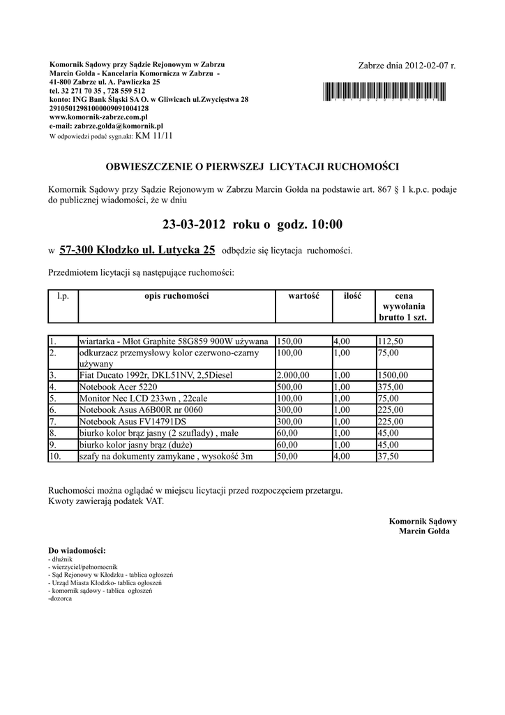 Komornik Sądowy przy Sądzie Rejonowym w Zabrzu Marcin Gołda - Kancelaria Komornicza w Zabrzu 41-800 Zabrze ul. A. Pawliczka 25 tel. 32 271 70 35 , 728 559 512 konto: ING Bank Śląski SA O. w Gliwicach ul.Zwycięstwa 28 29105012981000009091004128 www.komornik-zabrze.com.pl e-mail: [email protected] W odpowiedzi podać sygn.akt: KM Zabrze dnia 2012-02-07 r. *1012020701001* 11/11 OBWIESZCZENIE O PIERWSZEJ LICYTACJI RUCHOMOŚCI Komornik Sądowy przy Sądzie Rejonowym w Zabrzu Marcin Gołda na podstawie art. 867 § 1 k.p.c. podaje do publicznej wiadomości, że w dniu 23-03-2012 roku o godz. 10:00 w 57-300 Kłodzko ul. Lutycka 25 odbędzie się licytacja ruchomości. Przedmiotem licytacji są następujące ruchomości: l.p. 1. 2. 3. 4. 5. 6. 7. 8. 9. 10. opis ruchomości wiartarka - Młot Graphite 58G859 900W używana odkurzacz przemysłowy kolor czerwono-czarny używany Fiat Ducato 1992r, DKL51NV, 2,5Diesel Notebook Acer 5220 Monitor Nec LCD 233wn , 22cale Notebook Asus A6B00R nr 0060 Notebook Asus FV14791DS biurko kolor brąz jasny (2 szuflady) , małe biurko kolor jasny brąz (duże) szafy na dokumenty zamykane , wysokość 3m wartość ilość cena wywołania brutto 1 szt. 150,00 100,00 4,00 1,00 112,50 75,00 2.000,00 500,00 100,00 300,00 300,00 60,00 60,00 50,00 1,00 1,00 1,00 1,00 1,00 1,00 1,00 4,00 1500,00 375,00 75,00 225,00 225,00 45,00 45,00 37,50 Ruchomości można oglądać w miejscu licytacji przed rozpoczęciem przetargu. Kwoty zawierają podatek VAT. Komornik Sądowy Marcin Gołda Do wiadomości: - dłużnik - wierzyciel/pełnomocnik - Sąd Rejonowy w Kłodzku - tablica ogłoszeń - Urząd Miasta Kłodzko- tablica ogłoszeń - komornik sądowy - tablica ogłoszeń -dozorca