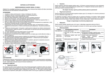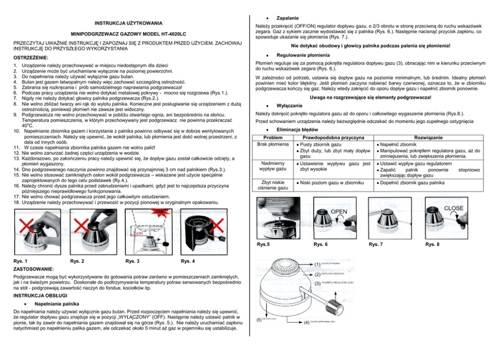 Zapalanie INSTRUKCJA UŻYTKOWANIA MINIPODGRZEWACZ GAZOWY MODEL HT-4020LC Należy przekręcić (OFF/ON) regulator dopływu gazu, o 2/3 obrotu w stronę przeciwną do ruchu wskazówek zegara. Gaz z sykiem zacznie wydostawać się z palnika (Rys. 6.). Następnie nacisnąć przycisk zapłonu, co spowoduje ukazanie się płomienia (Rys. 7.). PRZECZYTAJ UWAŻNIE INSTRUKCJĘ I ZAPOZNAJ SIĘ Z PRODUKTEM PRZED UŻYCIEM. ZACHOWAJ INSTRUKCJĘ DO PRZYSZŁEGO WYKORZYSTANIA Nie dotykać obudowy i głowicy palnika podczas palenia się płomienia! Regulowanie płomienia OSTRZEŻENIE: 1. 2. 3. 4. 5. 6. 7. 8. 9. 10. 11. 12. 13. 14. 15. 16. 17. 18. Urządzenie należy przechowywać w miejscu niedostępnym dla dzieci Urządzenie może być uruchamiane wyłącznie na poziomej powierzchni. Do napełnienia należy używać wyłącznie gazu butan. Butan jest gazem łatwopalnym należy więc zachować szczególną ostrożność. Zabrania się rozkręcania i prób samodzielnego naprawiania podgrzewacza! Podczas pracy urządzenia nie wolno dotykać metalowej pokrywy - mocno się rozgrzewa (Rys.1.). Nigdy nie należy dotykać głowicy palnika podgrzewacza (Rys.2.). Nie wolno zbliżać twarzy ani rąk do wylotu palnika. Konieczne jest posługiwanie się urządzeniem z dużą ostrożnością, ponieważ płomień nie zawsze jest widoczny. Podgrzewacza nie wolno przechowywać w pobliżu otwartego ognia, ani bezpośrednio na słońcu. Temperatura pomieszczenia, w którym przechowywany jest podgrzewacz nie powinna przekraczać 40oC. Napełnianie zbiornika gazem i korzystanie z palnika powinno odbywać się w dobrze wentylowanych pomieszczeniach. Należy się upewnić, że wokół palnika, lub płomienia jest dość wolnej przestrzeni, z dala od innych osób. W czasie napełniania zbiornika palnika gazem nie wolno palić! Nie wolno zanurzać żadnej części urządzenia w wodzie. Każdorazowo, po zakończeniu pracy należy upewnić się, że dopływ gazu został całkowicie odcięty, a płomień wygaszony. Dno podgrzewanego naczynia powinno znajdować się przynajmniej 3 cm nad palnikiem (Rys.3.). Nie wolno stosować zamkniętych osłon wokół podgrzewacza – wskazane jest użycie specjalnie zaprojektowanych do tego celu podstawek (Ry.4.). Należy chronić dysze palnika przed zabrudzeniami i upadkami, gdyż jest to najczęstsza przyczyna późniejszego nieprawidłowego funkcjonowania. Nie wolno chować podgrzewacza przed jego całkowitym ostudzeniem. Urządzenie należy przechowywać i przewozić w pozycji pionowej w oryginalnym opakowaniu. Płomień reguluje się za pomocą pokrętła regulatora dopływu gazu (3), obracając nim w kierunku przeciwnym do ruchu wskazówek zegara (Rys. 6.). W zależności od potrzeb, ustawia się dopływ gazu na poziomie minimalnym, lub średnim. Idealny płomień powinien mieć kolor błękitny. Jeśli płomień zaczyna nabierać barwy czerwonej, oznacza to, że w zbiorniku podgrzewacza kończy się gaz. Należy wtedy zakręcić do oporu dopływ gazu i napełnić zbiornik ponownie. Uwaga na rozgrzewające się elementy podgrzewacza! Wyłączanie Należy dokręcić pokrętło regulatora gazu aż do oporu i całkowitego wygaszenie płomienia (Rys.8.). Przed schowaniem urządzenia należy bezwzględnie odczekać do momentu jego zupełnego ostygnięcia Eliminacja błędów Problem Brak płomienia Prawdopodobna przyczyna Pusty zbiornik gazu Zbyt duży, lub zbyt mały dopływ gazu Rozwiązanie Napełnić zbiornik Manipulować pokrętłem regulatora gazu, aż do zmniejszenia, lub zwiększenia płomienia. Nadmierny wypływ gazu Ustawienie wypływu gazu jest zbyt wysokie Ustawić wypływ gazu regulatorem Zapalić palnik ponownie zwiększając dopływ gazu Niski poziom gazu w zbiorniku Dopełnić zbiornik gazu palnika Zbyt niskie ciśnienie gazu Rys.5 Rys. 1 Rys. 2 Rys. 3 Rys. 4 ZASTOSOWANIE: Podgrzewacze mogą być wykorzystywane do gotowania potraw zarówno w pomieszczeniach zamkniętych, jak i na świeżym powietrzu. Doskonałe do podtrzymywania temperatury potraw serwowanych bezpośrednio na stół - podgrzewają zawartość naczyń do fondue, kociołków itp. INSTRUKCJA OBSŁUGI Napełnianie palnika Do napełniania należy używać wyłącznie gazu butan. Przed rozpoczęciem napełniania należy się upewnić, że regulator dopływu gazu znajduje się w pozycji „WYŁĄCZONY” (OFF). Następnie należy ustawić palnik w pionie, tak by zawór do napełniania gazem znajdował się na górze (Rys. 5.). Nie należy uruchamiać zapłonu natychmiast po napełnieniu palika gazem, ale odczekać około 5 minut aż gaz w pojemniku się ustabilizuje. Rys. 6 Rys. 7 Rys. 8 stopniowo