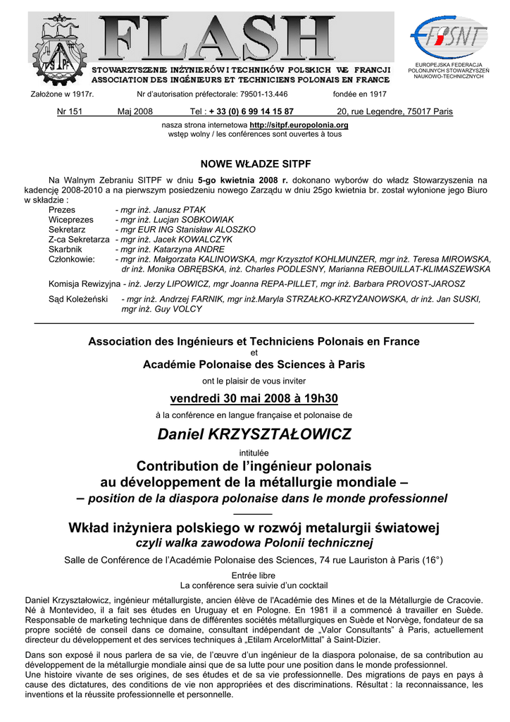 EUROPEJSKA FEDERACJA POLONIJNYCH STOWARZYSZEŃ NAUKOWO-TECHNICZNYCH Założone w 1917r. Nr d’autorisation préfectorale: 79501-13.446 Nr 151 Maj 2008 Tel : + 33 (0) 6 99 14 15 87 fondée en 1917 20, rue Legendre, 75017 Paris nasza strona internetowa http://sitpf.europolonia.org wstęp wolny / les conférences sont ouvertes à tous NOWE WŁADZE SITPF Na Walnym Zebraniu SITPF w dniu 5-go kwietnia 2008 r. dokonano wyborów do władz Stowarzyszenia na kadencję 2008-2010 a na pierwszym posiedzeniu nowego Zarządu w dniu 25go kwietnia br. został wyłonione jego Biuro w składzie : Prezes - mgr inż. Janusz PTAK Wiceprezes - mgr inż. Lucjan SOBKOWIAK Sekretarz - mgr EUR ING Stanisław ALOSZKO Z-ca Sekretarza - mgr inż. Jacek KOWALCZYK Skarbnik - mgr inż. Katarzyna ANDRE Członkowie: - mgr inż. Małgorzata KALINOWSKA, mgr Krzysztof KOHLMUNZER, mgr inż. Teresa MIROWSKA, dr inż. Monika OBRĘBSKA, inż. Charles PODLESNY, Marianna REBOUILLAT-KLIMASZEWSKA Komisja Rewizyjna - inż. Jerzy LIPOWICZ, mgr Joanna REPA-PILLET, mgr inż. Barbara PROVOST-JAROSZ Sąd Koleżeński - mgr inż. Andrzej FARNIK, mgr inż.Maryla STRZAŁKO-KRZYŻANOWSKA, dr inż. Jan SUSKI, mgr inż. Guy VOLCY Association des Ingénieurs et Techniciens Polonais en France et Académie Polonaise des Sciences à Paris ont le plaisir de vous inviter vendredi 30 mai 2008 à 19h30 à la conférence en langue française et polonaise de Daniel KRZYSZTAŁOWICZ intitulée Contribution de l’ingénieur polonais au développement de la métallurgie mondiale – – position de la diaspora polonaise dans le monde professionnel Wkład inżyniera polskiego w rozwój metalurgii światowej czyli walka zawodowa Polonii technicznej Salle de Conférence de l’Académie Polonaise des Sciences, 74 rue Lauriston à Paris (16°) Entrée libre La conférence sera suivie d’un cocktail Daniel Krzyształowicz, ingénieur métallurgiste, ancien élève de l'Académie des Mines et de la Métallurgie de Cracovie. Né à Montevideo, il a fait ses études en Uruguay et en Pologne. En 1981 il a commencé à travailler en Suède. Responsable de marketing technique dans de différentes sociétés métallurgiques en Suède et Norvège, fondateur de sa propre société de conseil dans ce domaine, consultant indépendant de „Valor Consultants” à Paris, actuellement directeur du développement et des services techniques à „Etilam ArcelorMittal” à Saint-Dizier. Dans son exposé il nous parlera de sa vie, de l’œuvre d’un ingénieur de la diaspora polonaise, de sa contribution au développement de la métallurgie mondiale ainsi que de sa lutte pour une position dans le monde professionnel. Une histoire vivante de ses origines, de ses études et de sa vie professionnelle. Des migrations de pays en pays à cause des dictatures, des conditions de vie non appropriées et des discriminations. Résultat : la reconnaissance, les inventions et la réussite professionnelle et personnelle. Z ŻYCIA STOWARZYSZENIA Wycieczka do CERN 28.03.2008 Na zaprozenie prof. dr inż. Witolda Krasnego, naukowca w centrum CERN (Conseil Européen pour la Recherche Nucléaire) pod Genewą, członka SITPF, mieliśmy możliwość zwiedzenia wystawy „Microcosm” oraz zjechania do tunelu LHC i obejrzenia urządzeń badawczych eksperymentu ATLAS. Wizytę CERNu, w której uczestniczyło 12 osób z SITPF i tyleż samo ze Stowarzyszenia Polaków w Szwajcarii, rozpoczęliśmy od zapoznania się z wystawą „Microcosm”, obrazującej rozwój wrzechświata od momentu „Big Bang” i jego rozszerzania do chwili obecnej. Prof. W.Krasny w bardzo przystępny sposób wprowadził nas w świat cząstek podstawowych i wielkich energii, a następnie opisał działanie nowo-powstałego LHC (Large Hadron Collider). LHC jest olbrzymim cyklotronem, w którym dwie wiązki cząstek poruszające się w kierunkach przeciwnych i przyspieszane do prędkości bliskiej prędkości światła wchodzą w kolizję wydzielając olbrzymie energie, takie jakie panowały w ułamkach sekund po Big Bang. W tych warunkach powstają cząstki elementarne, które były u podstaw tworzenia się neutronów i protonów, elementów składowych materii. Dzięki LHC po raz pierwszy człowiek zbliży się tak blisko do „początku świata”. W drugiej części wizyty, mieliśmy możność zjechania do tunelu eksperymentu ATLAS, który jest systemem detektorów do badania szerokiej gamy cząstek. Trzeba przypomnieć, że LHC ma obwód około 27 km, położony jest w tunelu na głębokości 100 m, w przewodzie w którym mają krążyć cząstki panuje próżnia 10-13 a pole magnetyczne utrzymujące cząstki w ruchu okrężnym, jest wytwarzane przez cewki nadprzewodzące utrzymane stale w temperaturze -271°C ! Po wstępnym wytłumaczeniu konstrukcji i zasad funkcjonowania urządzenia, systemu czujników, sposobu chłodzenia, itd. przez inżyniera-termodynamika, pana Janusza Godlewskiego, jednego z 200 polskich naukowców i inżynierów pracujących aktualnie w CERNie, zjechaliśmy w grupach po 12 osób do tunelu, do mniej-wiecej połowy wyskości urządzenia eksperymentu ATLAS. Przed nami stało wielopiętrowe urządzenie, długie na 46 m i ważące ponad 7 500 ton, pełne olbrzymich cewek magnesujących, wielometrowych rozmarów czujników cząstek, tysięcy kabli elektrycznych, przewodów i pomp próżniowych i chłodzących i innych instrumentów. Trzeba dodać, że wszystkie elementy były opuszczane dwoma studniami przy użyciu dwóch suwnic o nośności 120T każda i składane w tunelu, w bardzo ograniczonej przestrzeni. Należą się obu naszym „przewodnikom” Profesorowi Witoldowi Krasnemu i Inżynierowi Januszowi Godlewskiemu duże brawa za tyle cierpliwości, jasność opisów i wyjaśnień oraz serdeczne podziękowania za tą wspaniałą możliwość zwiedzenia CERNu i eksperymentu ATLAS. NOWI CZŁONKOWIE SITPF Miło nam zawiadomić, że uchwałą Zarządu SITPF z dnia 25.04.2008 zostali przyjęci w poczet