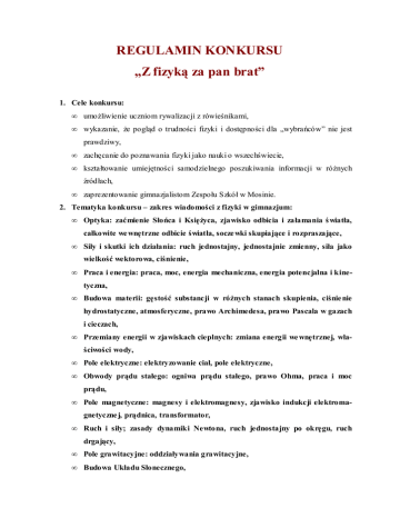 REGULAMIN KONKURSU „Z fizyką za pan brat” 1. Cele konkursu: • umoŜliwienie uczniom rywalizacji z rówieśnikami, • wykazanie, Ŝe pogląd o trudności fizyki i dostępności dla „wybrańców” nie jest prawdziwy, • zachęcanie do poznawania fizyki jako nauki o wszechświecie, • kształtowanie umiejętności samodzielnego poszukiwania informacji w róŜnych źródłach, • zaprezentowanie gimnazjalistom Zespołu Szkół w Mosinie. 2. Tematyka konkursu – zakres wiadomości z fizyki w gimnazjum: • Optyka: zaćmienie Słońca i KsięŜyca, zjawisko odbicia i załamania ś wiatła, całkowite we wnętrzne odbicie światła, socze wki skupiające i rozpraszające, • Siły i skutki ich działania: ruch jednostajny, jednostajnie zmienny, siła jako wielkość wektorowa, ciśnienie, • Praca i energia: praca, moc, energia mechaniczna, energia potencjalna i kinetyczna, • Budowa materii: gęstość substancji w róŜnych stanach skupienia, ciśnie nie hydrostatyczne, atmosferyczne, prawo Archimedesa, prawo Pascala w gazach i cieczach, • Przemiany energii w zjawiskach cieplnych: zmiana energii we wnętrznej, właściwości wody, • Pole elektryczne: elektryzowanie ciał, pole elektryczne, • Obwody prądu stałego: ogniwa prądu stałego, prawo Ohma, praca i moc prądu, • Pole magnetyczne: magnesy i elektromagnesy, zjawisko indukcji elektromagnetyczne j, prądnica, transformator, • Ruch i siły; zasady dynamiki Newtona, ruch jednostajny po okręgu, ruch drgający, • Pole grawitacyjne: oddziaływania grawitacyjne, • Budowa Układu Słonecznego, • Fale i energia: wielkości opis ujące fale, • Ele menty fizyki jądrowe j. 3. Organizacja konkursu • konkurs przeznaczony jest dla uczniów gimnazjum, • zainteresowane szkoły wyłaniają trzech uczniów, którzy utworzą druŜynę reprezentującą daną szkołę; zgłoszenie udziału i nazwisko opiekuna naleŜy przysłać do 15 lutego 2008 roku, tel: (061) 8132-922, fax: (061) 8132-922 (33), email: [email protected] • konkurs zostanie przeprowadzony 22 lutego 2008r. (piątek) o godz. 1100 w świetlicy szkolnej Zespołu Szkół im. Adama Wodziczki w Mosinie, ul. Topolowa 2 • konkurs będzie miał formę turnieju druŜyn z róŜnych gimnazjów; druŜyny odpowiadają ustnie na pytania, • zwycięŜa druŜyna, która udzieli najwięcej prawidłowych odpowiedzi, • ogłoszenie wyników i wręczenie nagród nastąpi 22 lutego 2008r. • Komisja Konkursowa: - przewodniczący: mgr inŜ. Jerzy Kołodziej - mgr inŜ. Małgorzata Kołodziej - mgr Danuta Woźniak www.zespol-wodziczki.republika.pl
