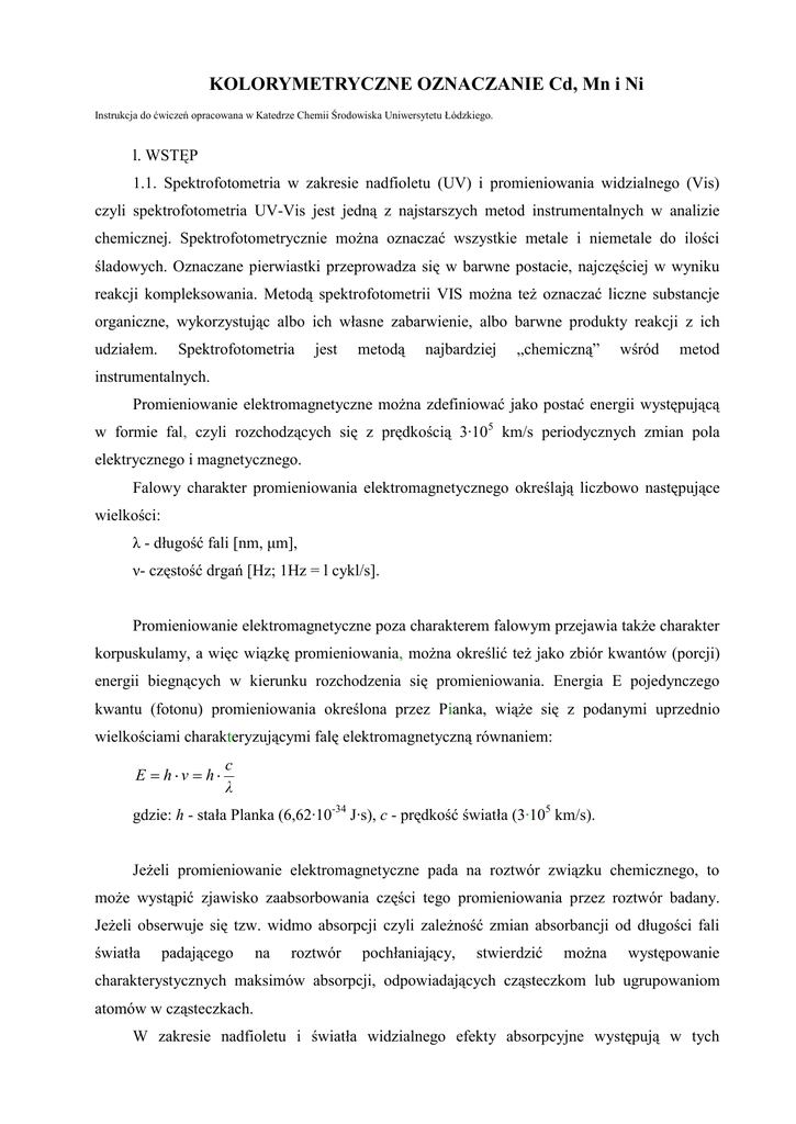 KOLORYMETRYCZNE OZNACZANIE Cd, Mn i Ni Instrukcja do ćwiczeń opracowana w Katedrze Chemii Środowiska Uniwersytetu Łódzkiego. l. WSTĘP 1.1. Spektrofotometria w zakresie nadfioletu (UV) i promieniowania widzialnego (Vis) czyli spektrofotometria UV-Vis jest jedną z najstarszych metod instrumentalnych w analizie chemicznej. Spektrofotometrycznie można oznaczać wszystkie metale i niemetale do ilości śladowych. Oznaczane pierwiastki przeprowadza się w barwne postacie, najczęściej w wyniku reakcji kompleksowania. Metodą spektrofotometrii VIS można też oznaczać liczne substancje organiczne, wykorzystując albo ich własne zabarwienie, albo barwne produkty reakcji z ich udziałem. Spektrofotometria jest metodą najbardziej „chemiczną” wśród metod instrumentalnych. Promieniowanie elektromagnetyczne można zdefiniować jako postać energii występującą w formie fal, czyli rozchodzących się z prędkością 3·105 km/s periodycznych zmian pola elektrycznego i magnetycznego. Falowy charakter promieniowania elektromagnetycznego określają liczbowo następujące wielkości: λ - długość fali [nm, μm], ν- częstość drgań [Hz; 1Hz = l cykl/s]. Promieniowanie elektromagnetyczne poza charakterem falowym przejawia także charakter korpuskulamy, a więc wiązkę promieniowania, można określić też jako zbiór kwantów (porcji) energii biegnących w kierunku rozchodzenia się promieniowania. Energia E pojedynczego kwantu (fotonu) promieniowania określona przez Pianka, wiąże się z podanymi uprzednio wielkościami charakteryzującymi falę elektromagnetyczną równaniem: E h ν h c λ gdzie: h - stała Planka (6,62·10-34 J·s), c - prędkość światła (3·105 km/s). Jeżeli promieniowanie elektromagnetyczne pada na roztwór związku chemicznego, to może wystąpić zjawisko zaabsorbowania części tego promieniowania przez roztwór badany. Jeżeli obserwuje się tzw. widmo absorpcji czyli zależność zmian absorbancji od długości fali światła padającego na roztwór pochłaniający, stwierdzić można występowanie charakterystycznych maksimów absorpcji, odpowiadających cząsteczkom lub ugrupowaniom atomów w cząsteczkach. W zakresie nadfioletu i światła widzialnego efekty absorpcyjne występują w tych związkach organicznych, w których występują ugrupowania atomów z zawierającymi ruchliwe elektrony π, wiązaniami wielokrotnymi. Ugrupowania te noszą nazwę chromoforowych. Przykładem takich grup są: , grupa azowa –N=N–, nitrozowa –N=O, grupa nitrowa pierścień benzoesowy , naftalenowy parachinoidowy , . Wzrost liczby grup chromoforowych w cząsteczce związku pogłębia barwę, przesuwając maksimum absorpcji w kierunku fal dłuższych. Zjawisko takie nazywa się przesunięciem lub efektem batochromowym. Przesunięcie odwrotne w kierunku fal krótszych, to podwyższenie barwy - efekt hipsochromowy. 1.2. PRAWA ABSORPCJI W celu wykorzystania zjawiska absorpcji promieniowania w analizie chemicznej trzeba poznać zależność pomiędzy stężeniem substancji w roztworze oraz grubością warstwy roztworu badanej substancji a ilością promieniowania zaabsorbowanego przez ten roztwór. I Prawo absorpcji (prawo Lamberta) Wiązka promieniowania monochromatycznego po przejściu przez jednorodny ośrodek absorbujący o grubości b ulega osłabieniu wg równania: I I0 e kb w którym I0 oznacza natężenie wiązki promieniowania monochromatycznego padającego na jednorodny ośrodek absorbujący, I - natężenie promieniowania po przejściu przez ośrodek absorbujący, b - grubość warstwy absorbującej, k - współczynnik absorpcji, e -podstawę logarytmów naturalnych. Stąd: ln I0 I kb A lub A log I0 ab I gdzie: a = 0,4343k, A - zdolność pochłaniania promieniowania zwana absorbancją. I prawo absorpcji można zatem sformułować w sposób następujący: Absorbancja jest proporcjonalna do grubości warstwy absorbującej, jeśli wiązka promieniowania monochromatycznego przechodzi przez jednorodny ośrodek absorbujący. Inną wielkością stosowaną do określania absorpcji promieniowania jest transmitacja T określana jako: T I I0 A zatem: A log 1 T Transmitację podajemy najczęściej w procentach, stąd: %T 100 I I0 100T lub A log 100 %T II Prawo absorpcji (prawo Lamberta-Beera) Prawo to dotyczy absorpcji promieniowania .przez roztwory i można je sformułować w następujący sposób: jeśli współczynnik absorpcji rozpuszczalnika jest równy zeru, to wiązka promieniowania monochromatycznego, po przejściu przez jednorodny roztwór substancji absorbującej o stężeniu c, ulega osłabieniu według równania: I I0 e kb Stąd, po przekształceniach jak wyżej, można zapisać: A log I0 I abc Prawo to można sformułować w sposób następujący: Jeżeli współczynnik absorpcji rozpuszczalnika jest równy zeru, to absorbancja wiązki promieniowania monochromatycznego przechodzącej przez jednorodny roztwór jest wprost proporcjonalna do stężenia roztworu c i do grubości warstwy absorbującej b. III Prawo absorpcji (prawo addytywności absorpcji) Absorbancja roztworu -wieloskładnikowego równa się sumie absorbancji poszczególnych składników: A = A1 + A2 + ... + An gdzie: A1. A2,.... An są to absorbancje poszczególnych składników. W równaniu: A=acb wielkość a jest właściwym współczynnikiem absorpcji, gdy stężenie wyrażamy w kg·dm-3 lub g·cm-3 Natomiast, gdy stężenie c wyrażamy w nmol·dm-3, równanie to przybiera postać: A=εcb gdzie ε jest to molowy współczynnik absorpcji, a jego wymiar podawany jest dwojako: [dm-3 ·mol-1·cm-1] lub w jednostkach SI [m2·mol]. Funkcja A = f(c) jest linią prostą, jeżeli roztwór spełnia II prawo absorpcji (rys. l). Natomiast ε jest wartością stałą dla danego chromoforu, a jego wartość nie zależy od stężenia roztworu c. Funkcja ε = f(c) jest linią prostą równoległą do osi odciętych (rys. 2). Rys. 1. Wykres zależności A=f(c). Rys. 2. Wykres zależności molowe