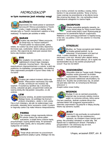 HOROSKOP w tym numerze jest miesiąc wagi się w końcu umówić na randkę z osobą, która bardzo Ci się przecież podoba. Teraz w końcu masz szansę na powodzenie w tej sferze życia. Nie zmarnuj tej okazji. No i nie zaniedbuj nauki. Nadrabianie zaległości to żadna frajda BLIŹNIĘTA Zapowiada sie niezła passa w sprawach sercowych! Wenus pozostanie w Twoim znaku i nagle związek z osobą, która istniała tylko w Twoich marzeniach wejdzie w fazę realizacji. To będzie jak szóstka w totka. BARAN Czujesz się samotny? Masz poczucie, że świat leży na Twoich barkach? Pozwól sobie na odpoczynek, pełny relaks, bo czeka Cię zima spod znaku deprechy. Domowe spa, czekolada i dobre zakupy powinny pomóc. Nie zapomnij że obok jest zawsze ktoś komu się możesz wyżalić... BYK Bez względu na wszystko, co się w najbliższych dniach tego miesiąca zdarzyło, trzymaj fason. Nie daj się ewentualnym niepowodzeniem w szkole, a jeśli się pokłócisz na dokładkę z przyjacielem, nie panikuj, tylko zaprowadź porządek w życiu! Dasz radę i to na bank! RAK Czujesz jak małymi krokami zbliża się jesień. Wieczorami nachodzą Cię małe smutki, od których nie możesz się opędzić. A wystarczy spotkać się z ukochaną osobą, usłyszeć jej głos, przypomnieć sobie jak ważną istotą dla niej jesteś i wszystko, co złe zniknie. SKORPION Chyba wszystkie gwiazdy zawarły, na mocy której stoją za Tobą murem Masz przed sobą dobry czas! Wykorzystaj go zwłaszcza na zawieranie fajnych znajomości. Niektóre z nich pomogą przetrwać Ci każdą burzę, a kto wie, czy jedna z nich nie zawróci Ci mocniej w głowie! STRZELEC Myślisz, że Twoje szczęście jest daleko, że trzeba gdzieś jeździć, by je odszukać. A tymczasem ono jest tuż obok. I czeka cierpliwie, aż je zauważysz i zechcesz z nim być. Musisz tylko złapać dobrą ostrość :). Może się nawet zdarzyć, że w ogóle nie spodziewałeś się po tej osobie pozytywnych uczuć! Kup los na loterii! KOZIOROŻEC Wszystko idzie po Twojej myśli. Dlatego możesz sobie pozwolić na krótkie wyluzowanie. Obcowanie z przyrodą odpręży Cię i pozwoli naładować akumulatory na dalsze dni. Szybko też przekonasz się, że jesień nie jest taka zła! Ach, te romantyczne filmowe wieczory! :) Znajdź sobie nowe hobby WODNIK Wydaje Ci sie ze zamiast powolutku wspinać się na szczyty wiedzy można Gwiazdy wiedzą, że jesteś twardzielem i wejść na ruchome schody, które same dlatego bywa, że poddają Cię licznym Cię tam zawiozą, Jednak czytanie skryp-tów próbom charakteru. Jeden z nich czeka zamiast lektór lub ściaganie wypracowań z Cię w tym miesiącu, ale jak na walecznego Lwa internetu zaprowadzi Cię jedynie w ślepą uliczkę. przystało, stawiasz temu wyzwaniu czoła. A potem Warto się samemu wysilić. w nagrodę czeka Cię mała miłosna niespodzianka. LEW PANNA Ten miesiąc rokuje naprawdę dobrze. W szkole czeka Cię okres pełen sukcesów, a dzięki temu rodzice będą przychylniejsi i sypną ekstra kasą. W sprawach sercowych lekki zastój, ale tu wszystko zależy wyłącznie od Ciebie. RYBY Należą Ci się pochwały za wytrwałość. Los często Cię nie rozpieszcza i sprawia, że chwilami masz bardzo pod górkę. Ale potrafisz odnaleźć w sobie siłę. Tak będzie też w najbliższych dniach. Pamiętaj o przyjaciołach i nie odwracaj się od nich. Zwyczajnie ich potrzebujesz. WAGA Twoje akcje sercowe na uczuciowym parkiecie pójdą w górę. Dlatego nie bój Utopia, wrzesień 2007, str. 8