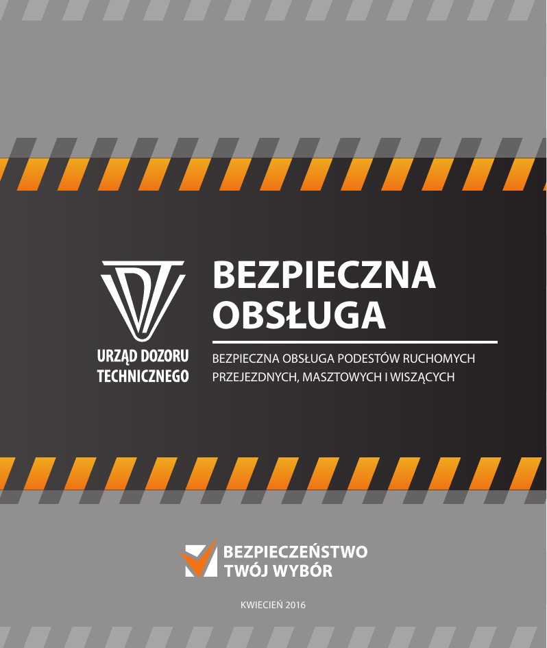 BEZPIECZNA OBSŁUGA BEZPIECZNA OBSŁUGA PODESTÓW RUCHOMYCH PRZEJEZDNYCH, MASZTOWYCH I WISZĄCYCH KWIECIEŃ 2016 Wydawca: Urząd Dozoru Technicznego ul. Szczęśliwicka 34, 02-353 Warszawa [email protected], www.udt.gov.pl Redakcja: Ewa Dorobińska, Zespół Prasowy Konsultacja merytoryczna: Wojciech Piłatowicz, Wydział Urządzeń Transportu Bliskiego UDT Ilustracje: Piotr Promiński Produkcja: Zespół Prasowy UDT, kwiecień 2016 r. Wszystkie prawa zastrzeżone © Urząd Dozoru Technicznego Szanowni Państwo, przekazujemy Państwu poradnik, który jest jednym z elementów kampanii prewencyjnej UDT „Bezpieczeństwo – Twój wybór” 2016. Mamy nadzieję, że treści w nim zawarte przyczynią się do zwiększenia bezpieczeństwa pracy z wykorzystaniem podestów ruchomych przejezdnych, masztowych i wiszących. Podesty ruchome służą do przemieszczania osób na stanowiska robocze i wykonywania prac z poziomu ich platformy. Szczególne zastosowanie mają przy pracach budowlano-montażowych, jak np. ocieplanie i tynkowanie budynków. Na rynku istnieje wiele rodzajów tych urządzeń, spełniających różne oczekiwania użytkowników pod względem parametrów technicznych, jakości i ergonomii, ale zdecydowana większość zasad bezpiecznej pracy z nimi jest podobna. Przyczynami ponad 92% wypadków związanych z eksploatacją podestów ruchomych są zła organizacja pracy, nieprzestrzeganie zasad BHP oraz instrukcji eksploatacji urządzenia. Pracodawca ma obowiązek dostosować starsze urządzenia do minimalnych wymagań bezpieczeństwa i higieny pracy w zakresie użytkowania tych urządzeń przez pracowników podczas pracy. W związku z tym poradnik zawiera listę najczęściej identyfikowanych zagrożeń. Uwaga – niniejsza broszura nie zastępuje instrukcji eksploatacji sporządzonej przez wytwórcę podestu ruchomego! Życzymy bezpiecznej pracy. Zespół Prasowy UDT 3 podesty pod dozorem technicznym Podesty ruchome przejezdne, masztowe i wiszące podlegają dozorowi technicznemu zgodnie z Rozporządzeniem Rady Ministrów z dnia 7 grudnia 2012 r. w sprawie rodzajów urządzeń technicznych podlegających dozorowi technicznemu (Dz.U. z 2012 r. poz. 1468). Każdy podest ruchomy przejezdny, masztowy lub wiszący, aby mógł być eksploatowany, musi posiadać aktualną decyzję zezwalającą na eksploatację, wydaną przez właściwą jednostkę dozoru technicznego. W celu uzyskania decyzji zezwalającej na eksploatację, eksploatujący powinien pisemnie zgłosić urządzenie do badania technicznego we właściwym Oddziale UDT dołączając dokumentację określoną w § 4 Rozporządzenia Ministra Gospodarki, Pracy i Polityki Społecznej z dnia 29 października 2003 r. w sprawie warunków technicznych dozoru technicznego w zakresie eksploatacji niektórych urządzeń transportu bliskiego (Dz.U. nr 193, poz. 1890). Po złożeniu kompletu dokumentów, przeprowadzeniu przez inspektora UDT badania technicznego i wykonaniu czynności sprawdzających z wynikiem pozytywnym, zostanie wydana decyzja zezwalająca na eksploatację podestu (na podstawie art. 14 Ustawy z dnia 21 grudnia 2000 r. o dozorze technicznym - Dz.U. z 2013 r., poz. 963 ze zm.). Kwalifikacje osób obsługujących lub konserwujących podesty Osoby, które obsługują lub konserwują podesty ruchome przejezdne, masztowe lub wiszące są obowiązane posiadać odpowiednie kwalifikacje do wykonywania tych czynności. W celu uzyskania zaświadczeń kwalifikacyjnych do obsługi podestów danej kategorii należy zdać egzamin składający się z części teoretycznej i praktycznej przed komisją Urzędu Dozoru Technicznego. Urząd Dozoru Technicznego sprawdza kwalifikacje osób zgodnie z: –– Ustawą o dozorze technicznym z dnia 21 grudnia 2000 r., –– Rozporządzeniem Ministra Gospodarki z dnia 18 lipca 2001 r. w sprawie trybu sprawdzania kwalifikacji wymaganych przy obsłudze i konserwacji urządzeń technicznych (Dz.U. nr 79, poz. 849), zmienionym Rozporządzeniem z dnia 20 lutego 2003 r. (Dz.U. nr 50, poz. 426). Szczegółowa tematyka egzaminacyjna dla osób ubiegających się o uzyskanie zaświadczenia kwalifikacyjnego do obsługi lub konserwacji urządzeń transportu bliskiego jest dostępna na stronie internetowej UDT www.udt.gov.pl w zakładce Dozór techniczny / Kwalifikacje osób. Wszystkie filmy z kampanii „Bezpieczeństwo – Twój wybór” są dostępne na kanale UDT na YouTube UWAGA! broszura nie zastępuje instrukcji eksploatacji wytwórcy podestu ruchomego Obowiązki eksploatującego Dokumenty Podstawowe obowiązki eksploatującego podest ruchomy przejezdny, masztowy lub wiszący: Przed rozpoczęciem pracy obsługujący podest powinien upewnić się: –– zgłoszenie zamiaru eksploatacji podestu –– czy decyzja UDT zezwalająca na eksploata- do UDT i poddawanie urządzenia okresowym badaniom technicznym w obecności konserwatora i obsługującego –– zapewnienie właściwej konserwacji i obsługi urządzenia –– zapewnianie na co dzień właściwego stanu technicznego podestu – tzw. codzienna obsługa techniczna –– w określonych przypadkach opracowanie i udostępnienie obsługującemu podest stanowiskowej instrukcji obsługi cję podestu jest aktualna –– czy posiadane zaświadczenie kwalifikacyjne jest odpowiednie do podestu, na którym zamierza pracować –– czy dokonano wszystkich przeglądów konserwacyjnych potwierdzone podpisem uprawnionego konserwatora (zapisy w dzienniku konserwacji) –– czy w wyposażeniu urządzenia jest właściwa instrukcja eksploatacji i stanowiskowa instrukcja obsługi 7 JA INSTRUKC 8 Zgodnie z instrukcją Instrukcja zawsze pod ręką Przeczytaj uważnie instrukcję! Nie ufaj rutynie lecz wiedzy! Czynności związane z użytkowaniem, obsługą i konserwacją podestu powinny być wykonywane zgodnie z instrukcją eksploatacji opracowaną przez producenta, ze stanowiskową instrukcją obsługi opracowaną przez eksploatującego oraz z przepisami o dozor