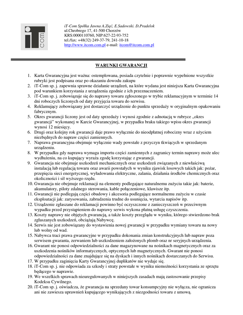 iT-Com Spółka Jawna A.Zi , E.Sadowski. D.Pradelok ul.Chrobrego 17, 41-500 Chorzów KRS:0000110760, NIP:627-22-93-752 tel./fax: +48(32) 249-37-79, 241-10-18 http://www.itcom.com.pl e-mail: [email protected] WARUNKI GWARANCJI 1. Karta Gwarancyjna jest wa na: ostemplowana, posiada czytelnie i poprawnie wypełnione wszystkie rubryki jest podpisana oraz po okazaniu dowodu zakupu 2. iT-Com sp. j. zapewnia sprawne działanie urz dze , na które wydana jest niniejsza Karta Gwarancyjna pod warunkiem korzystania z urz dzenia zgodnie z ich przeznaczeniem. 3. iT-Com sp. j. zobowi zuje si do naprawy towaru zgłoszonego w trybie reklamacyjnym w terminie 14 dni roboczych liczonych od daty przyj cia towaru do serwisu. 4. Reklamuj cy zobowi zany jest dostarczy urz dzenie do punktu sprzeda y w oryginalnym opakowaniu fabrycznym. 5. Okres gwarancji liczony jest od daty sprzeda y i wynosi zgodnie z adnotacj w rubryce „okres gwarancji” wykonanej w Karcie Gwarancyjnej, w przypadku braku takiego wpisu okres gwarancji wynosi 12 miesi cy. 6. Drugi oraz kolejny rok gwarancji daje prawo wył cznie do nieodpłatnej robocizny wraz z u yciem niezb dnych do napraw cz ci zamiennych. 7. Naprawa gwarancyjna obejmuje wył cznie wady powstałe z przyczyn tkwi cych w sprzedanym urz dzeniu. 8. W przypadku gdy naprawa wymaga importu cz ci zamiennych z zagranicy termin naprawy mo e ulec wydłu eniu, na co kupuj cy wyra a zgod korzystaj c z gwarancji. 9. Gwarancja nie obejmuje uszkodze mechanicznych oraz uszkodze zwi zanych z niewła ciw instalacj lub regulacj towaru oraz awarii powstałych w wyniku zjawisk losowych takich jak: po ar, przepi cia sieci energetycznej, wyładowania elektryczne, zalania, działania rodków chemicznych oraz okoliczno ci i sił wy szego rz du. 10. Gwarancja nie obejmuje reklamacji na elementy podlegaj ce naturalnemu zu yciu takie jak: baterie, akumulatory, piloty zdalnego sterowania, kable poł czeniowe, klawisze itp. 11. Gwarancji nie podlegaj cz ci obudowy i akcesoria podlegaj ce normalnemu zu yciu w czasie eksploatacji jak: zarysowania, zabrudzenia trudne do usuni cia, wytarcia napisów itp. 12. Urz dzenie zgłaszane do reklamacji powinno by oczyszczone z zanieczyszcze w przeciwnym wypadku przed przyst pieniem do naprawy serwis wykona płatn usług czyszczenia. 13. Koszty naprawy nie obj tych gwarancj , a tak e koszty przegl du w wyniku, którego stwierdzono brak zgłaszanych uszkodze , obci aj Nabywc . 14. Serwis nie jest zobowi zany do wystawienia nowej gwarancji w przypadku wymiany towaru na nowy lub wolny od wad. 15. Nabywca traci prawa gwarancyjne w przypadku dokonania zmian konstrukcyjnych lub napraw poza serwisem gwaranta, zerwaniem lub uszkodzeniem zało onych plomb oraz nr seryjnych urz dzenia. 16. Gwarant nie ponosi odpowiedzialno ci za dane magazynowane na no nikach magnetycznych oraz za uszkodzenia no ników informatycznych, optycznych lub magnetycznych. Gwarant nie ponosi odpowiedzialno ci za dane znajduj ce si na dyskach i innych no nikach dostarczanych do Serwisu. 17. W przypadku zagini cia Karty Gwarancyjnej duplikatów nie wydaje si . 18. iT-Com sp. j. nie odpowiada za szkody i straty powstałe w wyniku niemo no ci korzystania ze sprz tu b d cego w naprawie. 19. We wszelkich sprawach nieuregulowanych w niniejszych zasadach maj zastosowanie przepisy Kodeksu Cywilnego. 20. iT-Com sp. j. o wiadcza, e gwarancja na sprzedany towar konsumpcyjny nie wył cza, nie ogranicza ani nie zawiesza uprawnie kupuj cego wynikaj cych z niezgodno ci towaru z umow .