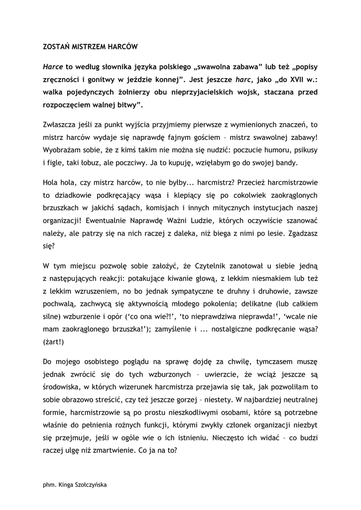 ZOSTAŃ MISTRZEM HARCÓW Harce to według słownika języka polskiego „swawolna zabawa” lub też „popisy zręczności i gonitwy w jeździe konnej”. Jest jeszcze harc, jako „do XVII w.: walka pojedynczych żołnierzy obu nieprzyjacielskich wojsk, staczana przed rozpoczęciem walnej bitwy”. Zwłaszcza jeśli za punkt wyjścia przyjmiemy pierwsze z wymienionych znaczeń, to mistrz harców wydaje się naprawdę fajnym gościem – mistrz swawolnej zabawy! Wyobrażam sobie, że z kimś takim nie można się nudzić: poczucie humoru, psikusy i figle, taki łobuz, ale poczciwy. Ja to kupuję, wzięłabym go do swojej bandy. Hola hola, czy mistrz harców, to nie byłby... harcmistrz? Przecież harcmistrzowie to dziadkowie podkręcający wąsa i klepiący się po cokolwiek zaokrąglonych brzuszkach w jakichś sądach, komisjach i innych mitycznych instytucjach naszej organizacji! Ewentualnie Naprawdę Ważni Ludzie, których oczywiście szanować należy, ale patrzy się na nich raczej z daleka, niż biega z nimi po lesie. Zgadzasz się? W tym miejscu pozwolę sobie założyć, że Czytelnik zanotował u siebie jedną z następujących reakcji: potakujące kiwanie głową, z lekkim niesmakiem lub też z lekkim wzruszeniem, no bo jednak sympatyczne te druhny i druhowie, zawsze pochwalą, zachwycą się aktywnością młodego pokolenia; delikatne (lub całkiem silne) wzburzenie i opór (‘co ona wie?!’, ‘to nieprawdziwa nieprawda!’, ‘wcale nie mam zaokrąglonego brzuszka!’); zamyślenie i ... nostalgiczne podkręcanie wąsa? (żart!) Do mojego osobistego poglądu na sprawę dojdę za chwilę, tymczasem muszę jednak zwrócić się do tych wzburzonych – uwierzcie, że wciąż jeszcze są środowiska, w których wizerunek harcmistrza przejawia się tak, jak pozwoliłam to sobie obrazowo streścić, czy też jeszcze gorzej – niestety. W najbardziej neutralnej formie, harcmistrzowie są po prostu nieszkodliwymi osobami, które są potrzebne właśnie do pełnienia rożnych funkcji, którymi zwykły członek organizacji niezbyt się przejmuje, jeśli w ogóle wie o ich istnieniu. Nieczęsto ich widać – co budzi raczej ulgę niż zmartwienie. Co ja na to? phm. Kinga Szołczyńska Konsekwentnie realizuje swoje cele życiowe. Osiągnął założoną przez siebie dojrzałość w życiu rodzinnym, zawodowym, i społecznym. Kreuje rzeczywistość. Jest znaczącą osobowością w zespole instruktorskim, z którym pracuje, i w środowisku swojego działania. Własne doświadczenia życiowe i wychowawcze potrafi przełożyć na trwały dorobek. Ma dużą wiedzę i umiejętności w zakresie samodzielnego kierowania zespołem. Potrafi inspirować i organizować swoje środowisko do potrzebnego społecznie działania. Wpływa na oblicze harcerstwa. Jest wzorem dla instruktorów. Brzmi równie dobrze, jak mistrz swawolnych zabaw, prawda? Pokusiłabym się nawet o stwierdzenie, że dużo lepiej. Takiego gościa z całą pewnością chciałabym mieć obok siebie, takiego instruktora życzyłabym każdemu środowisku harcerskiemu. Kimś takim... sama chciałabym być. Myślę, że nawet ktoś, kto pierwszy raz na oczy widzi ten opis albo dawno go zapomniał, wie już, że jest to idea stopnia harcmistrza. Ani słowa o wąsach, coś podobnego! Wyobraź więc sobie dla odmiany kobietę lub mężczyznę, która/który realizuje się we wszystkich sferach swojego życia. W swojej codzienności utrzymuje równowagę i harmonię, jest inspiratorem i kreatorem rzeczywistości. Budzi podziw i szacunek. Ludzie proszą ją/jego o radę, szukają u niej/niego pomocy. Jest to osoba, która czeka na rozmowę z tobą, która przeszła podobną do twojej harcerską drogę i chce się dzielić doświadczeniem. Nie chce cię pouczać – chce cały czas uczyć się razem z tobą. Co ty na to? Gdybym miała przed oczami taki obrazek dziecięciem będąc, na pytanie: „Kim chcesz być jak dorośniesz?”, nic tylko zakrzyknąć: „Harcmistrzem!”. Dlaczego piszę o harcmistrzach do wędrowników? Chciałabym przekonać cię, jeśli nie ma w tobie takiej pewności, że harcmistrz naprawdę może być mistrzem harców. Chciałabym powiedzieć ci, kim możesz zostać nie ustając w wędrówce samodoskonalenia i stawiania sobie wyzwań. Czerwona podkładka to nie jest limitowany towar tylko dla wybranych. To coś co możesz osiągnąć, jeśli tylko uznasz, że warto. To po prostu kolejny krok – kto to widział, żeby zatrzymywać się w pół drogi, jeśli za zakrętem czeka kolejna przygoda? Oczywiście, jak widzisz bycie harcmistrzem to też zobowiązanie – bycie autorytetem wśród autorytetów, liderem wśród liderów, to z całą pewnością ogromna odpowiedzialność. Czyż nie phm. Kinga Szołczyńska uczono Cię wszakże od zucha brania na siebie odpowiedzialności? Jeśli zaś już jesteś harcmistrzem albo właśnie realizujesz próbę – pamiętaj o idei i pozwól sobie na bycie czasem mistrzem swawolnych zabaw – podkładka ci od tego nie spadnie! Z prośbą o wyrozumiałość i wiarą w poczucie humoru druhen i druhów harcmistrzów, podpisuję to ja – przygotowująca się do podsumowania próby harcmistrzowskiej, z nadzieją na jej pozytywne zamknięcie. phm. Kinga Szołczyńska