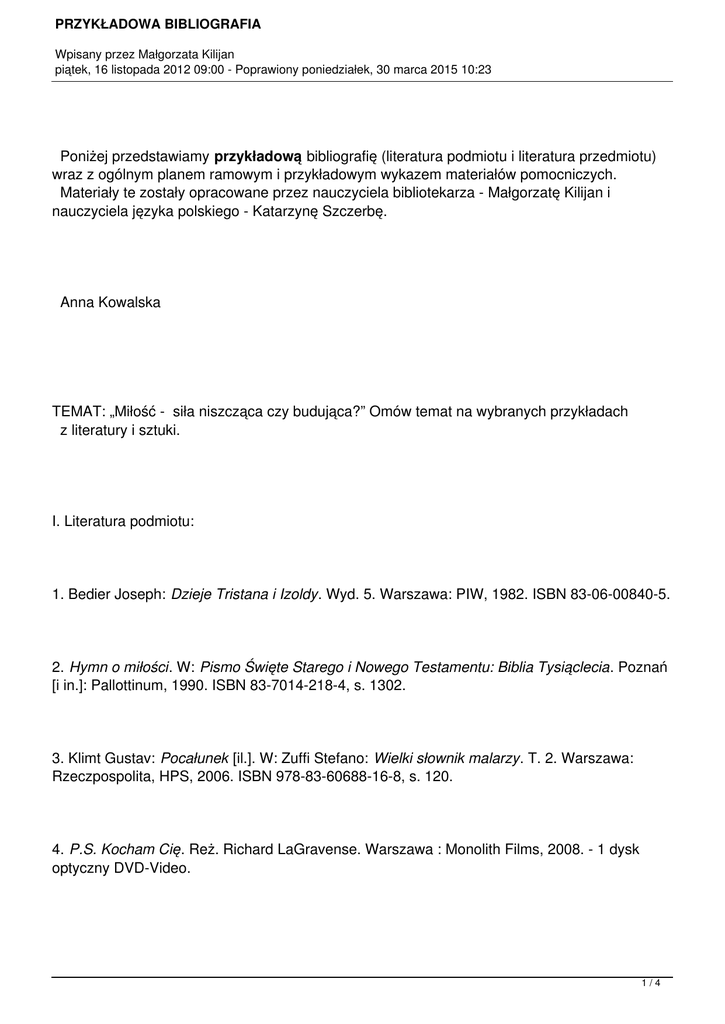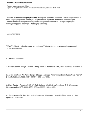 PRZYKŁADOWA BIBLIOGRAFIA Wpisany przez Małgorzata Kilijan piątek, 16 listopada 2012 09:00 - Poprawiony poniedziałek, 30 marca 2015 10:23 Poniżej przedstawiamy przykładową bibliografię (literatura podmiotu i literatura przedmiotu) wraz z ogólnym planem ramowym i przykładowym wykazem materiałów pomocniczych. Materiały te zostały opracowane przez nauczyciela bibliotekarza - Małgorzatę Kilijan i nauczyciela języka polskiego - Katarzynę Szczerbę. Anna Kowalska TEMAT: „Miłość - siła niszcząca czy budująca?” Omów temat na wybranych przykładach z literatury i sztuki. I. Literatura podmiotu: 1. Bedier Joseph: Dzieje Tristana i Izoldy. Wyd. 5. Warszawa: PIW, 1982. ISBN 83-06-00840-5. 2. Hymn o miłości. W: Pismo Święte Starego i Nowego Testamentu: Biblia Tysiąclecia. Poznań [i in.]: Pallottinum, 1990. ISBN 83-7014-218-4, s. 1302. 3. Klimt Gustav: Pocałunek [il.]. W: Zuffi Stefano: Wielki słownik malarzy. T. 2. Warszawa: Rzeczpospolita, HPS, 2006. ISBN 978-83-60688-16-8, s. 120. 4. P.S. Kocham Cię. Reż. Richard LaGravense. Warszawa : Monolith Films, 2008. - 1 dysk optyczny DVD-Video. 1/4 PRZYKŁADOWA BIBLIOGRAFIA Wpisany przez Małgorzata Kilijan piątek, 16 listopada 2012 09:00 - Poprawiony poniedziałek, 30 marca 2015 10:23 5. Pawlikowska-Jasnorzewska Maria: Najpiękniejsze wiersze. Warszawa: „Bis”, 1996. ISBN 83-87082-06-6, s. 41 Miłość. 6. Przerwa-Tetmajer Kazimierz: Hymn do miłości. W: Księga poezji młodopolskiej. Oprac. Elżbieta Zarych. Kraków: Zielona Sowa, 2008. ISBN 978-83-7435-815-6, s. 212-214. 7. Prus Bolesław: Lalka. T. 1-3. Warszawa: Książka i Wiedza, 1991. ISBN 83-05-12564-5. 8. Szekspir Wiliam: Tragedie. T. 2. Warszawa: PIW, 1974, s. 5-136 Romeo i Julia. II. Literatura przedmiotu: 1. Drabarek Barbara, Rowińska Izabela, Stachowicz Aleksandra: Szkoła analizy tekstów kultury . Wyd. 2 popr. Warszawa: AGMEN, 2000. ISBN 83-911795-0-1, s. 200-204 Gustaw Klimt Pocałunek. 2. Hymn o miłości [online]. [dostęp: 03 marca 2010]. Dostępny w Internecie: http://pl.wikipedia .org/wiki/Hymn_o_Mi %C5%82o%C5%9Bci 3. Jabłkowska Róża: Wstęp. W: Szekspir Wiliam: Romeo i Julia. Wyd. 2. Warszawa: PIW, 1964, s. 5- 32. 2/4 PRZYKŁADOWA BIBLIOGRAFIA Wpisany przez Małgorzata Kilijan piątek, 16 listopada 2012 09:00 - Poprawiony poniedziałek, 30 marca 2015 10:23 4. Kott Jan: O „Lalce” Bolesława Prusa. Warszawa: Książka i Wiedza, 1950. 5. Kwiatkowski Jerzy: Wstęp. W: Pawlikowska-Jasnorzewska Maria: Wybór poezji. Wyd. 2 uzup. Wrocław [i in.]: Ossolineum, 1969, s. III-CX. 6. Nosowska Dorota: Słownik motywów literackich. Wyd. 2. Bielsko-Biała: Park, 2004. ISBN 83-7266-314-9, s. 290-297 Miłość. 7. Patrzałek Tadeusz: W świecie lalek Bolesława Prusa. W: Glosariusz od starożytności do pozytywizmu: materiały do kształcenia literackiego w szkole średniej . Pod red. Tadeusza Patrzałka. Wrocław [ i in.]: Zakład Narodowy im. Ossolińskich, 1992. ISBN 83-04-04051-4, s. 272-279. 8. Stachowiak Izabela: Izabeli Łęckiej nieznane oblicze. „Polonistyka” 2003, nr 8, s. 477-480. III. Ramowy plan wypowiedzi: Teza: … 1. Wstęp (określenie problemu). 2. Rozwinięcie (kolejność prezentowanych treści). 3. Zakończenie (wnioski). 3/4 PRZYKŁADOWA BIBLIOGRAFIA Wpisany przez Małgorzata Kilijan piątek, 16 listopada 2012 09:00 - Poprawiony poniedziałek, 30 marca 2015 10:23 IV. Materiały pomocnicze: 1. Aneks z wyborem cytatów. 2. Prezentacja multimedialna (potrzebny komputer). 3. Plansza ze zdjęciami. Podpis zdającego 4/4