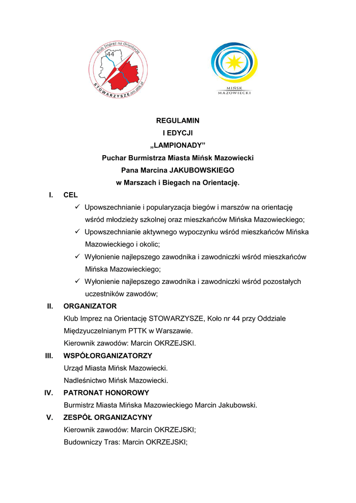REGULAMIN I EDYCJI „LAMPIONADY” Puchar Burmistrza Miasta Mińsk Mazowiecki Pana Marcina JAKUBOWSKIEGO w Marszach i Biegach na Orientację. I. CEL Upowszechnianie i popularyzacja biegów i marszów na orientację wśród młodzieży szkolnej oraz mieszkańców Mińska Mazowieckiego; Upowszechnianie aktywnego wypoczynku wśród mieszkańców Mińska Mazowieckiego i okolic; Wyłonienie najlepszego zawodnika i zawodniczki wśród mieszkańców Mińska Mazowieckiego; Wyłonienie najlepszego zawodnika i zawodniczki wśród pozostałych uczestników zawodów; II. ORGANIZATOR Klub Imprez na Orientację STOWARZYSZE, Koło nr 44 przy Oddziale Międzyuczelnianym PTTK w Warszawie. Kierownik zawodów: Marcin OKRZEJSKI. III. WSPÓŁORGANIZATORZY Urząd Miasta Mińsk Mazowiecki. Nadleśnictwo Mińsk Mazowiecki. IV. PATRONAT HONOROWY Burmistrz Miasta Mińska Mazowieckiego Marcin Jakubowski. V. ZESPÓŁ ORGANIZACYNY Kierownik zawodów: Marcin OKRZEJSKI; Budowniczy Tras: Marcin OKRZEJSKI; VI. TERMIN I MIEJSCE ZAWODÓW Zawody zostaną przeprowadzone w formie V rund (Lokalizacja Mińsk Mazowiecki) w następujących terminach: 1. 29 marca 2015 r. 2. 12 kwietnia 2015 r. 3. 10 maja 2015 r. 4. 7 czerwca 2015 r. 5. 20 czerwca 2015 r. Dokładne lokalizację i długości trasy zastaną podane w komunikacie technicznym zawodów zamieszczonych do dnia 1 lutego 2015 r., na stronie facebookowej zawodów: https://www.facebook.com/lampionadaminskmazowiecki?skip_nax_wizard=tru e&ref_type=bookmark oraz na stronie http://orienteering.waw.pl VII. UCZESTNICTWO W zawodach mogą brać udział wszyscy chętni. Wskazane jest posiadanie przez każdego zawodnika zegarka i kompasu (busoli) oraz dowodu osobistego w celu potwierdzenia tożsamości uczestnika i miejsca zamieszkania. Zegarek ze względu na limit czasu na pokonanie określonej trasy Kompas służy do właściwego zorientowania mapy z wykreśloną trasą, którą uczestnik otrzymuje na starcie. Coś do pisania!!! Chęć zaczerpania aktywności sportowej!!!!Uśmiechu!!!!! VIII. KOSZTY UDZIAŁU Koszt udziału w zawodach wynosi: 30 złotych za wszystkie etapy płatne na pierwszym etapie w sekretariacie zawodów; Dla członków PTTK ( ważna legitymacja ) opłata wynosi za cały cykl 25 złotych; Koszt udziału za jeden etapie wynosi 7 złotych; Kategorie : KM – 12 ( rocznik od 2007r do 2003r ) 8 - 12 lat; KM – 14/16 ( rocznik od 2002r do 1999r ) 13 - 16 lat; KM/N – 10 ( rocznik do 2005r ) do 10 lat ( włącznie ); SĄ ZWOLNIONE Z OPŁAT ZA UDZIAŁ W ZAWODACH IX. SPOSÓB PRZEPROWADZENIA Zawody zostaną przeprowadzone w następujących konkurencjach: MARSZE: TP – TRASA DLA POCZĄTKUJĄCYCH – indywidualnie lub w zespołach 2 -6 osobowych ( Rodziny ) TZ – TRASA DLA ZAAWANSOWANYCH– indywidualnie lub w zespołach 2 osobowych; BIEGI: M - Indywidualnie; Kategorie: KM – 12 ( rocznik od 2007r do 2003r ) 8 - 12 lat; KM – 14/16 ( rocznik od 2002r do 1999r ) 13 - 16 lat; KM – 18 ( rocznik od 1998r do 1997r) 17 - 18 lat; M – 21 ( rocznik do 1985r ) 18 - 30 lat; M – 30 ( rocznik od 1986r - 1975r ) 31 - 40 lat; M – 40 ( rocznik od 1974r do 1965r) 41 - 50 lat; M – WETERANI ( rocznik od 1964r ) >50 lat; K - Indywidualnie; Kategorie: KK – 12 ( rocznik od 2007r do 2003r ) 8 - 12 lat; KK – 14/16 ( rocznik od 2002r do 1999r ) 13 - 16 lat; KK – 18 ( rocznik od 1998r do 1997r) 17 - 18 lat; K – 21 ( rocznik do 1985r ) 18 - 30 lat; K – 30 ( rocznik od 1986r - 1975r ) 31 - 40 lat; K – 40 ( rocznik od 1974r do 1965r) 41 - 50 lat; K – WETERANI ( rocznik od 1964r ) >50 lat; KM/N – z rodzicem ( opiekunem ): KM/N – 10 ( rocznik do 2005r ) do 10 lat ( włącznie ); X. ZGŁOSZENIA Zgłoszeń należy dokonywać przez wysłanie zgłoszenia emaila: [email protected] z następującymi danymi: Imię i Nazwisko, data urodzenia, marsz czy bieg , kategoria, szkoła, adres zamieszkania, Etap; LUB na stronie http://orienteering.waw.pl XI. ŚWIADCZENIA Każdy uczestnik, otrzyma na zakończenie (finał pucharu) Pamiątkowy Medal. Na starcie kartę do potwierdzenia punktów oraz mapę. W miarę możliwości na mecie znajdować się będzie się woda oraz poczęstunek. Zwycięscy poszczególnych kategorii otrzymają pamiątkowy puchar oraz w miarę możliwości niespodzianki. XII. POSTANOWIENIA KOŃCOWE Organizator nie zapewnia opieki medycznej podczas zawodów. Wszyscy uczestnicy biorą udział w rozgrywkach na własną odpowiedzialność, organizator nie ubezpiecza zawodników od NNW. Za ewentualne szkody dokonane na terenie rozgrywania zawodów sportowych odpowiadają uczestnicy. Za rzeczy wartościowe pozostawione przez zawodnika organizator nie ponosi odpowiedzialności. Za rażące naruszenia niniejszego regulaminu lub niesportowe zachowanie organizator może zdyskwalifikować zawodnika z całego cyklu zawodów. Zabronione jest usuwanie, przenoszenie i maskowanie punktów kontrolnych. Zawody odbędą się bez względu na warunki atmosferyczne. W miarę możliwości organizator zapewni na mecie zawodów ciepły napój lub wodę. Startujący odbierając kartę startową godzi się na wszelkie postanowienia powyższego regulaminu. Każdy z uczestników obowiązany jest posiadać dowód osobisty celem potwierdzenia daty swego urodzenia oraz zamieszkania.