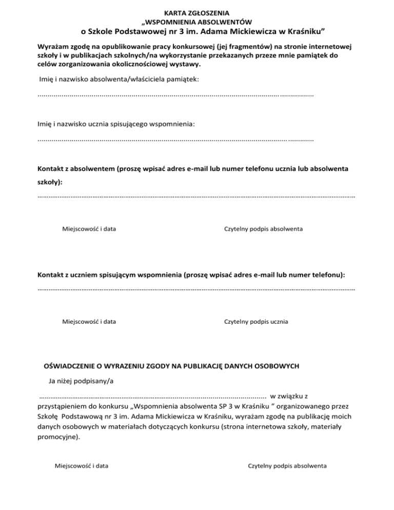 KARTA ZGŁOSZENIA „WSPOMNIENIA ABSOLWENTÓW o Szkole Podstawowej nr 3 im. Adama Mickiewicza w Kraśniku” Wyrażam zgodę na opublikowanie pracy konkursowej (jej fragmentów) na stronie internetowej szkoły i w publikacjach szkolnych/na wykorzystanie przekazanych przeze mnie pamiątek do celów zorganizowania okolicznościowej wystawy. Imię i nazwisko absolwenta/właściciela pamiątek: .......................................................................................................................................... Imię i nazwisko ucznia spisującego wspomnienia: .......................................................................................................................................... Kontakt z absolwentem (proszę wpisać adres e-mail lub numer telefonu ucznia lub absolwenta szkoły): ………………………………………………………………………………………………………………………………………………………… Miejscowość i data Czytelny podpis absolwenta Kontakt z uczniem spisującym wspomnienia (proszę wpisać adres e-mail lub numer telefonu): ………………………………………………………………………………………………………………………………………………………… Miejscowość i data Czytelny podpis ucznia OŚWIADCZENIE O WYRAZENIU ZGODY NA PUBLIKACJĘ DANYCH OSOBOWYCH Ja niżej podpisany/a ………………………………………………………………................................................ w związku z przystąpieniem do konkursu „Wspomnienia absolwenta SP 3 w Kraśniku ” organizowanego przez Szkołę Podstawową nr 3 im. Adama Mickiewicza w Kraśniku, wyrażam zgodę na publikację moich danych osobowych w materiałach dotyczących konkursu (strona internetowa szkoły, materiały promocyjne). Miejscowość i data Czytelny podpis absolwenta