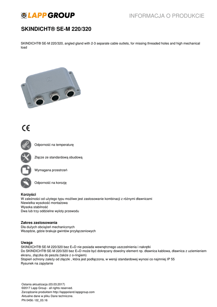 INFORMACJA O PRODUKCIE SKINDICHT® SE-M 220/320 SKINDICHT® SE-M 220/320, angled gland with 2-3 separate cable outlets, for missing threaded holes and high mechanical load Odporność na temperaturę Złącze ze standardową obudową Wymagana przestrzeń Odporność na korozję Korzyści W zależności od użytego typu możliwe jest zastosowanie kombinacji z różnymi dławnicami Niewielka wysokość montażowa Wysoka stabilność Dwa lub trzy oddzielne wyloty przewodu Zakres zastosowania Dla dużych obciążeń mechanicznych Wszędzie, gdzie brakuje gwintów przyłączeniowych Uwaga SKINDICHT® SE-M 220/320 bez E+D nie posiada wewnętrznego uszczelnienia i nakrętki Do SKINDICHT® SE-M 220/320 bez E+D może być dokręcany dowolny element np. dławnica kablowa, dławnica z uziemieniem ekranu, złączka do peszla (także z o-ringiem) Stopień ochrony zależy od złączki , która jest podłączona, w wersji standardowej wynosi co najmniej IP 55 Rysunek na zapytanie Ostania aktualizacja (03.03.2017) ©2017 Lapp Group - all rights reserved. Zarządzanie produktem http://lapppoland.lappgroup.com Aktualne dane w pliku Dane techniczne. PN 0456 / 02_03.16 INFORMACJA O PRODUKCIE SKINDICHT® SE-M 220/320 Dane techniczne Klasyfikacja: ETIM 5.0 Class-ID: EC000441 Opis klasy ETIM 5.0: Dławnica kablowa Materiał: Korpus: ciśnieniowy odlew cynkowy, lakier młotkowy Śruba dociskowa: mosiądz niklowany Nacięty pierścień uszczelniający: CR/NBR Płaski pierścień uszczelniający: SBR Stopień ochrony: IP 55 Zakres temperatury: Od -20°C do +80°C Wskazówka Fotografie nie mogą być używane do wymiarowania oraz nie stanowią szczegółowego odwzorowania przedstawionych produktów. * Podane ceny to ceny netto bez podatku VAT i dodatkowych opłat. Sprzedaż klientom biznesowym. Ostania aktualizacja (03.03.2017) ©2017 Lapp Group - all rights reserved. Zarządzanie produktem http://lapppoland.lappgroup.com Aktualne dane w pliku Dane techniczne. PN 0456 / 02_03.16 Powered by TCPDF (www.tcpdf.org) Oznaczenie produktu/rozmiar Nacięty pierścień uszczelniający ØF [mm] 52108040 2 x M20 x 1,5 2 x 4/7/10/13 52108050 3 x M20 x 1,5 3 x 4/7/10/13 SKINDICHT® SE-M 220/320 SKINDICHT® SE-M 220/320 bez E+D 52108041 2 x M20 x 1,5 52108051 3 x M20 x 1,5 SKINDICHT® SE-M 220/320 Ostania aktualizacja (03.03.2017) ©2017 Lapp Group - all rights reserved. Zarządzanie produktem http://lapppoland.lappgroup.com Aktualne dane w pliku Dane techniczne. PN 0456 / 02_03.16 INFORMACJA O PRODUKCIE Powered by TCPDF (www.tcpdf.org) Numer katalogowy