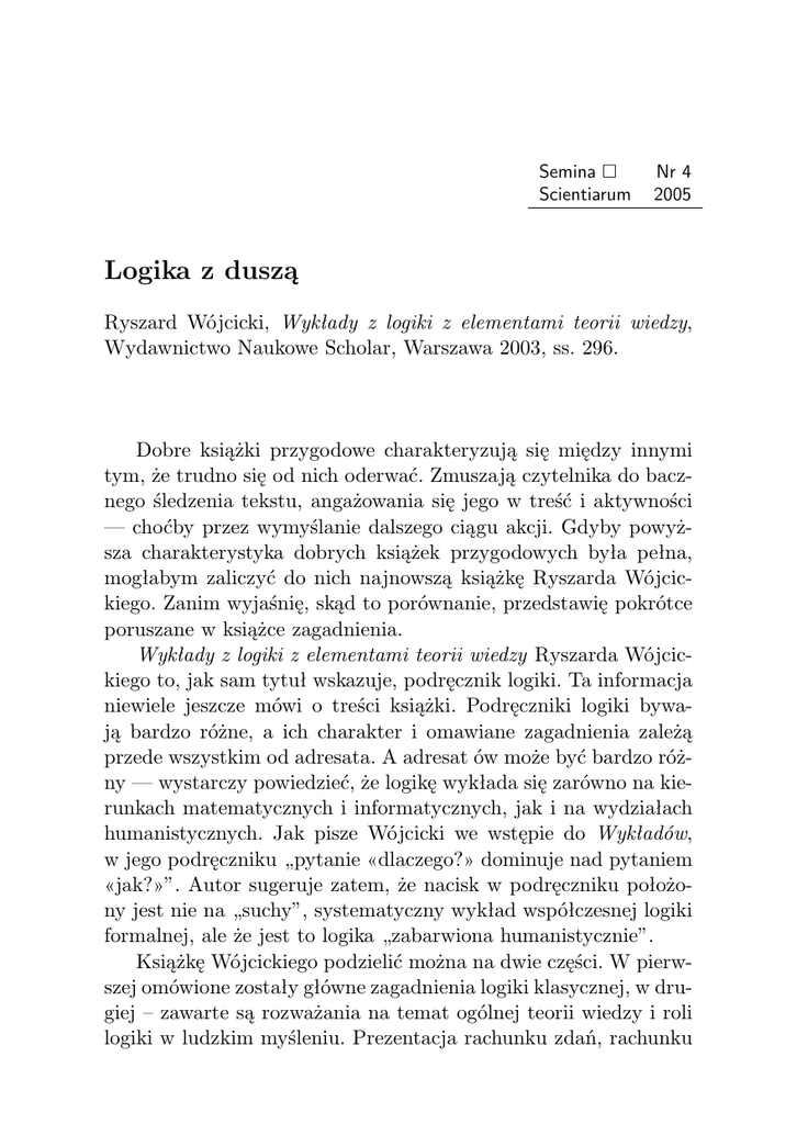 Semina Scientiarum Nr 4 2005 Logika z duszą Ryszard Wójcicki, Wykłady z logiki z elementami teorii wiedzy, Wydawnictwo Naukowe Scholar, Warszawa 2003, ss. 296. Dobre książki przygodowe charakteryzują się między innymi tym, że trudno się od nich oderwać. Zmuszają czytelnika do bacznego śledzenia tekstu, angażowania się jego w treść i aktywności — choćby przez wymyślanie dalszego ciągu akcji. Gdyby powyższa charakterystyka dobrych książek przygodowych była pełna, mogłabym zaliczyć do nich najnowszą książkę Ryszarda Wójcickiego. Zanim wyjaśnię, skąd to porównanie, przedstawię pokrótce poruszane w książce zagadnienia. Wykłady z logiki z elementami teorii wiedzy Ryszarda Wójcickiego to, jak sam tytuł wskazuje, podręcznik logiki. Ta informacja niewiele jeszcze mówi o treści książki. Podręczniki logiki bywają bardzo różne, a ich charakter i omawiane zagadnienia zależą przede wszystkim od adresata. A adresat ów może być bardzo różny — wystarczy powiedzieć, że logikę wykłada się zarówno na kierunkach matematycznych i informatycznych, jak i na wydziałach humanistycznych. Jak pisze Wójcicki we wstępie do Wykładów, w jego podręczniku „pytanie «dlaczego?» dominuje nad pytaniem «jak?»”. Autor sugeruje zatem, że nacisk w podręczniku położony jest nie na „suchy”, systematyczny wykład współczesnej logiki formalnej, ale że jest to logika „zabarwiona humanistycznie”. Książkę Wójcickiego podzielić można na dwie części. W pierwszej omówione zostały główne zagadnienia logiki klasycznej, w drugiej – zawarte są rozważania na temat ogólnej teorii wiedzy i roli logiki w ludzkim myśleniu. Prezentacja rachunku zdań, rachunku Logika z duszą 159 predykatów i sylogistyki, dokonana w pierwszych dziewięciu rozdziałach, nie jest dla Wójcickiego celem samym w sobie. Konkretne rachunki logiczne stają się pretekstem dla filozoficznej refleksji nad głównymi pojęciami logiki. Nie lekceważąc ściśle formalnego ujęcia problematyki, Wójcicki stara się zachować równowagę pomiędzy systematycznym wykładem logiki formalnej a intuicyjnym ujęciem omawianych zagadnień. Rozpoczyna od przedstawienia podstaw teorii mnogości — jako teorii uważanej dziś za podstawę zarówno matematyki, jak i logiki. Na tej podstawie wprowadzone zostają pojęcia teorii, stałej logicznej, czy wypowiedzi sformalizowanej. Kolejnym omawianym zagadnieniem jest sylogistyka Arystotelesa. Na jej przykładzie Wójcicki pokazuje, na czym polega logiczna dedukcja i metoda aksjomatyczna. W części poświęconej logice pierwszego rzędu i rachunkowi zdań autor przeprowadza dyskusję nad pojęciem reguły inferencji i pojęciem dowodu. Rachunkowi predykatów poświęcone są aż cztery rozdziały, a jego ujęcie jest niestandardowe — choćby przez użytą notację. Zamiast tradycyjnych symboli, autor, na oznaczenie predykatów, posługuje się wyróżnionymi specjalną czcionką słowami języka naturalnego. Taka notacja bardziej odpowiada intuicyjnemu rozumieniu pojęcia predykatu (cechy orzekanej o pewnych przedmiotach). Troska o zachowanie związku między rachunkiem logicznym a fragmentem języka, któremu ten rachunek odpowiada, świadczy o pragmatycznym nastawieniu autora. W drugiej części książki autor omawia pojęcie teorii wiedzy, podkreślając jej związki z formalnym komponentem logiki. Ostatnie rozdziały stają się dla Wójcickiego okazją do postawienia pytań o nie–logiczne składowe naszego myślenia i o związek logiki z ludzką racjonalnością. Czy nasze myślenie jest logiczne? Czy logika wypowiada normy poprawnego myślenia? Jeśli tak, co owe normy uprawomocnia? Przez kilka ostatnich rozdziałów przewija się też pytanie o granice logiki. Dyscyplina ta jawi się tam jako wyjątkowo ważne, ale nie jedyne, doskonałe i «ukończone» narzędzie badania ludzkich przekonań, rozumowań i systemu wiedzy. 160 | Polemiki i recenzje Pora teraz powiedzieć, co decyduje o dynamicznym charakterze książki Wójcickiego, który tak bardzo zbliża ją do powieści przygodowej. Tę cechę — przyznać trzeba nietypową, jak na podręcznik i to podręcznik logiki — uzyskuje autor za pomocą kilku zabiegów. Przede wszystkim Wójcicki nie traktuje wykładanych kwestii jako ostatecznie ustalonych faktów. Wręcz przeciwnie — problemy są rozpatrywane w «dialogu» z czytelnikiem, a autor zwraca uwagę na najciekawsze filozoficznie zagadnienia swojego wykładu. Pojęcia nie są definiowane «raz na zawsze» — jesteśmy wręcz świadkami tworzenia kolejnych sformułowań definicji. To wszystko sprawia, że logika nie jest w podręczniku Wójcickiego skończonym, statycznym zbiorem twierdzeń. Jest dziedziną żywą i pełną fascynujących zagadnień, których rozpatrywanie pozwala krytycznie spojrzeć zarówno na metodologię nauk, jak i na własne myślenie. Według mnie najbardziej pomysłowym i zarazem «dynamizującym» zabiegiem Ryszarda Wójcickiego są jednak tzw. testy, czyli pewne zadania stawiane co jakiś czas przed czytelnikiem. Zadania te nie są jednak, jak to bywa w podręcznikach logiki, ćwiczeniami umieszczonymi na końcu rozdziału, często wykonywanymi czysto mechanicznie. Testy Ryszarda Wójcickiego zawierają istotną dla podręcznika treść i są wkomponowane w tok narracji. Dzięki temu, interesującemu także z psychologicznego punktu widzenia, zabiegowi, czytelnik może stale kontrolować swój tok rozumowania i jest zmuszony do współtworzenia treści książki. Rozwiązania testów, umieszczone na końcu podręcznika, pozwalają sprawdzić poprawność swoich intuicji. Z książką przygodową Wykłady mają jeszcze jedną cechę wspólną: po przeczytaniu czuje się niedosyt. Szkoda, że to już koniec, że na przykład w książce nie znalazły się także filozoficzne rozważania o innych problemach logiki — chociażby na temat logik nieklasycznych. Trudno jednak u