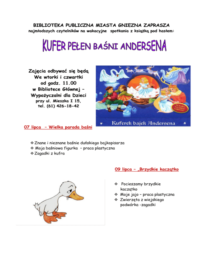 BIBLIOTEKA PUBLICZNA MIASTA GNIEZNA ZAPRASZA najmłodszych czytelników na wakacyjne spotkania z książką pod hasłem: Zajęcia odbywać się będą We wtorki i czwartki od godz. 11.00 w Bibliotece Głównej – Wypożyczalni dla Dzieci przy ul. Mieszka I 15, tel. (61) 426-18-42 07 lipca – Wielka parada baśni Znane i nieznane baśnie duńskiego bajkopisarza Moja baśniowa figurka – praca plastyczna Zagadki z kufra 09 lipca – „Brzydkie kaczątko Pocieszamy brzydkie kaczątko Moje jajo – praca plastyczna Zwierzęta z wiejskiego podwórka -zagadki 14 lipca – „Dziecię elfów' „ Kwiatek w doniczce – praca plastyczna Jestem kwiatem – zabawa ruchowa Kartka z żabą - praca trójwymiarowa 16 lipca – „Dziewczynka z zapałkami Lista uczuć – rozmowa Wyczaruję z zapałek – praca plastyczna Szczęśliwe zakończenie baśni – praca twórcza 21 lipca – „Igła do cerowania Sposoby wykorzystania igły – zabawa twórcza Jak wyglądała igła -broszka? - praca plastyczna Taniec igły z nitką - zabawa 23 lipca – „Imbryk” Przepis na szczęście – zabawa Imbryk z plasteliny – praca plastyczna Zalety i wady – gra dramowa 28 lipca – Księżniczka na ziarnku grochu Jestem księżniczką – zabawa ruchowa Sposoby wykorzystania ziarnka grochu – burza mózgów Marzenia senne – praca plastyczna 30 lipca – Len Promyczki od słowa len – zabawa twórcza Kadry z filmu „Len”- praca plastyczna Strój z lnu – zabawa z gazetami 04 sierpnia – „Mała syrenka” Podwodne królestwo – praca plastyczna Straciłam głos- kalambury Portret syrenki – kolaż 06 sierpnia –Najpiękniejsza róża świata Oto róża – wycinanka Ogród pełen kwiatów - zagadki „Siedziała róża w ogrodzie” – zabawa 11 sierpnia –Pasterka i kominiarczyk Jestem pasterką, jestem kominiarczykiem – wcielanie się w role Gwiazda z papieru – praca plastyczna Mapa wyprawy 13 sierpnia –Stara latarnia Świeczka z plasteliny – praca plastyczna Zagadki o uczuciach Serce pełne blasku – kartka z życzeniami 18 sierpnia - Świniopas Taniec księżniczek – zabawa ruchowa Słowik i róża – teatr cieni Rozpoznawanie smaków – zabawa 20 sierpnia – Talizman Kiedy jesteśmy zadowoleni? – burza mózgów Przepis na szczęście – zabawa twórcza Mój talizman – praca plastyczna 25 sierpnia – Zupa z kołka od kiełbasy Mysz z papieru – praca plastyczna Rób to, co mysz – zabawa naśladowcza Baśniowa książka kucharska – układanie przepisów 27 sierpnia – Kolorowe baśnie Zakończenie zajęć godz. 11.00 Moja ulubiona baśń Andersena – praca plastyczna Z jakiej jestem baśni - konkurs Z baśniami na ty – test