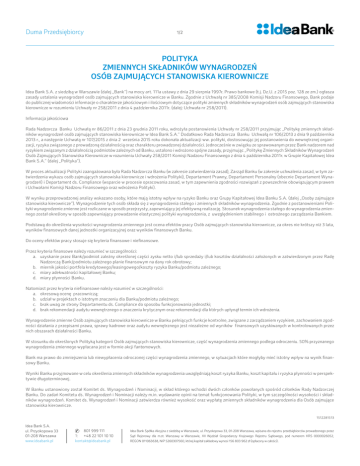 Duma Przedsiębiorcy 1/2 Polityka zmiennych składników wynagrodzeń osób zajmujących stanowiska kierownicze Idea Bank S.A. z siedzibą w Warszawie (dalej „Bank”) na mocy art. 111a ustawy z dnia 29 sierpnia 1997r. Prawo bankowe (t.j. Dz.U. z 2015 poz. 128 ze zm.) ogłasza zasady ustalania wynagrodzeń osób zajmujących stanowiska kierownicze w Banku. Zgodnie z Uchwałą nr 385/2008 Komisji Nadzoru Finansowego, Bank podaje do publicznej wiadomości informacje o charakterze jakościowym i ilościowym dotyczące polityki zmiennych składników wynagrodzeń osób zajmujących stanowiska kierownicze w rozumieniu Uchwały nr 258/2011 z dnia 4 października 2011r. (dalej: Uchwała nr 258/2011). Informacja jakościowa Rada Nadzorcza Banku Uchwałą nr 86/2011 z dnia 23 grudnia 2011 roku, wdrożyła postanowienia Uchwały nr 258/2011 przyjmując „Politykę zmiennych składników wynagrodzeń osób zajmujących stanowiska kierownicze w Idea Bank S.A.” Dodatkowo Rada Nadzorcza Banku Uchwałą nr 106/2013 z dnia 9 października 2013 r., a następnie Uchwałą nr 107/2015 z dnia 2 września 2015 roku dokonała aktualizacji ww. polityki, dostosowując jej postanowienia do wewnętrznej organizacji, ryzyka związanego z prowadzoną działalnością oraz charakteru prowadzonej działalności. Jednocześnie w związku ze sprawowanym przez Bank nadzorem nad ryzykiem związanym z działalnością podmiotów zależnych od Banku, ustalono i wdrożono spójne zasady, przyjmując „Politykę Zmiennych Składników Wynagrodzeń Osób Zajmujących Stanowiska Kierownicze w rozumieniu Uchwały 258/2011 Komisji Nadzoru Finansowego z dnia 4 października 2011r. w Grupie Kapitałowej Idea Bank S.A.” (dalej „Polityka”). W proces aktualizacji Polityki zaangażowana była Rada Nadzorcza Banku (w zakresie zatwierdzenia zasad), Zarząd Banku (w zakresie uchwalenia zasad, w tym zatwierdzenia wykazu osób zajmujących stanowiska kierownicze i wdrożenia Polityki), Departament Prawny, Departament Personalny (obecnie Departament Wynagrodzeń) i Departament ds. Compliance (wsparcie w procesie opracowania zasad, w tym zapewnienia zgodności rozwiązań z powszechnie obowiązującym prawem i Uchwałami Komisji Nadzoru Finansowego oraz wdrożenia Polityki). W wyniku przeprowadzonej analizy wskazano osoby, które mają istotny wpływ na ryzyko Banku oraz Grupy Kapitałowej Idea Banku S.A. (dalej „Osoby zajmujące stanowiska kierownicze”). Wynagrodzenie tych osób składa się z wynagrodzenia stałego i zmiennych składników wynagrodzenia. Zgodnie z postanowieniami Polityki wynagrodzenie zmienne jest rozliczane w sposób przejrzysty, zapewniający jej efektywną realizację. Stosunek wynagrodzenia stałego do wynagrodzenia zmiennego został określony w sposób zapewniający prowadzenie elastycznej polityki wynagrodzenia, z uwzględnieniem stabilnego i ostrożnego zarządzania Bankiem. Podstawą do określenia wysokości wynagrodzenia zmiennego jest ocena efektów pracy Osób zajmujących stanowiska kierownicze, za okres nie krótszy niż 3 lata, wyników finansowych danej jednostki organizacyjnej oraz wyników finansowych Banku. Do oceny efektów pracy stosuje się kryteria finansowe i niefinansowe. Przez kryteria finansowe należy rozumieć w szczególności: a. uzyskanie przez Bank/podmiot zależny określonej części zysku netto i/lub sprzedaży i/lub kosztów działalności założonych w zatwierdzonym przez Radę Nadzorczą Bank/podmiotu zależnego planie finansowym na dany rok obrotowy; b. miernik jakości portfela kredytowego/leasingowego/koszty ryzyka Banku/podmiotu zależnego; c. miary adekwatności kapitałowej Banku; d. miary płynności Banku. Natomiast przez kryteria niefinansowe należy rozumieć w szczególności: a. okresową ocenę pracowniczą; b. udział w projektach o istotnym znaczeniu dla Banku/podmiotu zależnego; c. brak uwag ze strony Departamentu ds. Compliance do sposobu funkcjonowania jednostki; d. brak rekomendacji audytu wewnętrznego o znaczeniu krytycznym oraz rekomendacji dla których upłynął termin ich wdrożenia. Wynagrodzenie zmienne Osób zajmujących stanowiska kierownicze w Banku pełniących funkcje kontrolne, związane z zarządzaniem ryzykiem, zachowaniem zgodności działania z przepisami prawa, sprawy kadrowe oraz audytu wewnętrznego jest niezależne od wyników finansowych uzyskiwanych w kontrolowanych przez nich obszarach działalności Banku. W stosunku do określonych Polityką kategorii Osób zajmujących stanowiska kierownicze, część wynagrodzenia zmiennego podlega odroczeniu. 50% przyznanego wynagrodzenia zmiennego wypłacana jest w formie akcji fantomowych. Bank ma prawo do zmniejszenia lub niewypłacenia odroczonej części wynagrodzenia zmiennego, w sytuacjach które mogłyby mieć istotny wpływ na wynik finansowy Banku. Wyniki Banku przyjmowane w celu określenia zmiennych składników wynagrodzenia uwzględniają koszt ryzyka Banku, koszt kapitału i ryzyka płynności w perspektywie długoterminowej. W Banku ustanowiony został Komitet ds. Wynagrodzeń i Nominacji, w skład którego wchodzi dwóch członków powołanych spośród członków Rady Nadzorczej Banku. Do zadań Komitetu ds. Wynagrodzeń i Nominacji należy m.in. wydawanie opinii na temat funkcjonowania Polityki, w tym szczególności wysokości i składników wynagrodzeń. Komitet ds. Wynagrodzeń i Nominacji zatwierdza również wysokość oraz wypłatę zmiennych składników wynagrodzenia dla Osób zajmujące stanowiska kierownicze. 1512281513 Idea Bank S.A. ul. Przyokopowa 33 01-208 Warszawa www.ideabank.pl 801 999 111 +48 22 101 10 10 [email protected] T: Idea Bank Spółka Akcyjna z siedzibą w Warszawie, ul. Przyokopowa 33, 01-208 Warszawa, wpisana do rejestru przedsiębiorców prowadzonego przez Sąd Rejonowy dla m.st. Warszawy w Warszawie, XII Wydział Gospodarczy Krajowego Rejestru Sądowego, pod numerem KRS 0000026052, REGON 011063638, NIP 5260307560, której kapitał za