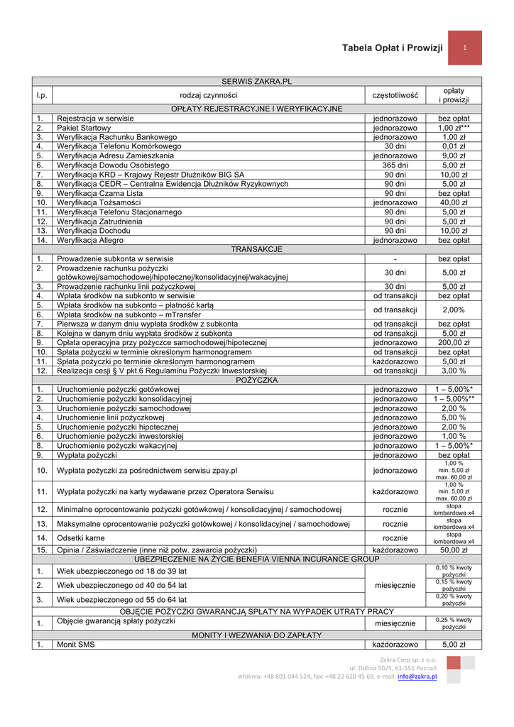 Tabela Opłat i Prowizji 1 SERWIS ZAKRA.PL l.p. rodzaj czynności częstotliwość opłaty i prowizji jednorazowo jednorazowo jednorazowo 30 dni jednorazowo 365 dni 90 dni 90 dni 90 dni jednorazowo 90 dni 90 dni 90 dni jednorazowo bez opłat 1,00 zł*** 1,00 zł 0,01 zł 9,00 zł 5,00 zł 10,00 zł 5,00 zł bez opłat 40,00 zł 5,00 zł 5,00 zł 10,00 zł bez opłat - bez opłat 30 dni 5,00 zł 30 dni od transakcji 5,00 zł bez opłat od transakcji 2,00% od transakcji od transakcji jednorazowo od transakcji każdorazowo od transakcji bez opłat 5,00 zł 200,00 zł bez opłat 5,00 zł 3,00 % jednorazowo jednorazowo jednorazowo jednorazowo jednorazowo jednorazowo jednorazowo jednorazowo 1 – 5,00%* 1 – 5,00%** 2,00 % 5,00 % 2,00 % 1,00 % 1 – 5,00%* bez opłat 1. 2. 3. 4. 5. 6. 8. 9. OPŁATY REJESTRACYJNE I WERYFIKACYJNE Rejestracja w serwisie Pakiet Startowy Weryfikacja Rachunku Bankowego Weryfikacja Telefonu Komórkowego Weryfikacja Adresu Zamieszkania Weryfikacja Dowodu Osobistego Weryfikacja KRD – Krajowy Rejestr Dłużników BIG SA Weryfikacja CEDR – Centralna Ewidencja Dłużników Ryzykownych Weryfikacja Czarna Lista Weryfikacja Tożsamości Weryfikacja Telefonu Stacjonarnego Weryfikacja Zatrudnienia Weryfikacja Dochodu Weryfikacja Allegro TRANSAKCJE Prowadzenie subkonta w serwisie Prowadzenie rachunku pożyczki gotówkowej/samochodowej/hipotecznej/konsolidacyjnej/wakacyjnej Prowadzenie rachunku linii pożyczkowej Wpłata środków na subkonto w serwisie Wpłata środków na subkonto – płatność kartą Wpłata środków na subkonto – mTransfer Pierwsza w danym dniu wypłata środków z subkonta Kolejna w danym dniu wypłata środków z subkonta Opłata operacyjna przy pożyczce samochodowej/hipotecznej Spłata pożyczki w terminie określonym harmonogramem Spłata pożyczki po terminie określonym harmonogramem Realizacja cesji § V pkt.6 Regulaminu Pożyczki Inwestorskiej POŻYCZKA Uruchomienie pożyczki gotówkowej Uruchomienie pożyczki konsolidacyjnej Uruchomienie pożyczki samochodowej Uruchomienie linii pożyczkowej Uruchomienie pożyczki hipotecznej Uruchomienie pożyczki inwestorskiej Uruchomienie pożyczki wakacyjnej Wypłata pożyczki 10. Wypłata pożyczki za pośrednictwem serwisu zpay.pl jednorazowo 11. Wypłata pożyczki na karty wydawane przez Operatora Serwisu każdorazowo 12. Minimalne oprocentowanie pożyczki gotówkowej / konsolidacyjnej / samochodowej rocznie 13. Maksymalne oprocentowanie pożyczki gotówkowej / konsolidacyjnej / samochodowej rocznie 14. Odsetki karne rocznie 15. Opinia / Zaświadczenie (inne niż potw. zawarcia pożyczki) każdorazowo UBEZPIECZENIE NA ŻYCIE BENEFIA VIENNA INCURANCE GROUP 1. Wiek ubezpieczonego od 18 do 39 lat 2. Wiek ubezpieczonego od 40 do 54 lat 3. Wiek ubezpieczonego od 55 do 64 lat 0,10 % kwoty pożyczki 0,15 % kwoty pożyczki 0,20 % kwoty pożyczki 1. OBJĘCIE POŻYCZKI GWARANCJĄ SPŁATY NA WYPADEK UTRATY PRACY Objęcie gwarancją spłaty pożyczki miesięcznie 0,25 % kwoty pożyczki 1. Monit SMS 1. 2. 3. 4. 5. 6. 7. 8. 9. 10. 11. 12. 13. 14. 1. 2. 3. 4. 5. 6. 7. 8. 9. 10. 11. 12. miesięcznie 1,00 % min. 5,00 zł max. 60,00 zł 1,00 % min. 5,00 zł max. 60,00 zł stopa lombardowa x4 stopa lombardowa x4 stopa lombardowa x4 50,00 zł MONITY I WEZWANIA DO ZAPŁATY każdorazowo Zakra Corp sp. z o.o. ul. Dolina 5D/5, 61-‐551 Poznań infolinia: +48 801 044 524, fax: +48 22 620 45 69, e-‐mail: [email protected] 5,00 zł Tabela Opłat i Prowizji 2 2. 3. 4. 5. 6. 7. 1. 2. 3. 4. 5. 6. 7. 1. Monit e-mail Monit telefoniczny Monit wysłany pocztą tradycyjną Ostateczne wezwanie do zapłaty Wizyta pracownika Serwisu Zakra.pl w miejscu zamieszkania / pracy Opłata za nie wywiązanie się z obowiązku dostarczenia dokumentów w przypadku pożyczki samochodowej WINDYKACJA SĄDOWA Przygotowanie pozwu o wydanie nakazu zapłaty Opłata sądowa za złożenie pozwu Zaliczka na poczet kosztów egzekucji komorniczej od 200,00 zł do 500,00 zł od 500,01 zł do 1000,00 zł od 1000,01 zł do 3000,00 zł powyżej 3000,00 zł INNE Przypomnienie numeru PIN - SMS każdorazowo każdorazowo każdorazowo każdorazowo od wizyty 5,00 zł 10,00 zł 30,00 zł 40,00 zł 100,00 zł jednorazowo 200,00 zł jednorazowo jednorazowo jednorazowo 50,00 zł indywidualnie 205,00 zł 35,00 % 30,00 % 18,00 % 13,00 % od transakcji każdorazowo 1,00 zł * Prowizja Serwisu za uruchomienie pożyczki gotówkowej wynosi 5% jej kwoty. Weryfikacja zatrudnienia obniża prowizję o 1%, weryfikacja dochodu obniża prowizję o 1%, weryfikacja tożsamości obniża prowizję o 1%, aktywne inwestycje w kwocie nie mniejszej niż 5000,00 zł obniżają prowizję o 1%, zakup ubezpieczenia na życie obniża prowizję o 1%. Wykonanie trzech z ww. weryfikacji dodatkowych umożliwiają otrzymanie pożyczki z 1% prowizją z zastrzeżeniem, że Użytkownik skorzysta z opcji ubezpieczenia na życie. ** Prowizja Serwisu za uruchomienie pożyczki konsolidacyjnej wynosi 5% jej kwoty. Weryfikacja zatrudnienia obniża prowizję o 1%, weryfikacja dochodu obniża prowizję o 1%, weryfikacja tożsamości obniża prowizję o 1%, aktywne inwestycje w kwocie nie mniejszej niż 5000,00 zł obniżają prowizję o 1%, zakup ubezpieczenia na życie obniża prowizję o 1%. Wykonanie trzech z ww. weryfikacji dodatkowych umożliwiają otrzymanie pożyczki z 1% prowizją z zastrzeżeniem, że Użytkownik skorzysta z opcji ubezpieczenia na życie. *** Pakiet Startowy obowiązuje jedynie w okresie promocji podanym w Regulaminie Promocji Pakiet Startowy i dotyczy jedynie tych Użytkowników, którzy nigdy wcześniej nie wykonywali żadnych weryfikacji, nie posiadali i nie posiadają w serwisie żadnych pożyczek ani nie inwestowali. Zakra Corp sp. z o.o. ul. Dolina 5D/5, 61-‐551 Poznań infolinia: +48 801 044 524, fax: +48 22 620 45 69, e-‐mail: [email protected]