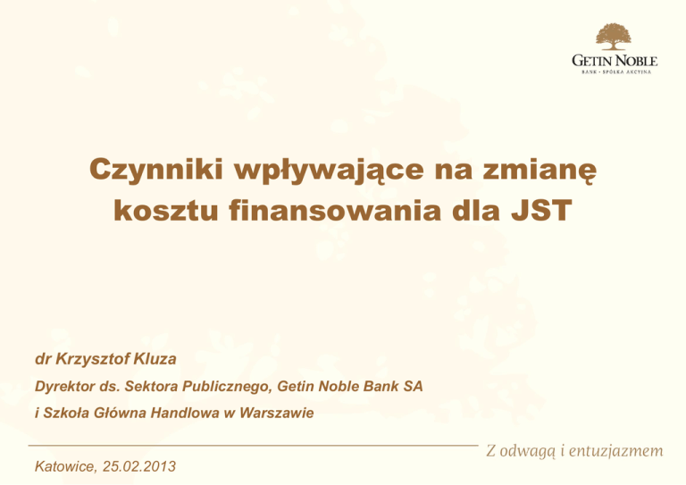 Czynniki wpływające na zmianę kosztu finansowania dla JST dr Krzysztof Kluza Dyrektor ds. Sektora Publicznego, Getin Noble Bank SA i Szkoła Główna Handlowa w Warszawie Katowice, 25.02.2013 Wskaźniki długu JST – ewolucja • Wskaźniki 60 / 15 • Nadwyżka operacyjna • Art. 243 • Ustawa o działalności leczniczej (art. 59, art. 72, art. 190) • Limit deficytu 2 Istotne napięcia po stronie wskaźników Największe miasta – klasyfikacja wg całkowitego zadłużenia w relacji do dochodów (dane za 2011r) Wpływ art. 243 na dostęp do finansowania nowych inwestycji (dane za 2011r) Grupa Jednostki, przekraczające [%] nowy wskaźnik zadłużenia Województwa 0 0% 119 38% Miasta na pr. powiatu 9 14% Gminy miejskie 39 16% Gminy miejsko-wiejskie 92 15% Gminy wiejskie 205 13% Ogółem 464 17% Powiaty ziemskie Propozycja wprowadzenia limitów deficytu na poziomie 4%, 3%, 2% i 1% wymusiłaby ograniczenie inwestycji w przypadku ok. 80% JST. 3 Rosnąca skala konsolidacji / refinansowania istniejących długów 4 Wymogi art. 243 wymuszają długie karencje dla nowego długu i kredytów konsolidacyjnych Analiza dla przetargów z grudnia 2012 roku Okres karencji Liczba przetargów Karencja poniżej 2 lat 48% 2 lata karencji 21% 3-4 lata karencji 21% 5 lat lub powyżej 10% Uwaga: analiza nie uwzględnia ukrytych karencji czyli nieliniowej spłaty kapitału; zwiększają one faktyczną karencję o min. 1 rok Poza skutkiem w postaci wzrostu kosztu finansowania (lub problemów z uzyskaniem finansowania w ogóle), wydłużenie okresu karencji pozwala na ponadprzeciętny wzrost poziomu długu, który może w przyszłości skutkować wpadnięciem w spiralę zadłużenia. Dodatkowo oznacza faktyczne przesunięcie spłaty długu poza okres kadencji wyborczej. 5 Wpływ Bazylei III na finansowanie JST Bazylea III to regulacje związane z adekwatnością kapitałową banków. Ich celem jest: • Zwiększenie wyposażenia banków w kapitały • Poprawa bezpieczeństwa płynnościowego banków • Zmniejszenie niedopasowania wymagalności aktywów i pasywów Efekty dla JST i podmiotów powiązanych: • Neutralny wpływ na JST • Negatywny wpływ na finansowanie inwestycji spółek komunalnych i SP ZOZ bez poręczenia JST; preferencje dla kredytów obrotowych • Wzmocnienie w bankach tendencji do poszukiwania dochodów transakcyjnych (pozaodsetkowych) 6 W ubiegłym roku koszt finansowania dla JST wzrósł o ok. 55 pb 1,80 1,63 1,60 1,40 1,20 1,20 1,00 0,80 1,24 1,13 1,00 0,79 0,85 0,75 0,60 0,40 0,20 0,00 marża uwzgl. prowizję średnia roczna 7 Co szósty samorząd płaci za kredyt powyżej 180 pb; koszt obligacji jest jeszcze wyższy 8 Co może przynieść 2013 rok? • Nowe, bardziej restrykcyjne krajowe rozwiązania prawne odnośnie zadłużania się przez JST • Prawdopodobne napięcia po stronie dochodów JST na skutek pogłębiającego się spowolnienia w gospodarce • Konieczność konsolidacji zadłużenia JST, aby spełnić wymogi art. 243 • Wzrost kosztu finansowania dla JST • Ograniczenie podaży środków z instrumentów bezzwrotnych z budżetu UE • Zmiany w polityce banków na skutek Bazylei III 9 Dziękuję za uwagę dr Krzysztof Kluza [email protected] [email protected] Spowolnienie w 2013r wpłynie na dochody budżetu centralnego i w efekcie na dochody JST • Dochody budżetu państwa w 2013r: 299,4 mld zł (+2,4%) [w 2012r +5,4%, w 2011r +10,9%]; realnie spadek o 0,3% • w tym PIT: 42,9 mld zł (+6,2%) [w 2012r prognoza wykonania to 40,4 mld zł wobec planu 42,4 mld zł] • w tym CIT: 29,6 mld zł (+11,3%) [w 2012r prognoza wykonania to 26,6 mld zł wobec planu 29,6 mld zł] • założenia do budżetu państwa (szczególnie 2,2% realny wzrost PKB) oceniane jako optymistyczne • planowane na 2013r subwencje ogólne dla JST: 51,3 mld zł (+2,1%) [w 2012r +3,8%] • planowane dotacje dla JST: 17,6 mld zł (-0,2%) • planowane dochody JST z PIT: 33,7 mld zł (plan na 2012r 33,1 mld zł) • planowane dochody JST z CIT: 8,8 mld zł (plan na 2012r 8,8 mld zł) DOCHODY WYKONANE JST 1000000000 2008 2009 2010 2011 142,57 154,84 162,80 171,31 88,26 181 185 województwa 12,66 19,55 14,10 15,07 7,15 15 15 powiaty 18,15 20,08 22,50 23,55 11,53 24 24 miasta na prawach powiatu 49,44 50,33 53,89 56,86 30,00 62 63 gminy miejskie 14,67 14,86 16,51 17,33 8,77 18 18 gminy miejsko-wiejskie 27,04 28,48 31,87 33,24 17,54 36 37 gminy wiejskie 20,61 21,55 23,94 25,26 13,26 27 28 106% 103% JST, w tym: zmiana dochodów JST 108,6% 105,1% 105,2% - 2 Q 2012 2012 (prognoza) 2013 (prognoza) 11