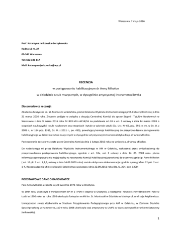 Warszawa, 7 maja 2016 Prof. Katarzyna Jankowska‐Borzykowska Radna 12 m. 27 00‐341 Warszawa Tel: 602 333 117 Mail: katarzyna‐[email protected] RECENZJA w postępowaniu habilitacyjnym dr Anny Mikolon w dziedzinie sztuk muzycznych, w dyscyplinie artystycznej instrumentalistyka Zleceniodawca recenzji: Akademia Muzyczna im. St. Moniuszki w Gdańsku, pismo Dziekana Wydziału Instrumentalnego prof. Elżbiety Rosińskiej z dnia 21 marca 2016 roku. Zlecenie podjęte w związku z decyzją Centralnej Komisji do spraw Stopni i Tytułów Naukowych w Warszawie z dnia 9 marca 2016 roku Nr BCK‐VII‐L‐6214/16 na podstawie art.18 a ust. 5 ustawy z dnia 14 marca 2003 o stopniach naukowych i tytule naukowym oraz stopniach i tytule w zakresie sztuki (Dz. Ust. Nr 65, poz. 595 ze zm. w Dz. U. z 2005 r., nr 164 poz. 1365, Dz. U. z 2011 r., po. 455), powołującą komisje habilitacyjną do przeprowadzenia postępowania habilitacyjnego w dziedzinie sztuk muzycznych w dyscyplinie artystycznej instrumentalistyka dla p. dr Anny Mikolon. Postepowanie zostało wszczęte przez Centralną Komisję dnia 1 lutego 2016 roku na wniosek p. dr Anny Mikolon. Do nadesłanego mi przez Dziekana Wydziału Instrumentalnego w AM w Gdańsku, wskazanej przez wnioskodawcę do przeprowadzenia postepowania habilitacyjnego, zgodnie z art. 18a, ust. 2 ustawy z dnia 14. 03. 2003 roku‐ pisma informującego o powołaniu mojej osoby na recenzenta Komisji Habilitacyjnej powołanej do oceny osiągnięć p. Anny Mikolon ( art. 16 pkt 2 ust. 1,2,3, ustawy z dnia 14.03.2003 roku) została dołączona dokumentacja zgodnie z paragrafem 12 pkt. 2 ust. 1‐4, Rozporządzenia Ministra Nauki i Szkolnictwa wyższego z dnia 22.09.2011 roku (Dz. U. 204, poz. 1200) PODSTAWOWE DANE O KANDYDATCE Pani Anna Mikolon urodziła się 23 kwietnia 1971 roku w Olsztynie. W 1984 roku ukończyła z wyróżnieniem SP nr 2 i PSM I stopnia w Olsztynie, a następnie‐ również z wyróżnieniem‐ PLM w Łodzi w 1990 roku. W roku 1995 ukończyła fortepian w AM im. St. Moniuszki w Gdańsku w klasie prof. Andrzeja Artykiewicza. Umiejętności swoje doskonaliła w Studium Przygotowania Pedagogicznego przy AM w Gdańsku, w Zentrale Deutche Sprachpruefung w Hanowerze, zaś w roku 2008 ukończyła staż artystyczny w UMFC w Warszawie pod kierunkiem Katarzyny Jankowskiej. 1 W roku 2011 otrzymała tytuł doktora, pisząc pracę „Język muzyczny Dymitra Szostakowicza jako forma osobistej wypowiedzi na przykładzie II Sonaty Fortepianowej h‐moll op. 61, II Trio Fortepianowego e‐moll op. 67, cyklu pieśni „ Z żydowskiej poezji ludowej” op. 79.” Zatrudniona była w szkołach muzycznych w Tczewie, Olsztynie, Gdańsku‐ Wrzeszczu, w Gdyni, zaś od 2006 roku jest związana z Akademią Muzyczną w Gdańsku, przez kilka lat na umowie‐zlecenie a od 2011 na stanowisku adiunkta. Od roku 1996 do roku 2007 była korepetytorem w Operze Bałtyckiej. Głównym nurtem Jej działalności, również w AM, jest praca ze śpiewakami. Współpracowała z wieloma wybitnymi śpiewakami podczas kursów mistrzowskich, warto wymienić choć kilku z nich‐ Paul Esswood, Charlotte Lehmann, Helena Łazarska, Jadwiga Rappe, Marek Rzepka czy Urszula Kryger. Była pianistą konkursowym m. in. podczas 7 edycji konkursu wokalnego Impresario Art oraz 2 edycji eliminacji do konkursu Belvedere. Pani Mikolon wykonała wiele koncertów z wybitnymi śpiewakami takimi jak Agnes Wolska, Krzysztof Bobrzecki czy Katarzyna Dondalska. Wykonała szereg koncertów monograficznych poświęconych np. Beethovenowi, Dvorakowi, Jabłońskiemu, Lutosławskiemu, Moniuszce, Ogińskiemu, Schubertowi, Schumannowi czy Szostakowiczowi. Ma na swoim koncie wiele prawykonań muzyki polskiej i nie tylko. Zainteresowała się również prezentacją muzyki Gospel. Z entuzjazmem podjęła się wykonania muzyki polskiej mniej znanej, np. Zygmunta Noskowskiego czy M. K. Ogińskiego. Jest autorką szeregu artykułów wydanych przez Uczelnię. Od momentu uzyskania doktoratu p. Anna Mikolon zagrała ok. 300 koncertów. Są to koncerty zarówno ze studentami jak i z artystami znanymi i uznanymi. Repertuar jaki wykonała jest iście imponujący, bowiem poza wymienionymi już kompozycjami i prawykonaniami obejmuje on trzon literatury kameralnej nie tylko wokalnej, również pojawiają się tria i sonaty instrumentalne oraz bardzo ciekawe pozycje kameralistyki z głosem. Ma na swoim koncie również spory repertuar solistyczny. Pani Mikolon oprócz kilku publikacji‐ w tym również wydania dysertacji doktorskiej‐ ma na swym koncie wygłoszenie referatów i wykładów na międzynarodowych i krajowych konferencjach tematycznych. Wykłady dotyczą zarówno poruszanych w doktoracie kwestii jak i zagadnień pedagogicznych. Niezwykle ciekawe wydają mi się dwa‐ „ Światosław Richter‐ cechy osobowości i styl pracy” oraz „ Muzyka kameralna w twórczości kompozytorów francuskich” Pani Anna Mikolon ma na swoim koncie wiele nagrań, w tym światowe premiery fonograficzne, jak pieśni R. Kłoczko, M.K. Ogińskiego, J. Bruzdowicz, pieśni kompozytorów gdańskich, utwory fortepianowe Z. Noskowskiego. Jej nagrania były również transmitowane przez Radio Gdańsk. Wydano 5 płyt CD z Jej udziałem: D. Szostakowicz‐ II Sonata Fortepianowa, Trio op. 67 oraz pieśni ”Z żydowskiej poezji ludowej”, ( Soliton 2011) Pieśni i arie, ( Soliton 2011) B. Britten‐ 31 pieśni, (AM w Gdańsku 2010) płytę „The Nightingale”( Acte Prealable 2013) oraz płytę „Shakespeare Songs”( Acte Prealable 2016). Brała udział w 8 przewodach artystycznych doktorskich i habilitacyjnych. Na potrzeby koncertów okolicznościowych dokonała również szeregu aranżacji utworów popularnych oraz Glorii A. Vivaldiego dostosowując skład wykonawców do możliwości i zapotrzebowania koncertowego. Jest autorką kilku wyciągów fortepianowych utworów wokalno‐ Instrumentalnych wydanych przez wydawnictwo Polihymnia. Posiada również s