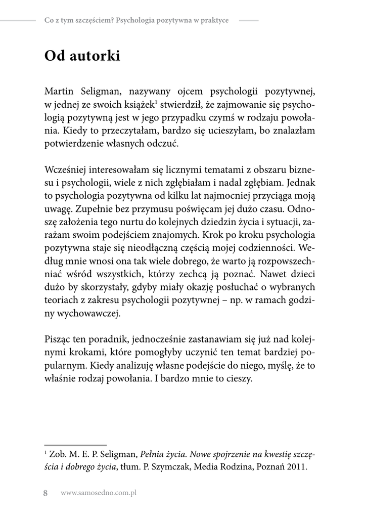 Co z tym szczęściem? Psychologia pozytywna w praktyce Od autorki Martin Seligman, nazywany ojcem psychologii pozytywnej, w jednej ze swoich książek1 stwierdził, że zajmowanie się psychologią pozytywną jest w jego przypadku czymś w rodzaju powołania. Kiedy to przeczytałam, bardzo się ucieszyłam, bo znalazłam potwierdzenie własnych odczuć. Wcześniej interesowałam się licznymi tematami z obszaru biznesu i psychologii, wiele z nich zgłębiałam i nadal zgłębiam. Jednak to psychologia pozytywna od kilku lat najmocniej przyciąga moją uwagę. Zupełnie bez przymusu poświęcam jej dużo czasu. Odnoszę założenia tego nurtu do kolejnych dziedzin życia i sytuacji, zarażam swoim podejściem znajomych. Krok po kroku psychologia pozytywna staje się nieodłączną częścią mojej codzienności. Według mnie wnosi ona tak wiele dobrego, że warto ją rozpowszechniać wśród wszystkich, którzy zechcą ją poznać. Nawet dzieci dużo by skorzystały, gdyby miały okazję posłuchać o wybranych teoriach z zakresu psychologii pozytywnej – np. w ramach godziny wychowawczej. Pisząc ten poradnik, jednocześnie zastanawiam się już nad kolejnymi krokami, które pomogłyby uczynić ten temat bardziej popularnym. Kiedy analizuję własne podejście do niego, myślę, że to właśnie rodzaj powołania. I bardzo mnie to cieszy. Zob. M. E. P. Seligman, Pełnia życia. Nowe spojrzenie na kwestię szczęścia i dobrego życia, tłum. P. Szymczak, Media Rodzina, Poznań 2011. 1 8 www.samosedno.com.pl Od autorki Czego możesz się spodziewać po przeczytaniu tej książki Tego, że codziennie będziesz uśmiechnięty i nigdy nie zagrozi ci zły humor? Raczej nie. W życiu każdego człowieka są lepsze i gorsze chwile. Największą sztuką jest to, aby w pełni doceniać te pozytywne, a z negatywnymi umieć sobie odpowiednio radzić – podchodzić do nich tak, żeby zbyt długo nie rzutowały na codzienne życie. Tego, że wszyscy będą cię uwielbiać i uważać za najwspanialszą osobę na świecie? Na pewno nie wszyscy, ale dowiesz się wiele o znaczeniu relacji międzyludzkich i o tym, co wpływa na budowanie takich związków, które ci służą. Nauczysz się też bardziej doceniać i wzmacniać już istniejące relacje. Tego, że zrozumiesz, co może wpłynąć na podwyższenie poziomu szczęścia i zadowolenia z życia? Z pewnością tak. Ale dowiesz się także, iż zbyt łapczywe dążenie do nieustającej ekscytacji i przyjemności to niekoniecznie najlepsza droga. Poczucie zadowolenia z życia pomagają budować również inne elementy; przyjemność jest tylko jednym z nich, czasami przesadnie gloryfikowanym. Tego, że staniesz się człowiekiem sukcesu? Tak, to możliwe. Niewykluczone jednak, że podczas lektury na nowo zastanowisz się nad tym, jaki rodzaj sukcesu jest ci najbardziej potrzebny i wniesie najwięcej dobrego do twojego życia. Tym sukcesem wcale nie musi być posiadanie nowego ferrari – możesz wybrać coś zupełnie innego. 9 Co z tym szczęściem? Psychologia pozytywna w praktyce Tego, że będziesz się czuć znacznie lepiej z samym sobą i swoim życiem? Tak, zdecydowanie tak. Misją psychologii pozytywnej jest bowiem szukanie rozwiązań i podpowiedzi, które pomagają ludziom rozkwitać i wzrastać. Tego właśnie ci życzę. 10 www.samosedno.com.pl Rozdział 1 Czym jest, a czym nie jest psychologia pozytywna Z tego rozdziału dowiesz się: dlaczego psychologia pozytywna przydaje się na co dzień; po co powstała i jakie były jej początki; czym psychologia pozytywna różni się od pozytywnego myślenia; jakie zalety i wady mają inne podejścia do budowania zadowolenia z życia; jakie mity i teorie związane z „poprawianiem życia” warto obalić. Co z tym szczęściem? Psychologia pozytywna w praktyce Codzienność i poszukiwanie jej najlepszej wersji Kiedy ludzie składają sobie życzenia z jakiejkolwiek okazji, najczęściej używają zwrotów typu „Zdrowia, szczęścia, spełnienia marzeń!”. To znaczące, że większość z nas dąży do życia szczęśliwego, choć oczywiście jego wizja może być bardzo różna. Wielcy myśliciele od tysiącleci zastanawiają się nad tym, czym jest szczęście i co mu sprzyja. Niezależnie od miejsca czy czasu urodzenia człowiek pyta siebie i innych, jak wieść szczęśliwe, dobre życie. Jeśli więc czytasz tę książkę, nie należysz do wyjątków – wszyscy pragną, aby codzienność była źródłem satysfakcji, a nie męki. Czasami ktoś bardzo chce, by tak się właśnie działo, lecz nie wie, jak do tego doprowadzić i co oznacza „dobre życie”. Życie każdego z nas składa się z chwil lepszych i gorszych. Nierealne jest zakładanie, że można liczyć na same pozytywne zdarzenia. Czasami coś idzie zdecydowanie nie po naszej myśli. Spotykamy ludzi, których lubimy, i takich, których lubimy nieco mniej lub nie lubimy wcale. To nieuniknione, nawet święci czy oświeceni znani w różnych religiach mierzyli się czasami z cierpieniem. Z pewnością jednak zanurzanie się w cierpieniu na zbyt długi czas czy też gloryfikowanie go na siłę – zwłaszcza wtedy, gdy można coś zmienić – nie wydaje się czymś, w czym warto trwać bezczynnie. Warto dążyć do poczucia spełnienia, zadowolenia i sensu istnienia. Nauczyć się takiego podejścia, które pozwala cieszyć się życiem, a nie mozolnie brnąć przez kolejne dni, bez światełka w tunelu trudności. Optymizm, poczucie nadziei i dobrego życia, przynoszącego wiele szczęśliwych chwil – to odwieczne ludzkie 12 www.samosedno.com.pl Rozdział 1. Czym jest, a czym nie jest psychologia pozytywna dążenia. Co więcej, każda osoba ma prawo kształtować swoje życie w taki sposób. Dobrą wiadomością jest to, że masz duży wpływ na własny dobrostan. Jakie uwarunkowania i czynniki przeszkadzają w szczęśliwym życiu? Bywają one bardzo indywidualne, warto jednak przeanalizować te najczęściej spotyk