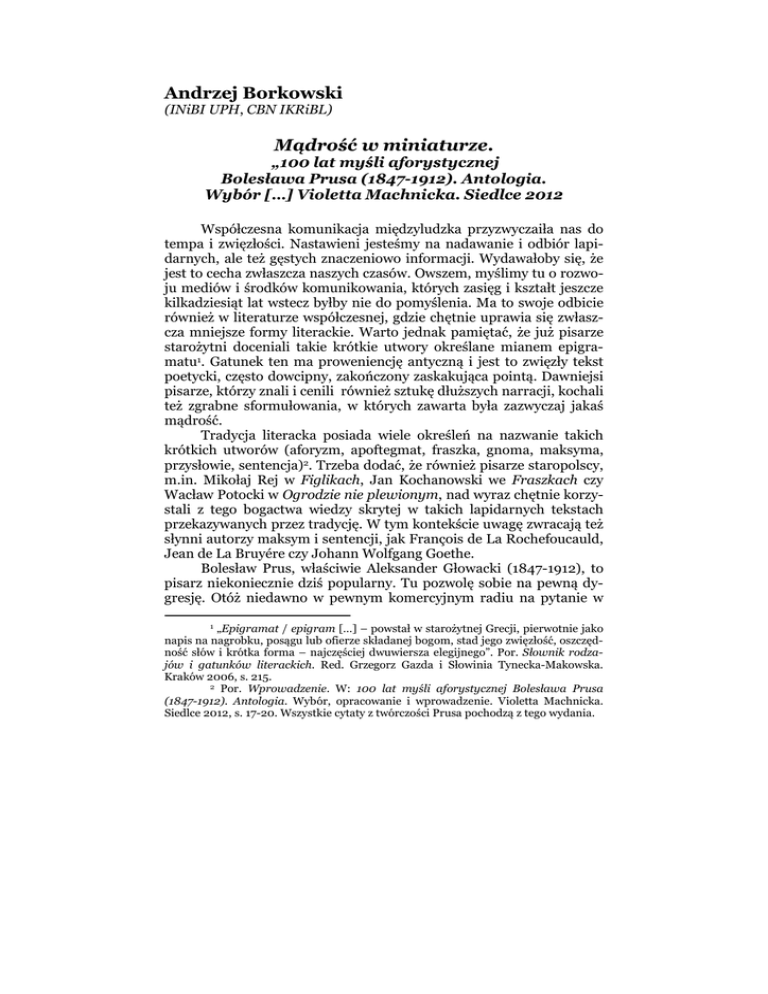 Andrzej Borkowski (INiBI UPH, CBN IKRiBL) Mądrość w miniaturze. „100 lat myśli aforystycznej Bolesława Prusa (1847-1912). Antologia. Wybór […] Violetta Machnicka. Siedlce 2012 Współczesna komunikacja międzyludzka przyzwyczaiła nas do tempa i zwięzłości. Nastawieni jesteśmy na nadawanie i odbiór lapidarnych, ale też gęstych znaczeniowo informacji. Wydawałoby się, że jest to cecha zwłaszcza naszych czasów. Owszem, myślimy tu o rozwoju mediów i środków komunikowania, których zasięg i kształt jeszcze kilkadziesiąt lat wstecz byłby nie do pomyślenia. Ma to swoje odbicie również w literaturze współczesnej, gdzie chętnie uprawia się zwłaszcza mniejsze formy literackie. Warto jednak pamiętać, że już pisarze starożytni doceniali takie krótkie utwory określane mianem epigramatu1. Gatunek ten ma proweniencję antyczną i jest to zwięzły tekst poetycki, często dowcipny, zakończony zaskakująca pointą. Dawniejsi pisarze, którzy znali i cenili również sztukę dłuższych narracji, kochali też zgrabne sformułowania, w których zawarta była zazwyczaj jakaś mądrość. Tradycja literacka posiada wiele określeń na nazwanie takich krótkich utworów (aforyzm, apoftegmat, fraszka, gnoma, maksyma, przysłowie, sentencja)2. Trzeba dodać, że również pisarze staropolscy, m.in. Mikołaj Rej w Figlikach, Jan Kochanowski we Fraszkach czy Wacław Potocki w Ogrodzie nie plewionym, nad wyraz chętnie korzystali z tego bogactwa wiedzy skrytej w takich lapidarnych tekstach przekazywanych przez tradycję. W tym kontekście uwagę zwracają też słynni autorzy maksym i sentencji, jak François de La Rochefoucauld, Jean de La Bruyére czy Johann Wolfgang Goethe. Bolesław Prus, właściwie Aleksander Głowacki (1847-1912), to pisarz niekoniecznie dziś popularny. Tu pozwolę sobie na pewną dygresję. Otóż niedawno w pewnym komercyjnym radiu na pytanie w 1 „Epigramat / epigram […] – powstał w starożytnej Grecji, pierwotnie jako napis na nagrobku, posągu lub ofierze składanej bogom, stad jego zwięzłość, oszczędność słów i krótka forma – najczęściej dwuwiersza elegijnego”. Por. Słownik rodzajów i gatunków literackich. Red. Grzegorz Gazda i Słowinia Tynecka-Makowska. Kraków 2006, s. 215. 2 Por. Wprowadzenie. W: 100 lat myśli aforystycznej Bolesława Prusa (1847-1912). Antologia. Wybór, opracowanie i wprowadzenie. Violetta Machnicka. Siedlce 2012, s. 17-20. Wszystkie cytaty z twórczości Prusa pochodzą z tego wydania. konkursie, kto kryje się pod pseudonimem Bolesław Prus, pewien słuchacz nie potrafił udzielić właściwej odpowiedzi. Jednak nie to było zaskakujące, mógł na przykład zapomnieć, a wypowiedź prezentera radiowego, który podpowiadał, że był to… Janusz Głowacki – współczesny dramaturg3. Bolesław Prus (Prus to nazwa herbu szlacheckiego), to znakomity polski pisarz i dziennikarz, który zasłynął zwłaszcza z dużych powieści (m.in. Faraon, Lalka, Emancypantki), znany jest też z krótszych form prozatorskich, nowel, jak chociażby Kamizelka czy Antek. Warto jednak pamiętać, że autor ten szczególnie upodobał sobie właśnie zwięzłe aforyzmy, sentencje, powiedzenia, które często pojawiały się w jego rozmaitej gatunkowo twórczości. Poznając Prusa należy pamiętać też o jego biografii. Był to pisarz związany zwłaszcza z Warszawą, choć miał też swój epizod podlaski4, bowiem przebywał krótko w Siedlcach (jego brat był tu nauczycielem) oraz brał czynny udział w powstaniu styczniowym na Podlasiu. Zwięzłe „myśli” autora Faraona wyłowiła z jego bogatej twórczości badaczka z Uniwersytetu Przyrodniczo-Humanistycznego w Siedlcach dr hab. Violetta Machnicka. Teksty, które weszły w skład antologii zostały podzielone według klucza problemowego, np. I. Natura, prawa rządzące światem, życiem i ludźmi; VII. Czas, przemijanie, śmierć; XVI. Wojna, walka, wolność. Taka konstrukcja całości ułatwia lekturę, jak też unaocznia niezwykle szerokie horyzonty intelektualne naszego autora. Prus to niewątpliwie tytan pracy, pisarz, dziennikarz, społecznik. Stąd też nie dziwi, że jego twórczość nasycona jest różnymi hasłami, które odsyłają do wykonywanych na co dzień czynności, pokazując zarazem ich wartość. W Lalce zapisał: „Pod wpływem pracy w sercu budzi się otucha” (s. 129). Oznacza to, że podejmowanie wysiłku nie tylko służy zabezpieczeniu sobie egzystencji czy staje się motywacją do ogólnego rozwoju, ale najpierw ma podstawową wartość humanistyczną. Warto bowiem pracować, owszem również dla niezbędnych w życiu pieniędzy, ale też dla samego siebie. W ujęciu tego autora „[…] praca potężna i jak najrozmaitsza, praca własnoręczna a inteligentna, czyni człowieka zdrowym, silnym, zdolnym i szlachetnym” (s. 131). Ponadto czynności zawodowe doskonalą człowieka moralnie: „Człowiek musi mieć troski i pracę jak chleb i wodę; marnieje zaś wśród ciągłych rozrywek, jak zmarniałby, karmiąc się wyłącznie cukierkami” 3 Na marginesie trzeba podkreślić, że zastanawiająca jest rażąca niekiedy nieznajomość literatury polskiej i europejskiej wśród młodszego pokolenia dziennikarzy czy też tzw. „celebrytów”. 4 Por. też zapiski z „Kuriera Niedzielnego” 1864, nr 4 (10 stycznia), s. 3. 54 (s. 130). Wizja życia ludzkiego jest u pisarza racjonalnai wyrasta z obserwacji natury. Szczęście człowieka uwidacznia się wówczas, gdy w życiu występują określone proporcje między troską i dostatkiem. Kiedy ta równowaga zostaje zburzona, wówczas człowiek jest nieszczęśliwy, wyniszczony kłopotami czy zużyty nadmierną zabawą. Prus zdecydowanie podkreśla, że „Próżniactwo i nadmierne wydatki psują człowieka” (s. 129). Sporo uwag w swej twórczości autor Kamizelki poświęcił zagadnieniu mądrości oraz jej przeciwieństwu – głupocie. Prus posługuje się tu niekiedy 