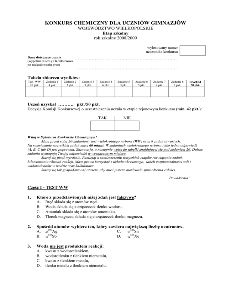 KONKURS CHEMICZNY DLA UCZNIÓW GIMNAZJÓW WOJEWÓDZTWO WIELKOPOLSKIE Etap szkolny rok szkolny 2008/2009 wylosowany numer uczestnika konkursu Dane dotyczące ucznia (wypełnia Komisja Konkursowa po rozkodowaniu prac) ……………………………………………………….. ……………………………………………………….. Tabela zbiorcza wyników: Test WW 20 pkt. Zadanie 1 4 pkt. Zadanie 2 3 pkt. Zadanie 3 3 pkt. Zadanie 4 6 pkt. Zadanie 5 3 pkt. Zadanie 6 5 pkt. Zadanie 7 4 pkt. Zadanie 8 2 pkt. RAZEM 50 pkt. Uczeń uzyskał ………. pkt./50 pkt. Decyzja Komisji Konkursowej o uczestniczeniu ucznia w etapie rejonowym konkursu (min. 42 pkt.): TAK NIE Witaj w Szkolnym Konkursie Chemicznym! Masz przed sobą 20-zadaniowy test wielokrotnego wyboru (WW) oraz 8 zadań otwartych. Na rozwiązanie wszystkich zadań masz 60 minut. W zadaniach wielokrotnego wyboru tylko jedna odpowiedź (A, B, C lub D) jest poprawna. Zaznacz ją, a następnie wpisz do tabelki znajdującej się pod zadaniem 20. Dalsze zadania wymagają Twojej odpowiedzi w wyznaczonym miejscu. Staraj się pisać wyraźnie. Pamiętaj o zamieszczeniu wszystkich etapów rozwiązania zadań, bilansowaniu równań reakcji. Masz prawo korzystać z układu okresowego, tabeli rozpuszczalności soli i wodorotlenków w wodzie oraz kalkulatora. Staraj się tak gospodarować czasem, aby mieć jeszcze moŜliwość sprawdzenia całości. Powodzenia! Część I - TEST WW 1. Które z przedstawionych niŜej zdań jest fałszywe? A. B. C. D. 2. Spośród atomów wybierz ten, który zawiera największą liczbę neutronów. A. B. 3. Rtęć składa się z atomów rtęci. Woda składa się z cząsteczek tlenku wodoru. Amoniak składa się z atomów amoniaku. Tlenek magnezu składa się z cząsteczek tlenku magnezu. 109 47 Ag 123 51 Sb Woda nie jest produktem reakcji: A. B. C. D. kwasu z wodorotlenkiem, wodorotlenku z tlenkiem niemetalu, kwasu z tlenkiem metalu, tlenku metalu z tlenkiem niemetalu. C. D. 124 50 Sn 126 54 Xe 4. Uczeń wymienił róŜne przykłady mieszanin: I – powietrze, II – ocet, III – woda z piaskiem, IV – Ŝelazo z siarką. Mieszaniny jednorodne to: A. B. 5. Azot Tlen C. D. Wodór Tlenek węgla(IV) 10 razy 12 razy C. D. 14 razy 16 razy Które z przedstawionych niŜej zdań jest fałszywe? A. B. C. D. 8. tylko II III i IV Ile razy masa balonu o objętości 10dm3 wypełnionego tlenem jest większa od masy takiego samego balonu wypełnionego wodorem? Gęstość tlenu – 1,43g/dm3, a wodoru – 0,089g/dm3. A. B. 7. C. D. Który gaz zmieszany z powietrzem tworzy mieszaninę wybuchową? A. B. 6. tylko I I i II KaŜdy atom posiada taką samą liczbę protonów i neutronów. Bezpośredni wpływ na masę atomu ma liczba protonów i neutronów. Elektrony walencyjne to te, które znajdują się najdalej jądra atomowego. Liczba elektronów walencyjnych ma wpływ na wartościowość pierwiastka. Nauczyciel wykonał doświadczenie, które ilustruje rysunek: Ca I K II Na Mg III IV woda + fenoloftaleina Który metal przereagował najszybciej? A. B. 9. C. D. Ca Mg Która z wymienionych niŜej par substancji nie reaguje ze sobą? A. B. 10. K Na K2O i H2O Ba i H2O C. D. CaO i CO2 CaO i S Oto równanie reakcji Ŝelaza z parą wodną: …Fe + …H2O …Fe3O4 + …H2 Jakie kolejne współczynniki stechiometryczne powinny wystąpić w tym równaniu? A. B. 3, 1, 1, 4 2, 3, 1, 3 C. D. 3, 4, 1, 4 3, 2, 1, 2 11. Oto schemat przedstawiający zachodzące procesy chemiczne. Li X Li2O Y LiOH Z Jakie reagenty kryją się pod literami X, Y, Z? A. B. C. D. 12. C. D. Skraplanie i topnienie Parowanie i skraplanie podgrzać roztwór, przesączyć roztwór, C. D. dolać odpowiednią ilość wody, dosypać odpowiednią ilość soli. Cr2O3 Cu2O C. D. FeO Fe2O3 CuCl2 i Na2S CuSO4 i H2S C. D. Cu(NO3)2 i K2S Odpowiedzi A, B, C są poprawne. syntezy, Analizy C. D. Wymiany utlenienia i redukcji Kwas krzemowy to substancja galaretowata, praktycznie nierozpuszczalna w wodzie. Który zestaw substratów pozwala otrzymać ten kwas? A. B. 19. Parowanie i krystalizację Sublimację i resublimację Proces otrzymywania wapna gaszonego z wapna palonego jest przykładem reakcji: A. B. 18. Z = 4 i Z = 12 Wszystkie wymienione Słabo rozpuszczalną sól CuS moŜna otrzymać mieszając roztwory: A. B. 17. C. D. W tlenku pewnego metalu stosunek masowy pierwiastków wynosi 8 : 1. Tlenkiem tym jest: A. B. 16. Z = 4 i Z = 10 Z = 10 i Z = 12 Aby z roztworu soli o stęŜeniu 20% uzyskać roztwór o stęŜeniu 5% naleŜy: A. B. 15. Z H2 H2O H2O H2O Jakie przemiany fizyczne wykorzystuje się w procesie destylacji wody? A. B. 14. Y H2O H2O H2O O2 Które z pierwiastków o liczbach atomowych: Z = 4, Z = 10, Z = 12 wykazują podobne właściwości chemiczne? A. B. 13. X O2 O2 H2O H2 SiO2 + H2O Na2SiO3 + HCl C. D. SiO2 + NaOH Na2SiO3 i CaCl2 W nauce o minerałach często stosuje się wzory tlenkowe soli, np.: Al2(CO3)3 = Al2O3 · 3CO2 = Al2C3O9 Który z napisanych niŜej wzorów tlenkowych dotyczy azbestu Mg3H4Si2O9? A. B. MgO · SiO2 · H2O MgO · 2SiO2 · 2H2O C. D. 3MgO · 2SiO2 · H2O 3MgO · 2SiO2 · 2H2O 20. W probówce znajduje się roztwór nieznanej soli. Aby ją zidentyfikować wykonano dwie próby: I – po dodaniu roztworu NaOH wytrącił się niebieski, galaretowaty osad, II – po dodaniu roztworu AgNO3 wytrącił się biały, serowaty osad, ciemniejący pod wpływem światła. Tą solą jest: A. B. CuCl2 CuSO4 C. D. MgCl2 BaCl2 Wpisz do tabeli wybrane przez Ciebie odpowiedzi: 1. 2. 3. 4. 5. 6. 7. 8. 9. 10. 11. 12. 13. 14. 15. 16. 17. 18. 19. 20. Część II – ZADANIA OTWARTE ZADANIE 1 (4 pkt.) Przyporządkuj podanym określeniom A, B, C, D symbole odpowiednich pierwiastków. Wybierz te pierwiastki ze zbioru: lit, krzem, magnez, chlor, glin, jod. A. Znajduje się w piątym okresie: ………………… B. Zawiera 3 elektrony walencyjne: ………………….. C. Zawiera 3 protony: …………………. D. Znajduje się w drugiej grupie: ………………
